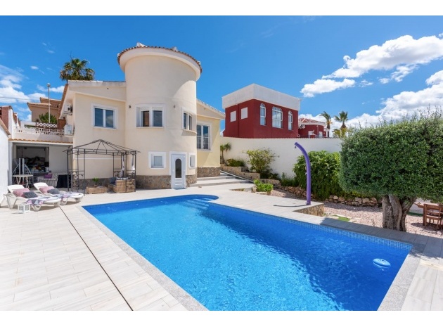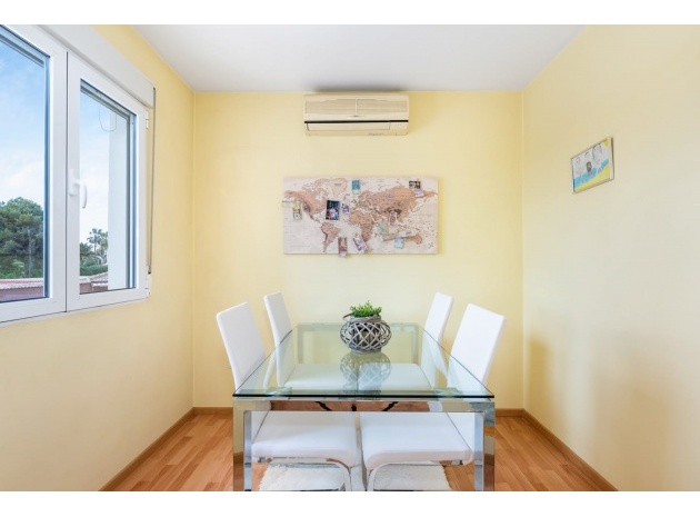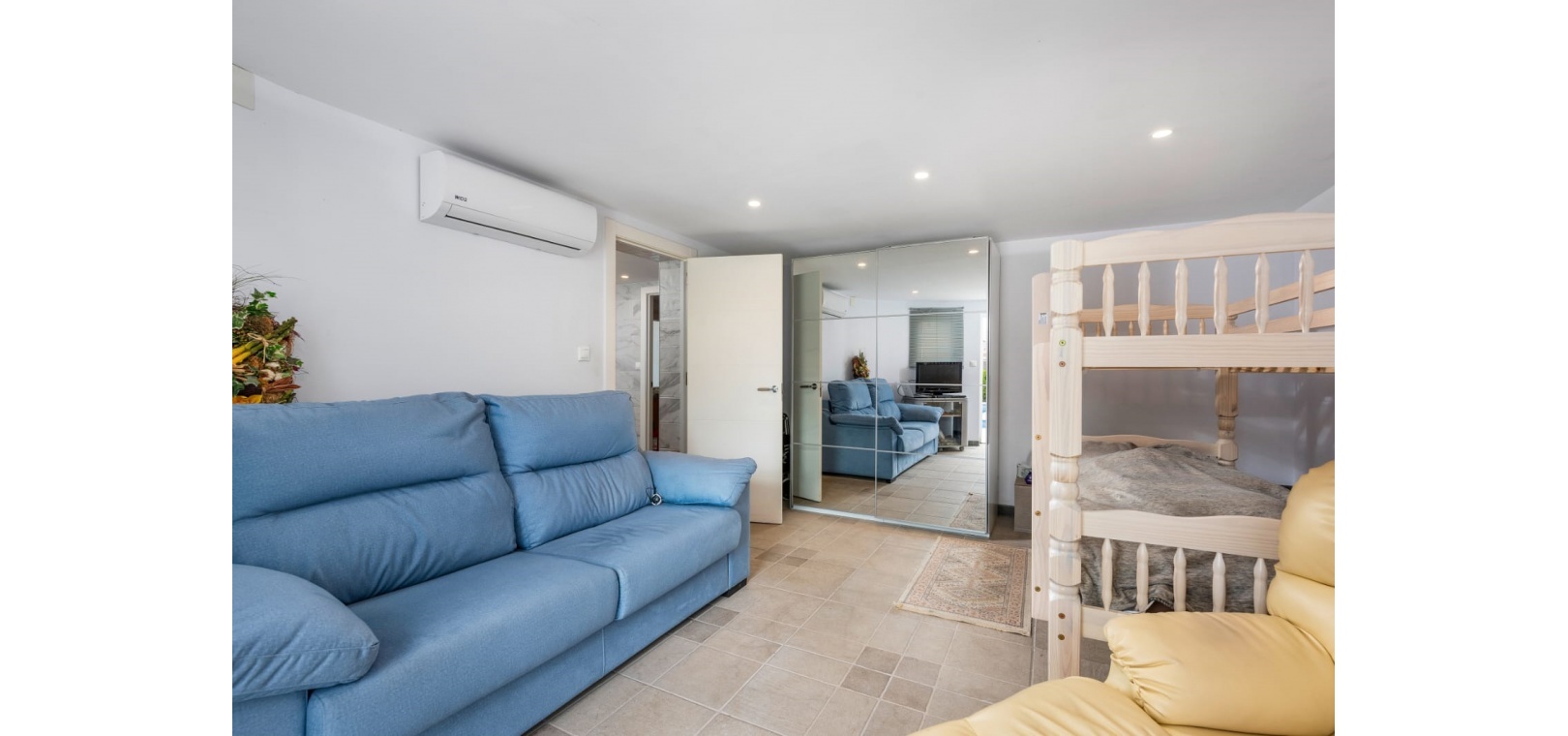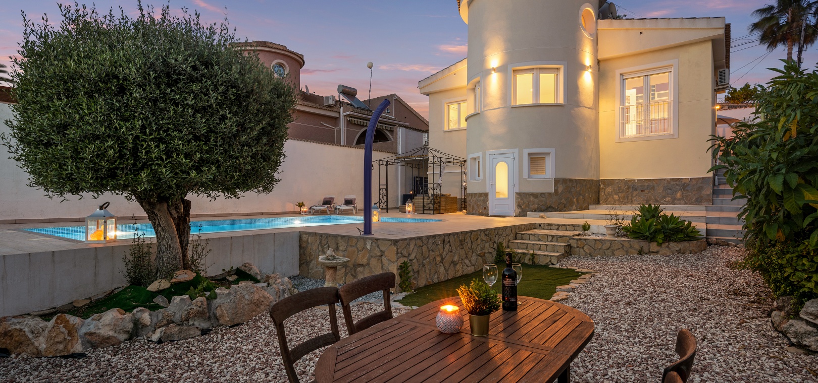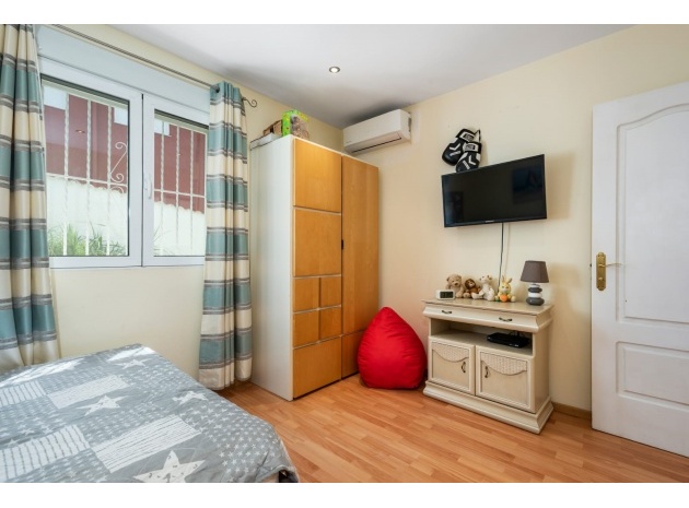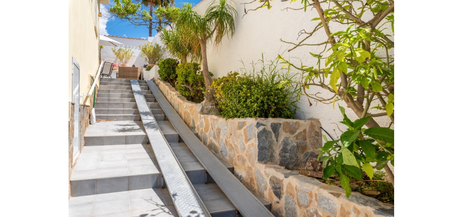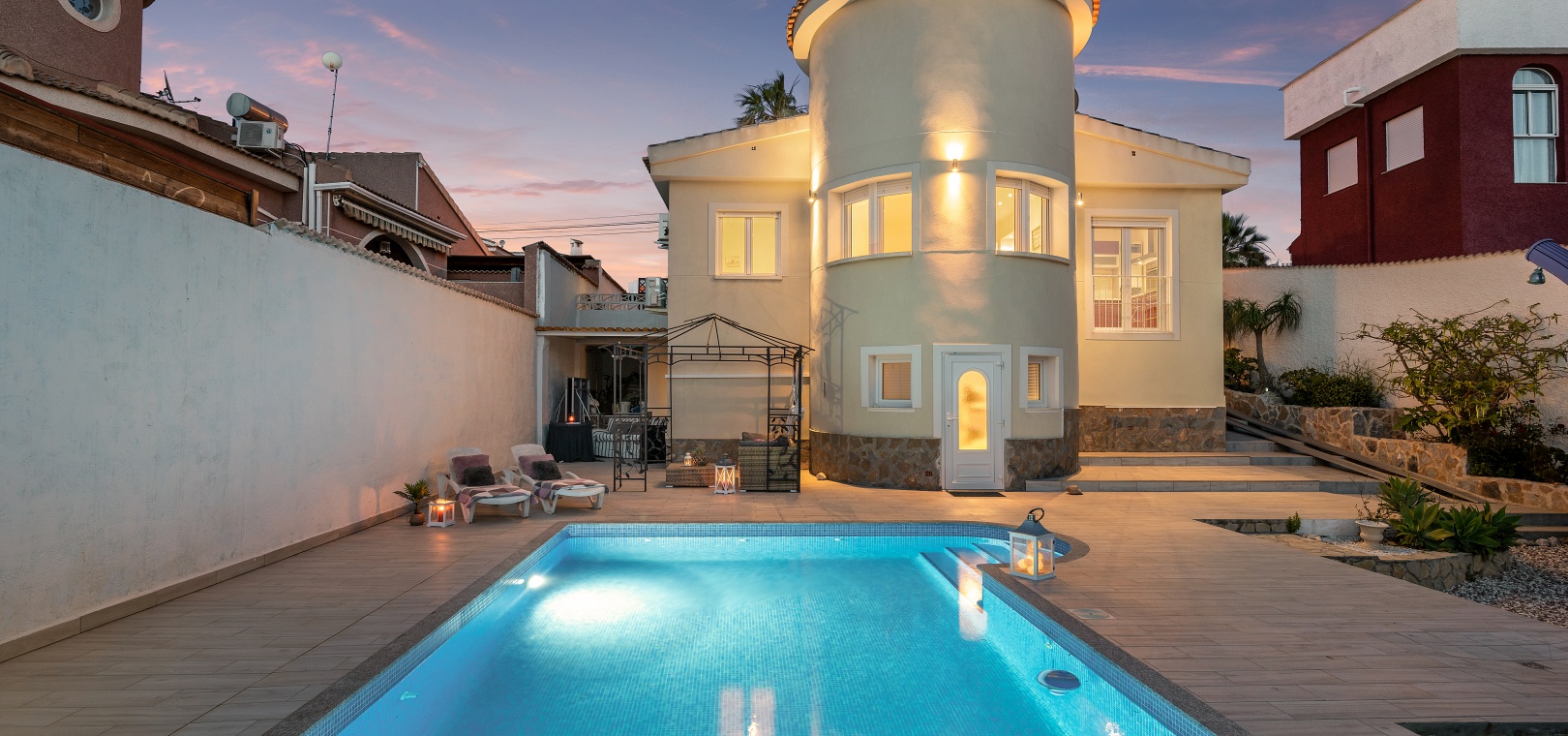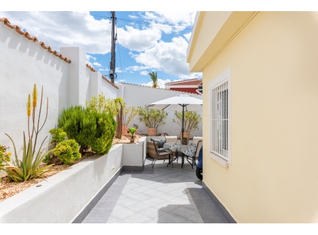 The villa is distributed over two levels. The main house is on the upper level and consists of two double bedrooms and one single sleeping alcove. The master bedroom has a large en-suite bathroom and this floor also has a shared bathroom. The main level also consists of an entrance area, a living room, a dining room and a kitchen.In the semi-basement you can find a flat with separate entrance, consisting of a living room with sleeping space, kitchen and a bathroom.The house has new doors, portholes, double glazed windows, new kitchen and the main floor has a beautiful wooden floor. It has air conditioning throughout.Outdoor areaThe house is located on a plot of 500 m2 with south-east orientation. In the garden you can find a beautiful swimming pool with outdoor shower. The area around the pool is tiled and is perfect for outdoor lounging areas and sun loungers. Next to the entrance there is also a seating area and an off road parking space.The rest of the garden is laid to gravel, also with space for outdoor seating areas.AreaThe villa is located in Ciudad Quesada, within walking distance to the main street and all its amenities.