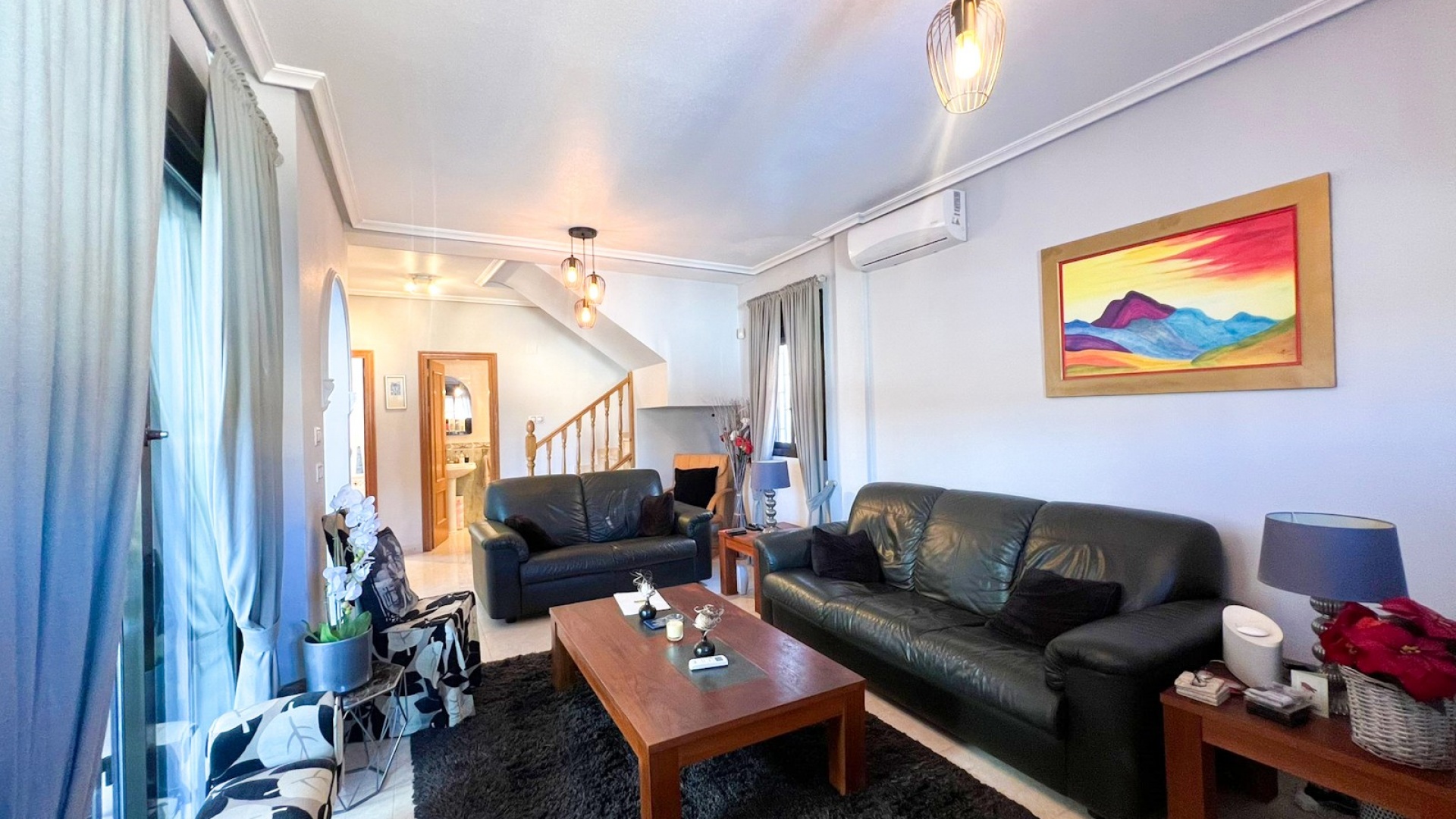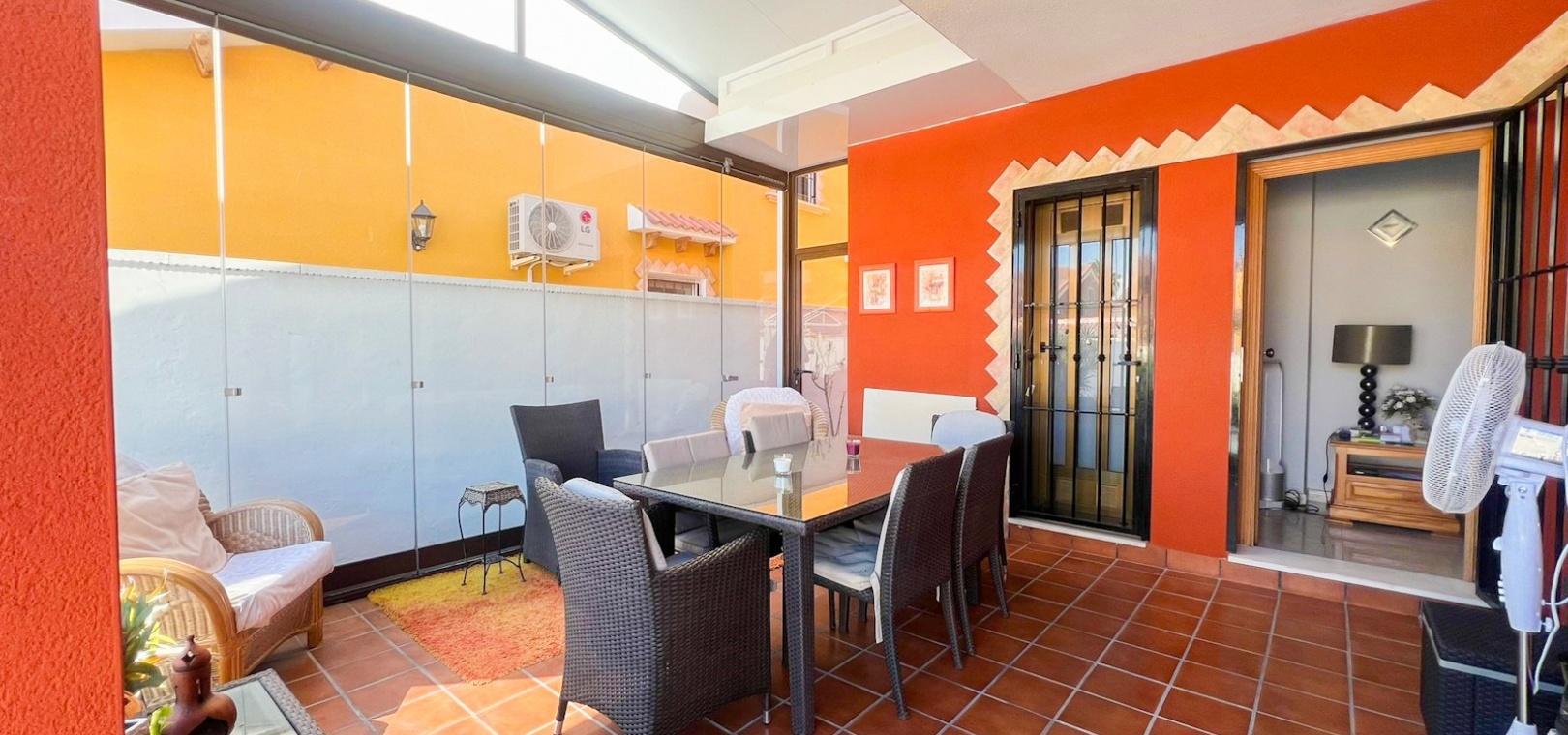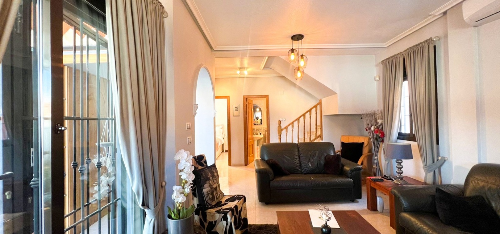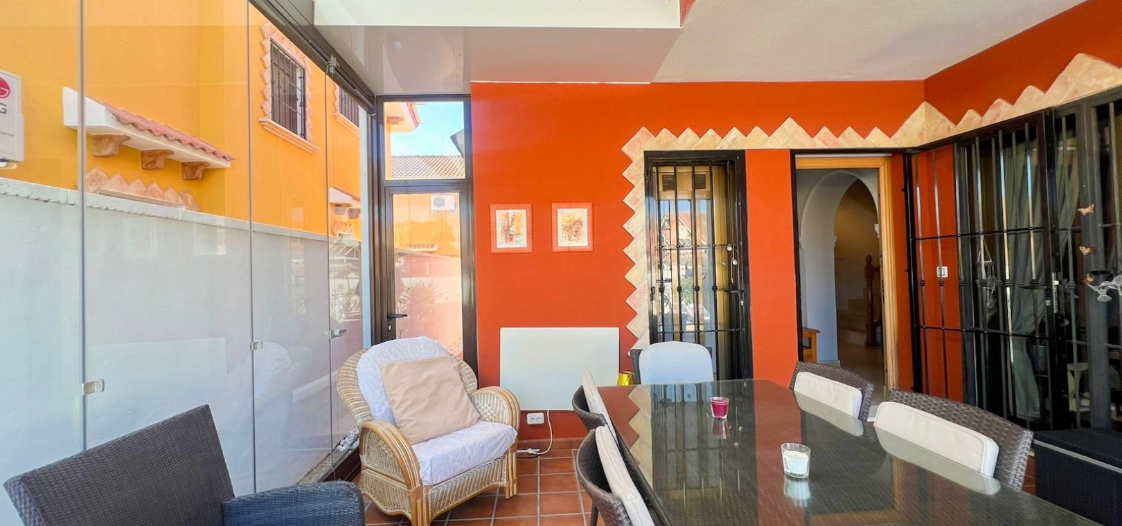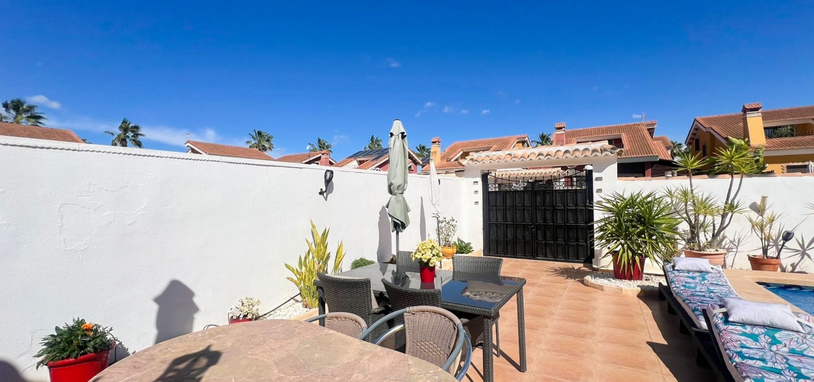 we are pleased to present you this superb 3 bedroom 3 bathroom villa with private pool and communal pool with a car portAs you enter the garden you will find a private swimming pool which faces the villa and there is also some rear garden space to enjoy the sunOn entering the property there is a glazed balcony leading to the living room, on the main floor there is a separate kitchen with a double bedroom with fitted wardrobes and en suite with bathtub and another spare bathroom On the upper floor there are two double bedrooms and a bathroom with a terraceExtras to this property is, it comes fully furnished and has air conditioning units in all rooms