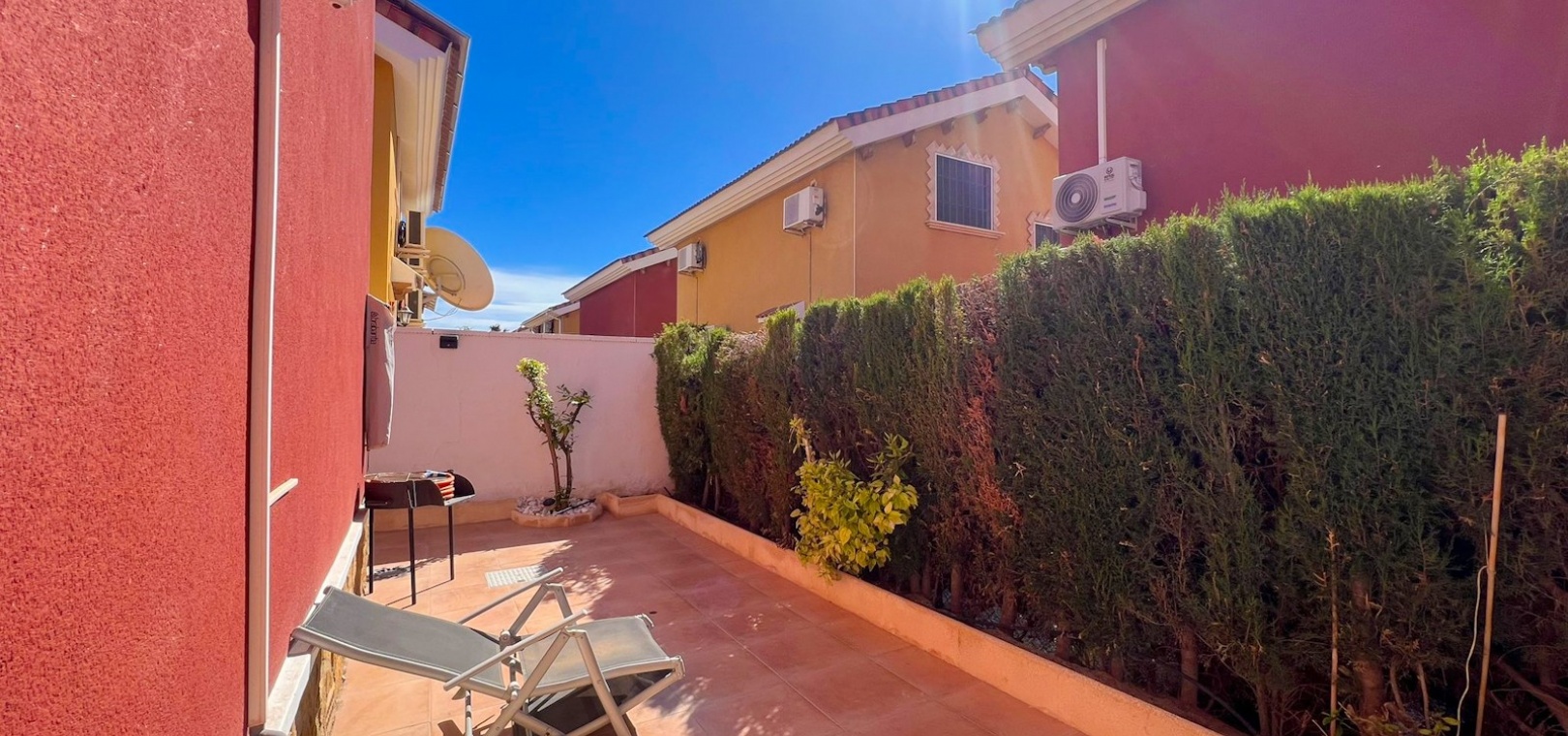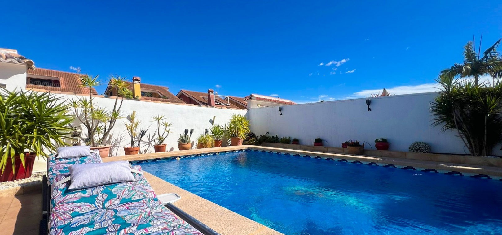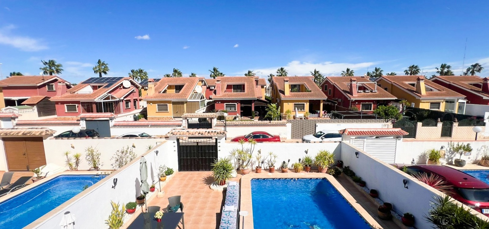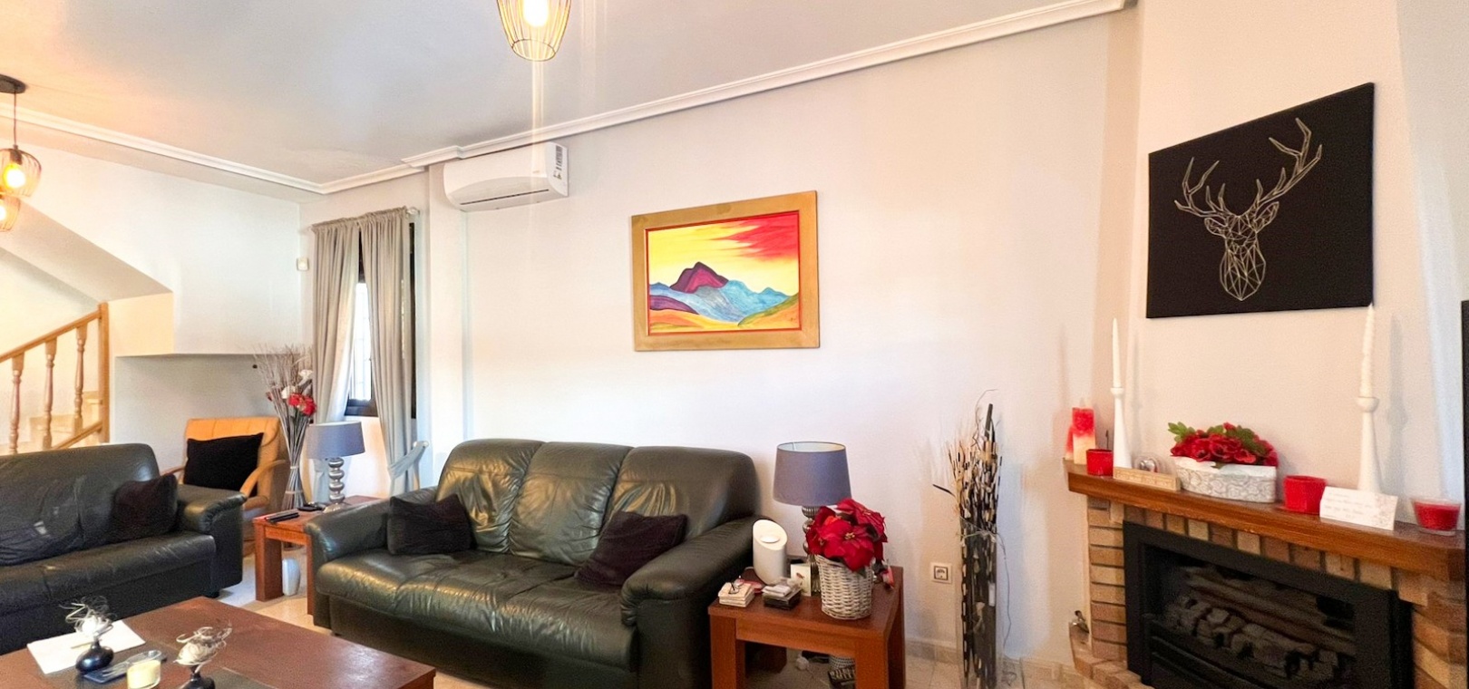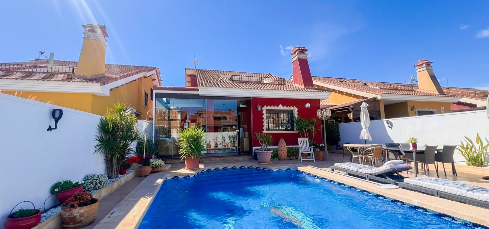 we are pleased to present you this superb 3 bedroom 3 bathroom villa with private pool and communal pool with a car portAs you enter the garden you will find a private swimming pool which faces the villa and there is also some rear garden space to enjoy the sunOn entering the property there is a glazed balcony leading to the living room, on the main floor there is a separate kitchen with a double bedroom with fitted wardrobes and en suite with bathtub and another spare bathroom On the upper floor there are two double bedrooms and a bathroom with a terraceExtras to this property is, it comes fully furnished and has air conditioning units in all rooms