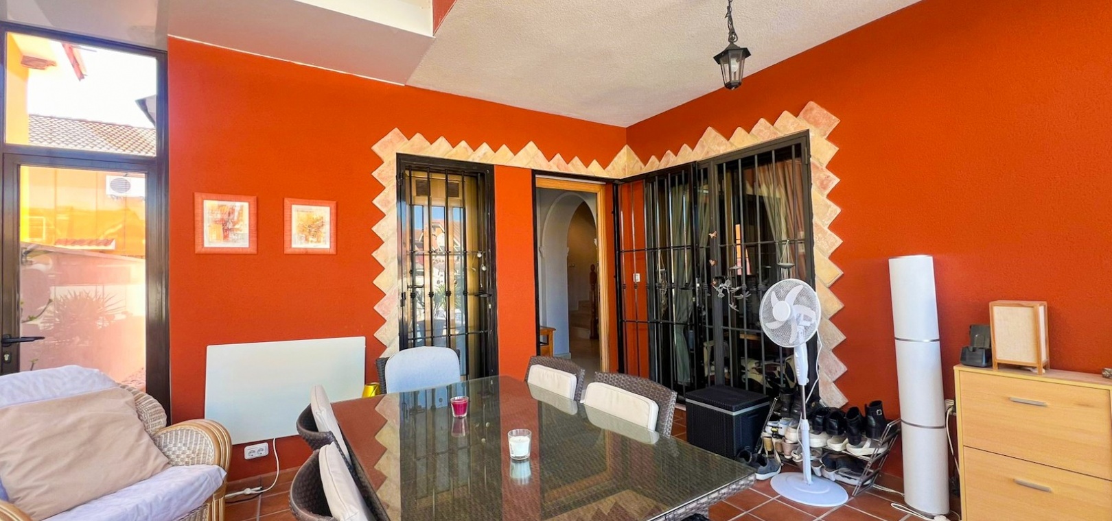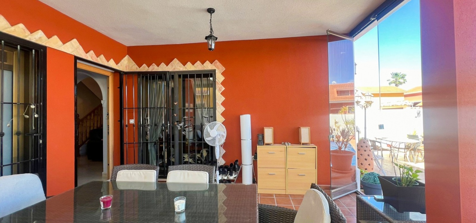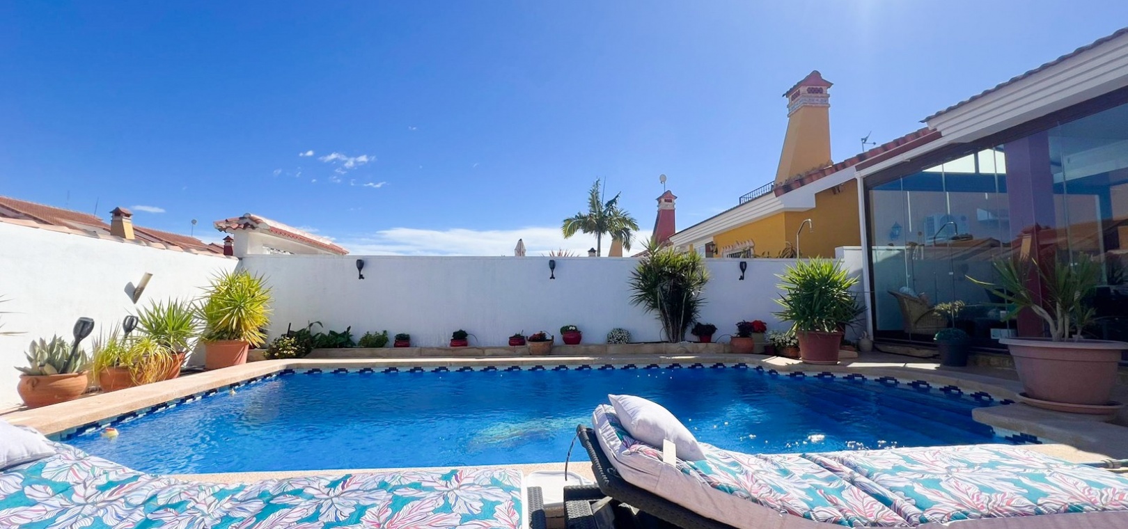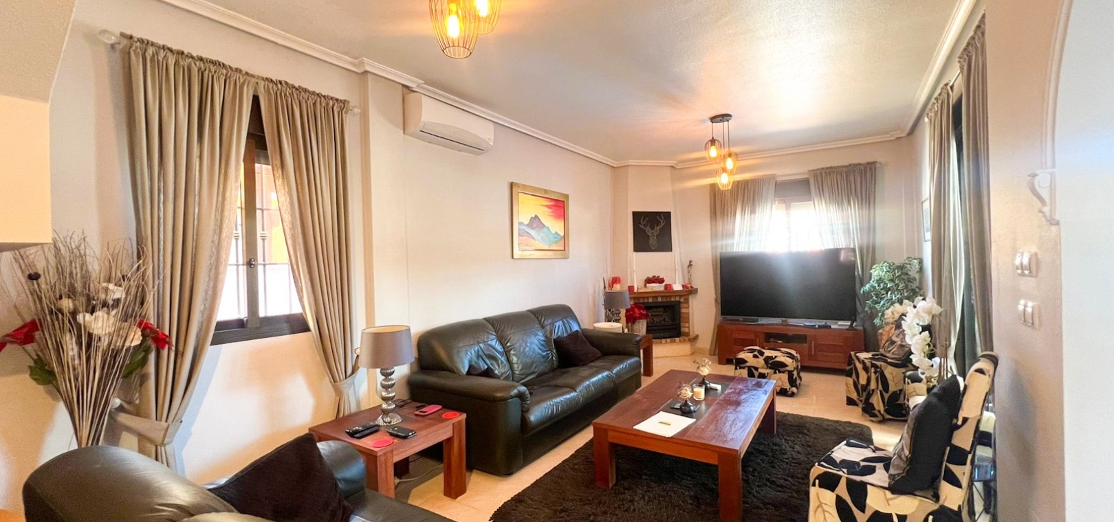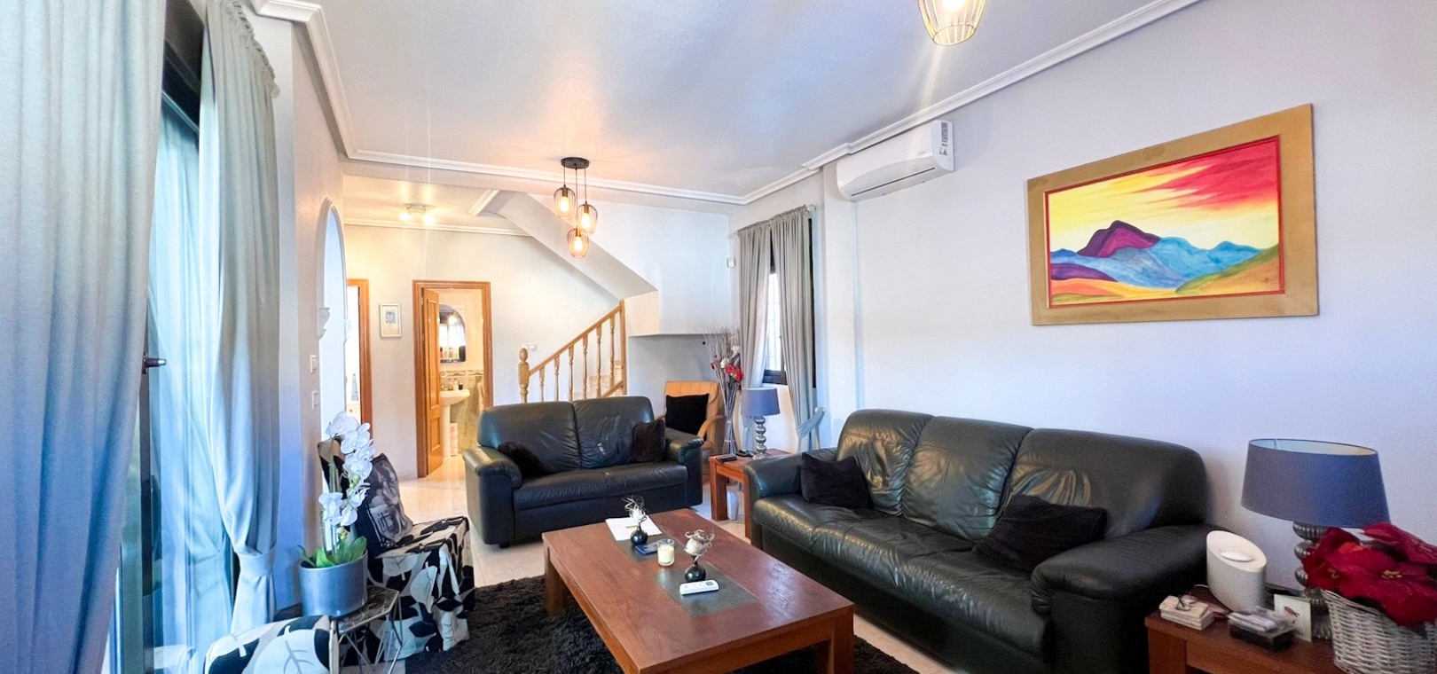 we are pleased to present you this superb 3 bedroom 3 bathroom villa with private pool and communal pool with a car portAs you enter the garden you will find a private swimming pool which faces the villa and there is also some rear garden space to enjoy the sunOn entering the property there is a glazed balcony leading to the living room, on the main floor there is a separate kitchen with a double bedroom with fitted wardrobes and en suite with bathtub and another spare bathroom On the upper floor there are two double bedrooms and a bathroom with a terraceExtras to this property is, it comes fully furnished and has air conditioning units in all rooms