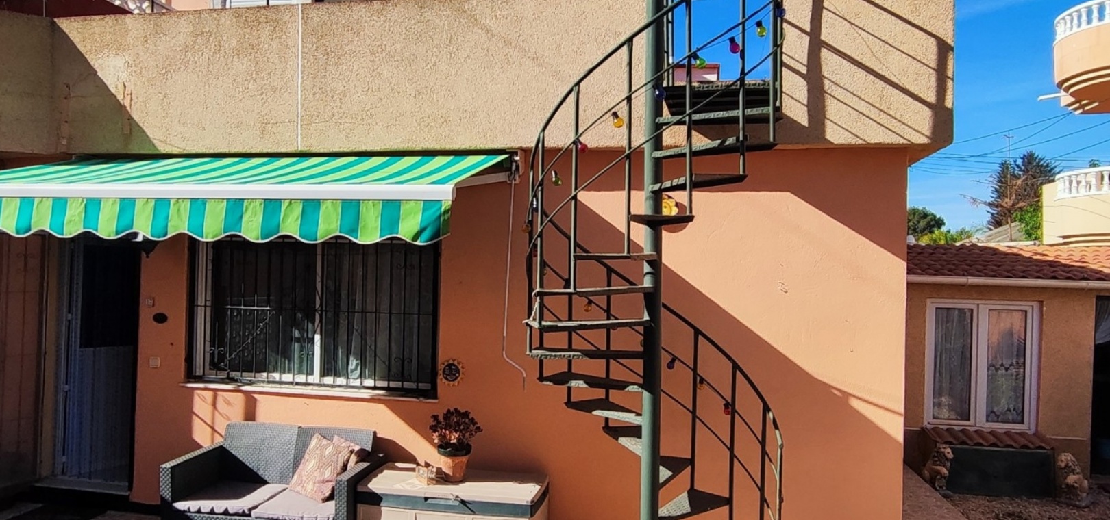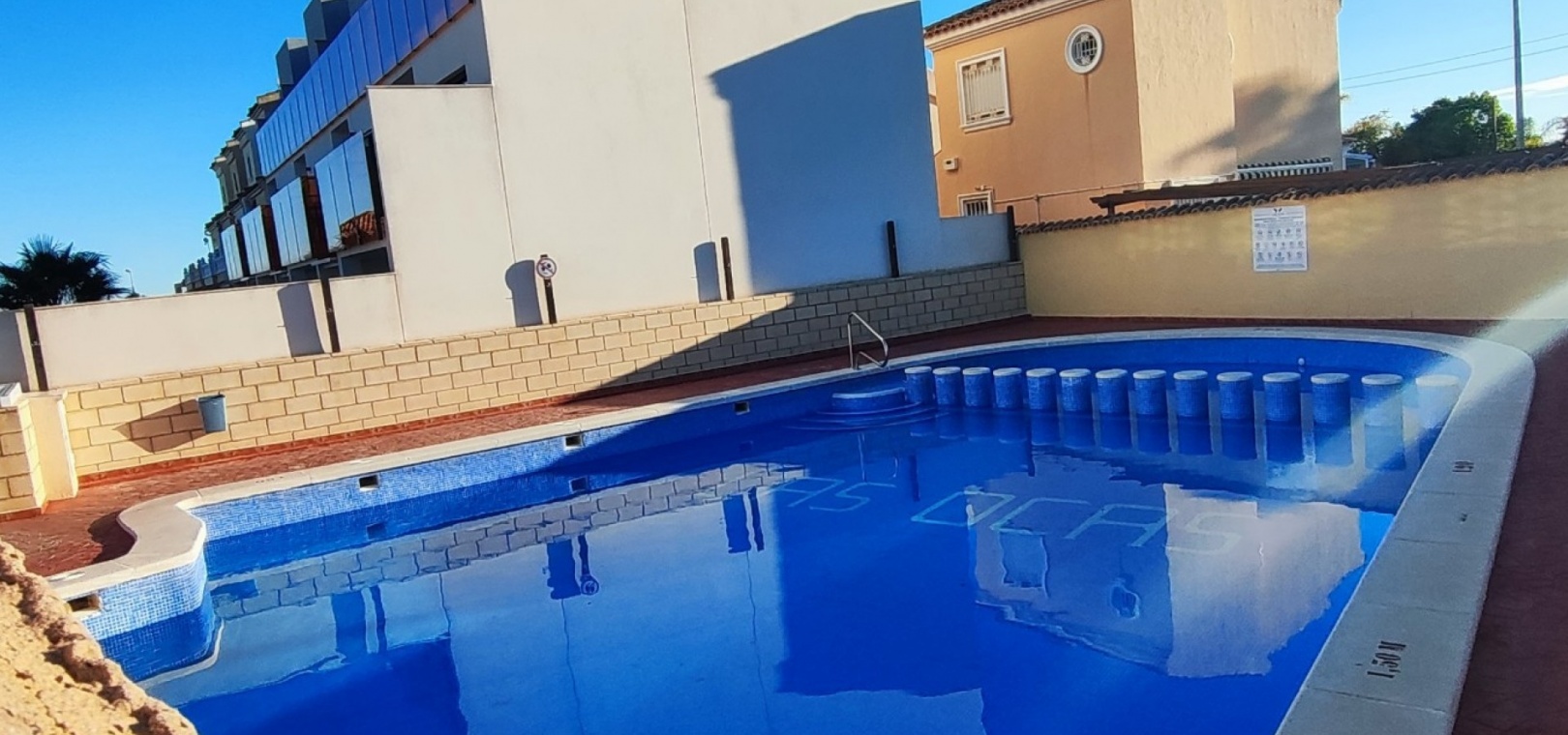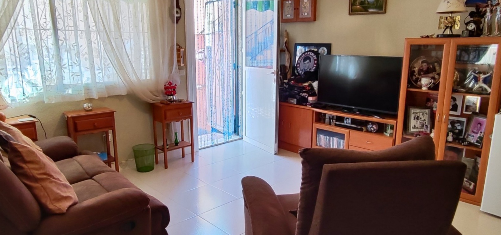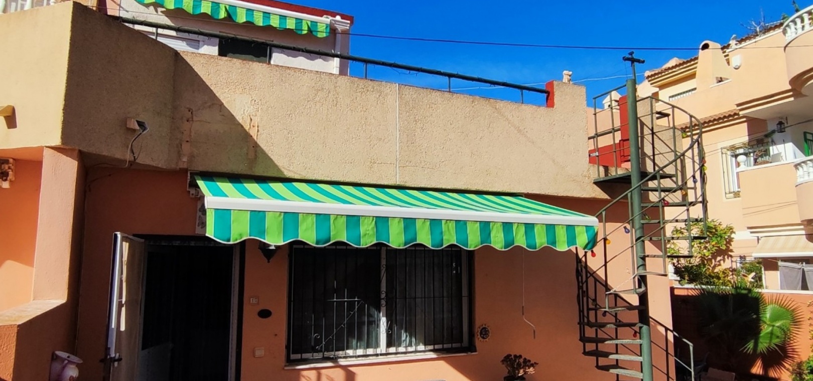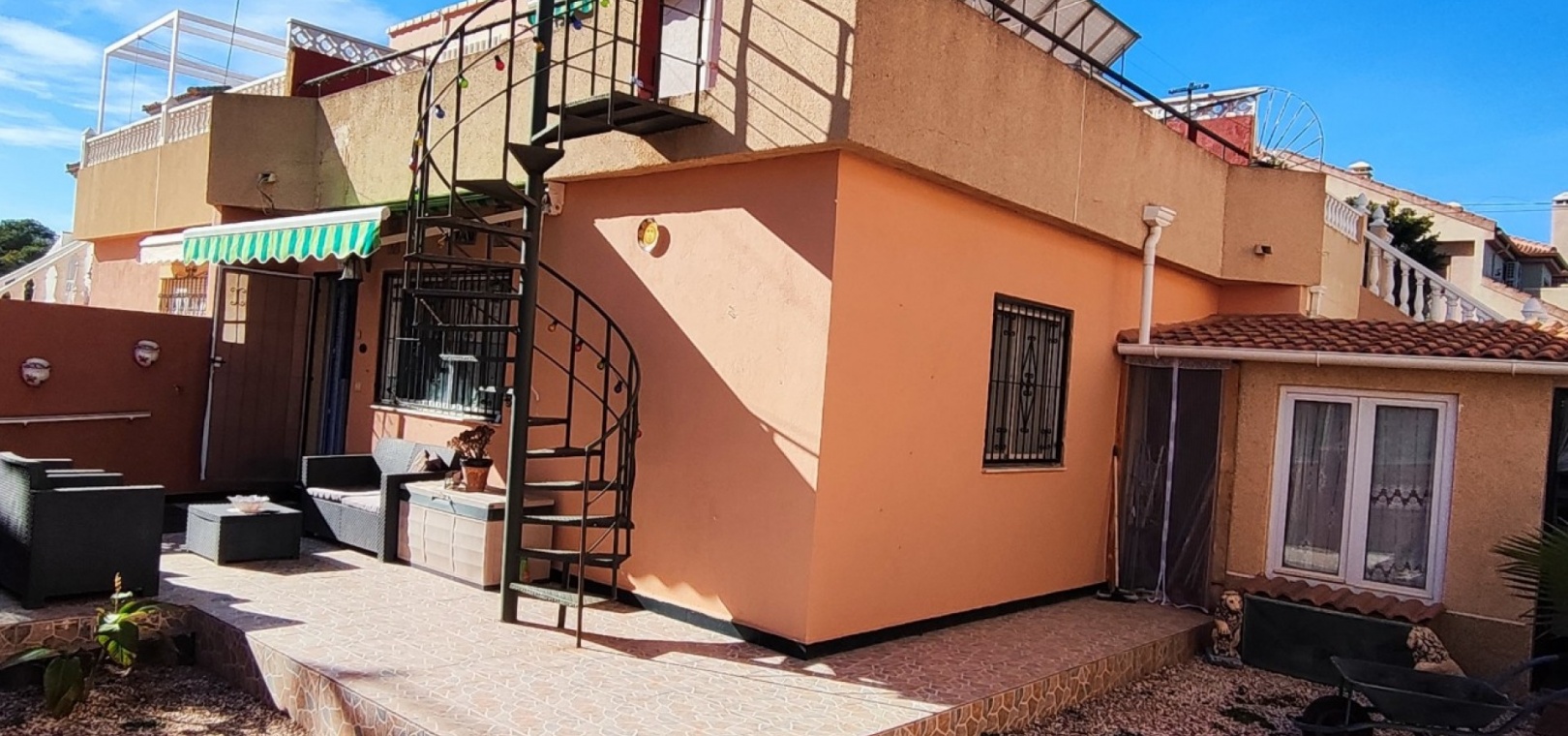 We are happy to introduce this quad style one level villa located close to Las Ramblas golf course on the Orihuela Costa, South Costa Blanca. Situated just 45 minutes drive to both Alicante or Murcia airport and within walking distance to a local supermarket, bars and restaurants and only a short drive or cycle to the beaches of Cabo Roig and Dehesa de Campomor.The property is found within the community so there is no direct car access but street parking is just 2 properties away. There are a few steps beyond the main entrance gate that lead you up onto the flat plot where we find a patio area with outside seating and a garden mainly laid to gravel with a selection of Mediterranean plants bordering the plot. Inside we find an open plan living room with a fitted modern kitchen. There are 2 double bedrooms, one larger master bedroom with ample wardrobe space and a twin room with small storage cupboard. The bathroom has been changed to have a walking shower, vanity unit and W.C.There is a 3rd bedroom/storage room on the roof that is accessed via a spiral staircase, this room currently has 2 single beds and a sofa as well as the washing machine so it would be possible to add a small shower room here for guests as there is already plumbing. The solarium is a great area for sunbathing, the floor has recently been resealed and thee is also a large storage cupboard. Within the garden area there is a brick built shed/tool room. The property will be sold furnished.
