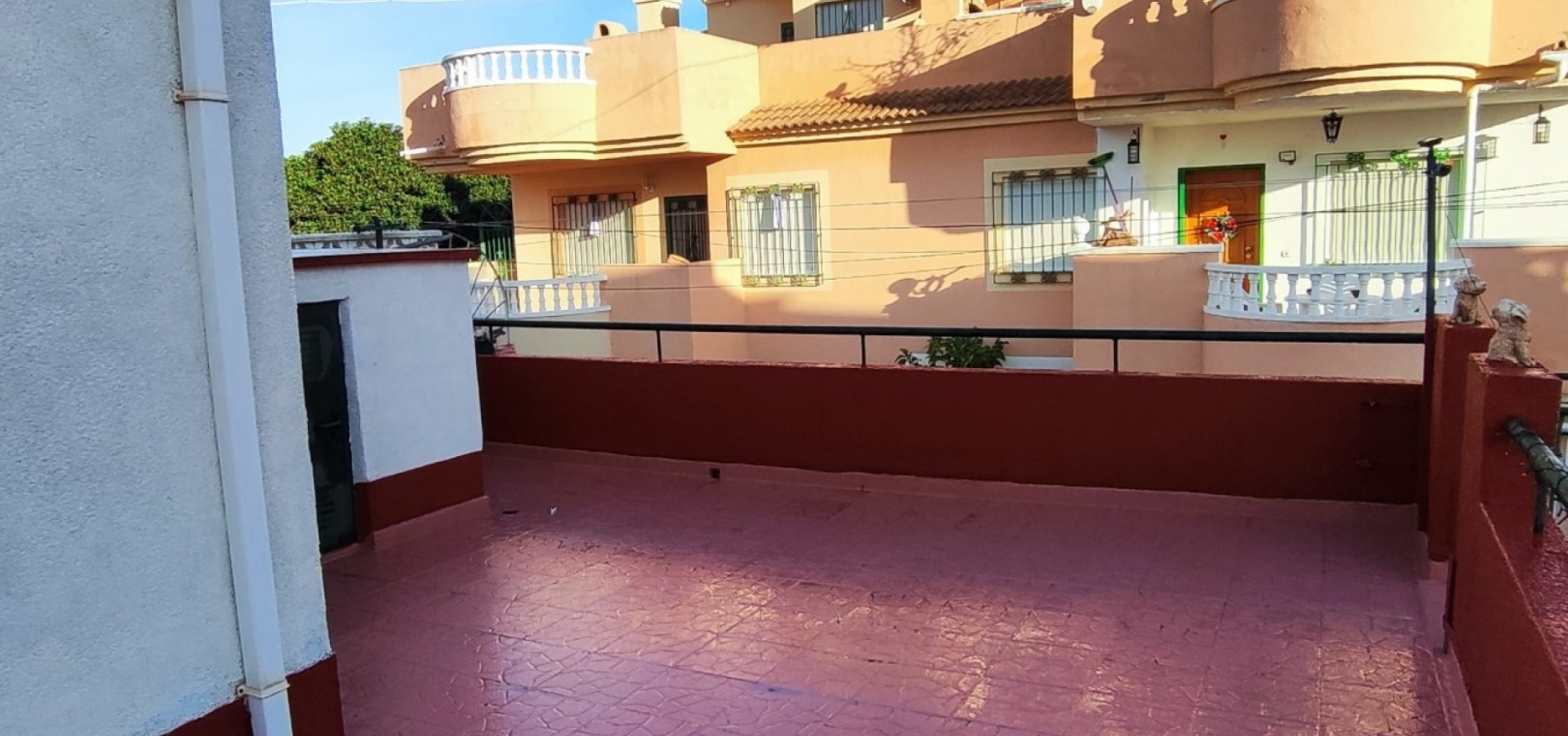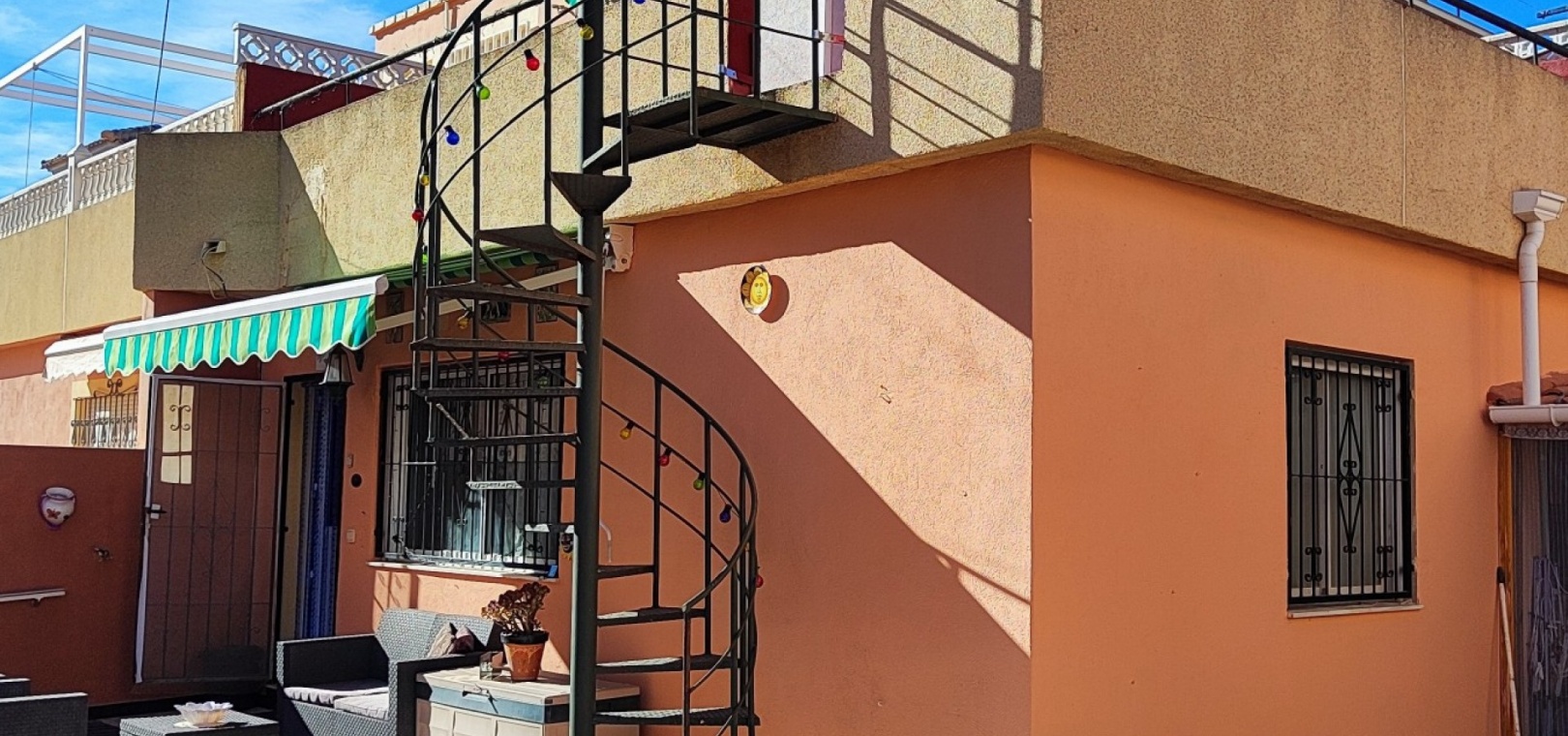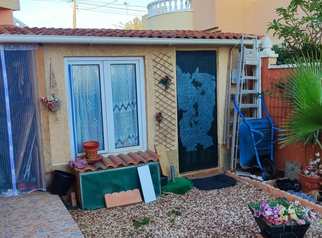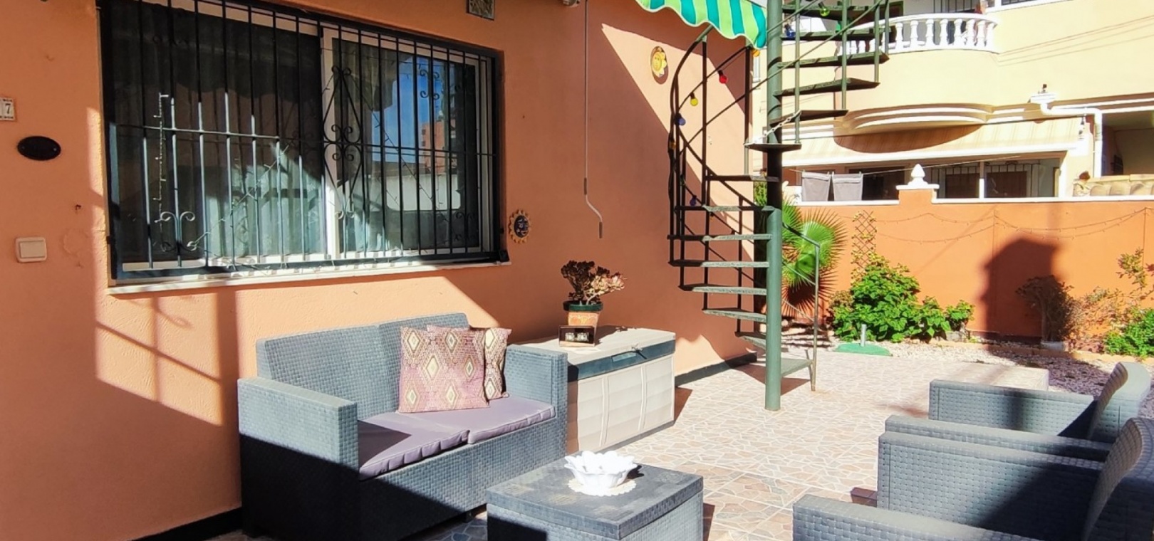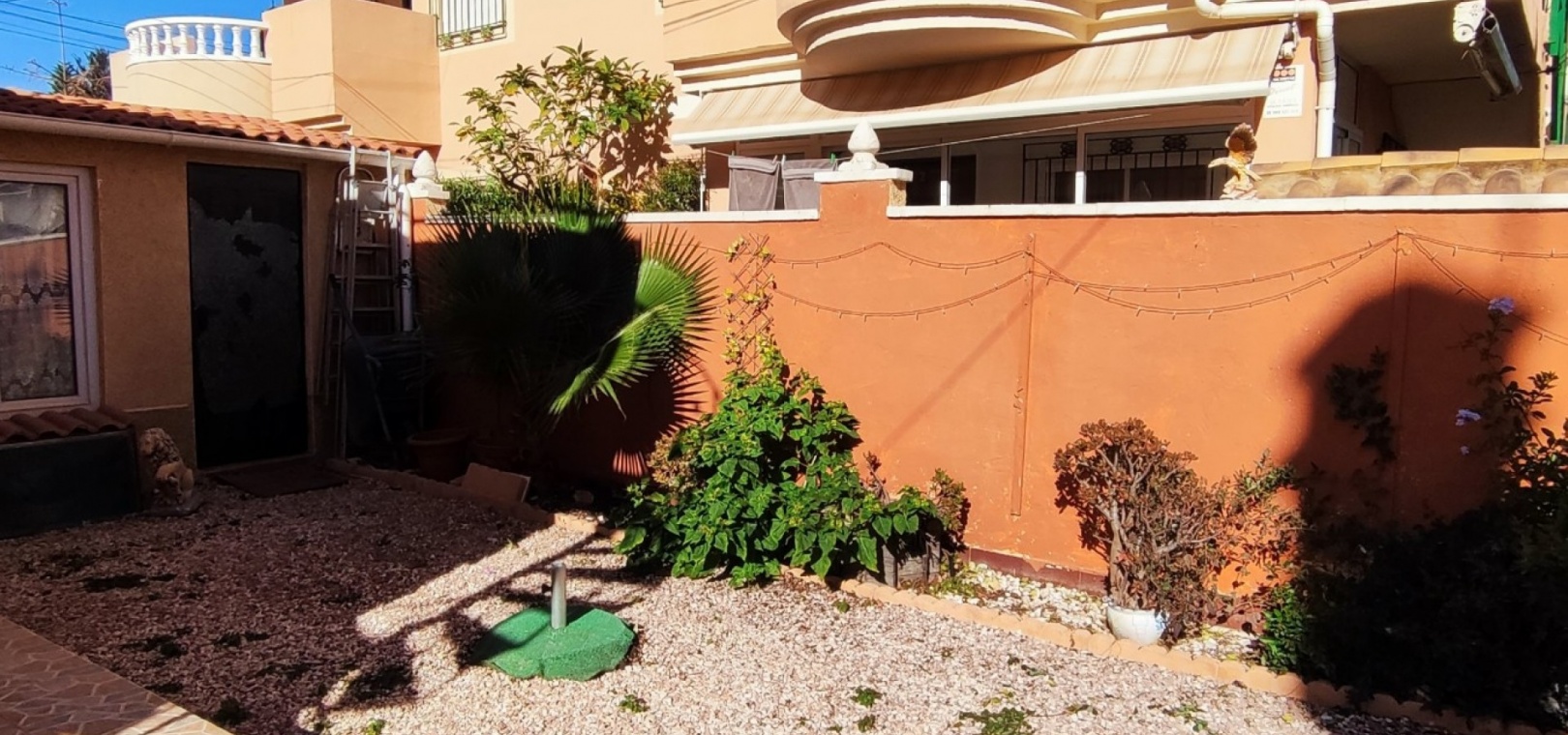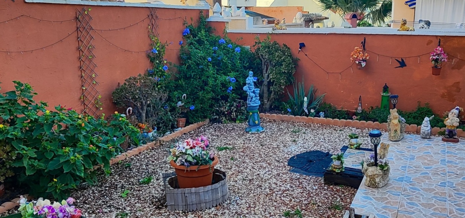 We are happy to introduce this quad style one level villa located close to Las Ramblas golf course on the Orihuela Costa, South Costa Blanca. Situated just 45 minutes drive to both Alicante or Murcia airport and within walking distance to a local supermarket, bars and restaurants and only a short drive or cycle to the beaches of Cabo Roig and Dehesa de Campomor.The property is found within the community so there is no direct car access but street parking is just 2 properties away. There are a few steps beyond the main entrance gate that lead you up onto the flat plot where we find a patio area with outside seating and a garden mainly laid to gravel with a selection of Mediterranean plants bordering the plot. Inside we find an open plan living room with a fitted modern kitchen. There are 2 double bedrooms, one larger master bedroom with ample wardrobe space and a twin room with small storage cupboard. The bathroom has been changed to have a walking shower, vanity unit and W.C.There is a 3rd bedroom/storage room on the roof that is accessed via a spiral staircase, this room currently has 2 single beds and a sofa as well as the washing machine so it would be possible to add a small shower room here for guests as there is already plumbing. The solarium is a great area for sunbathing, the floor has recently been resealed and thee is also a large storage cupboard. Within the garden area there is a brick built shed/tool room. The property will be sold furnished.