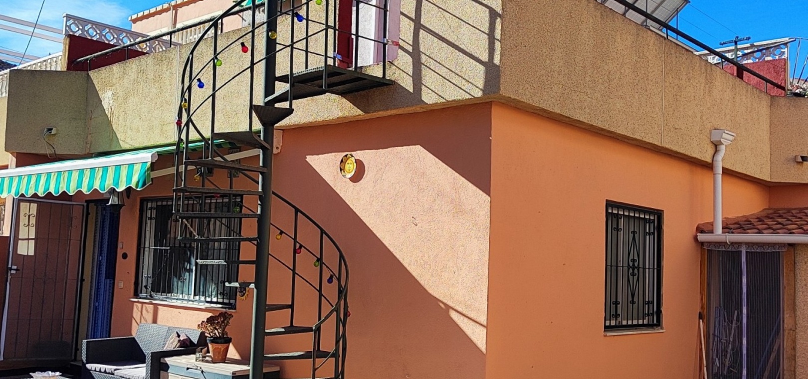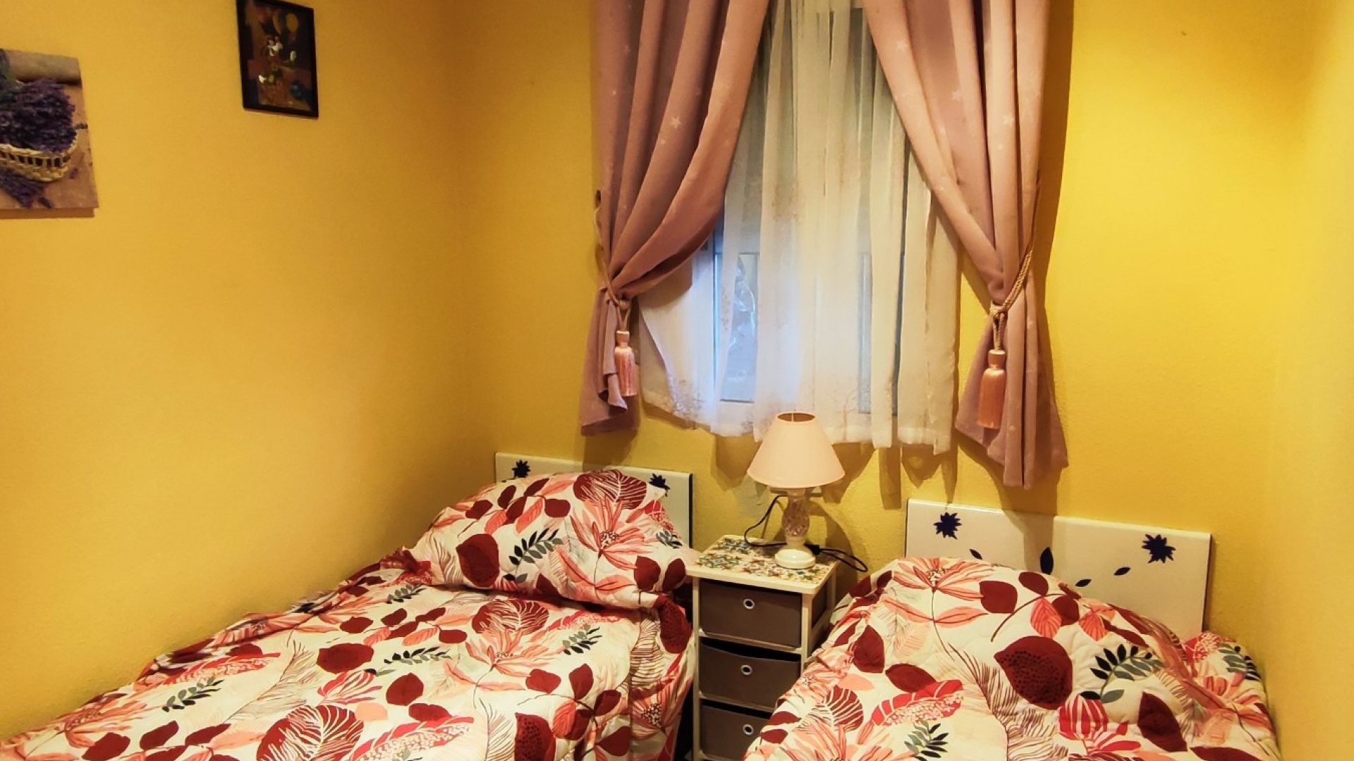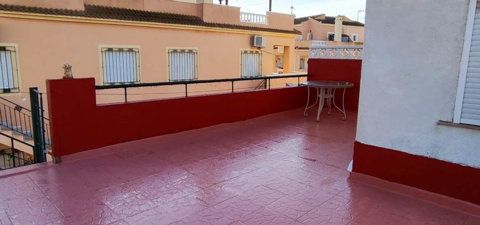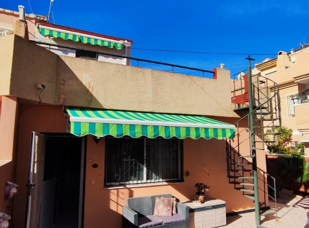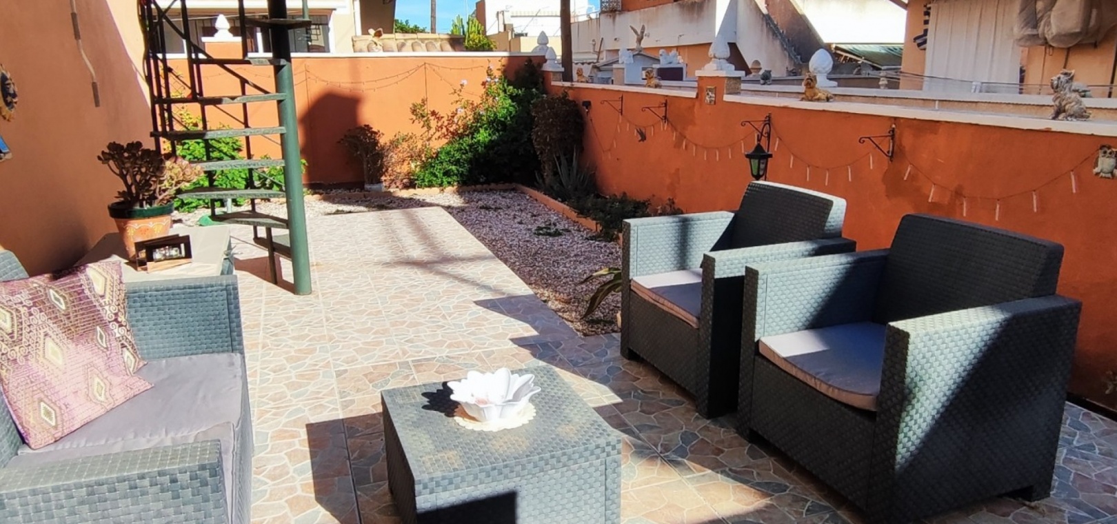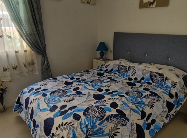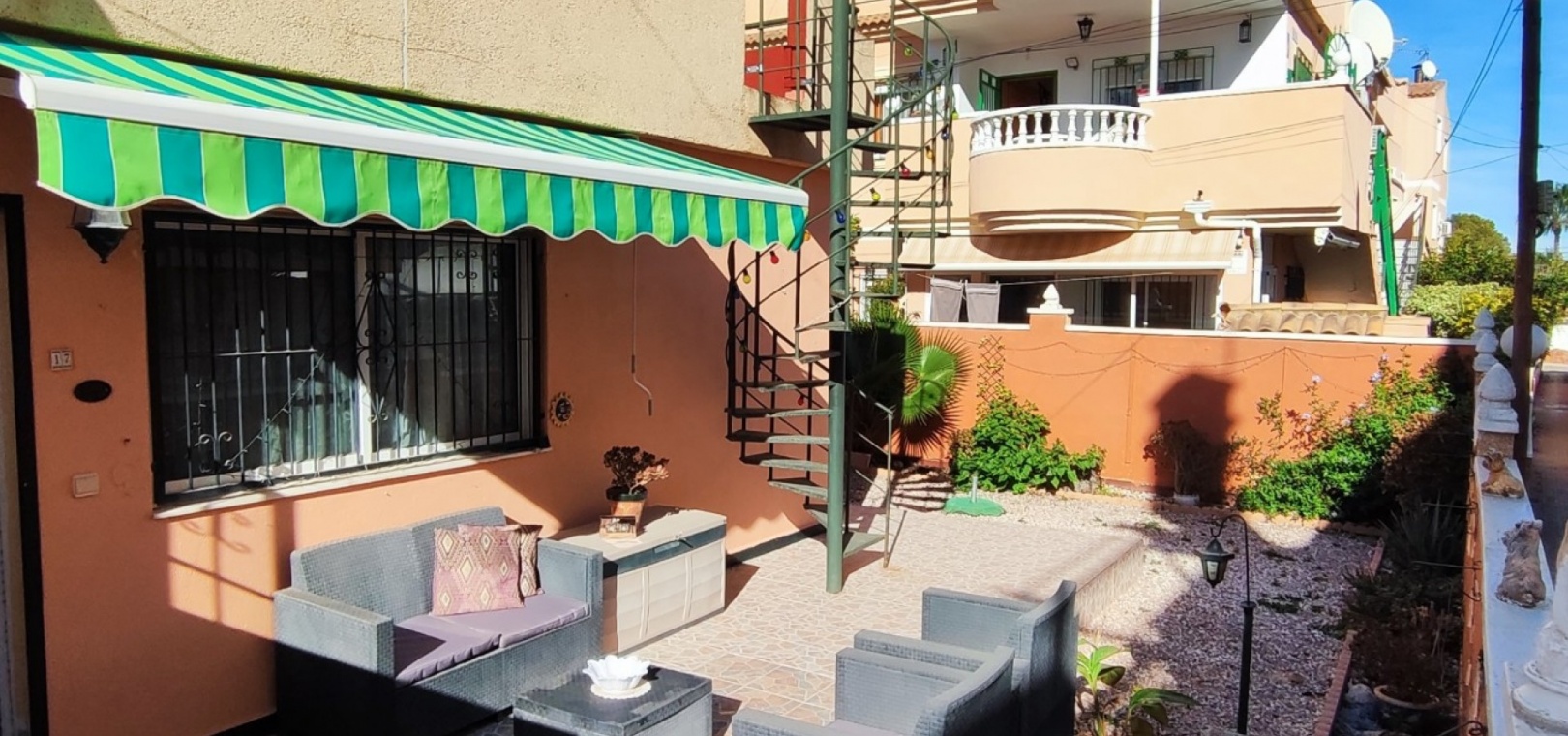 We are happy to introduce this quad style one level villa located close to Las Ramblas golf course on the Orihuela Costa, South Costa Blanca. Situated just 45 minutes drive to both Alicante or Murcia airport and within walking distance to a local supermarket, bars and restaurants and only a short drive or cycle to the beaches of Cabo Roig and Dehesa de Campomor.The property is found within the community so there is no direct car access but street parking is just 2 properties away. There are a few steps beyond the main entrance gate that lead you up onto the flat plot where we find a patio area with outside seating and a garden mainly laid to gravel with a selection of Mediterranean plants bordering the plot. Inside we find an open plan living room with a fitted modern kitchen. There are 2 double bedrooms, one larger master bedroom with ample wardrobe space and a twin room with small storage cupboard. The bathroom has been changed to have a walking shower, vanity unit and W.C.There is a 3rd bedroom/storage room on the roof that is accessed via a spiral staircase, this room currently has 2 single beds and a sofa as well as the washing machine so it would be possible to add a small shower room here for guests as there is already plumbing. The solarium is a great area for sunbathing, the floor has recently been resealed and thee is also a large storage cupboard. Within the garden area there is a brick built shed/tool room. The property will be sold furnished.
