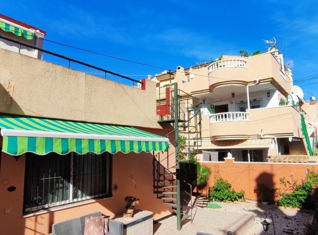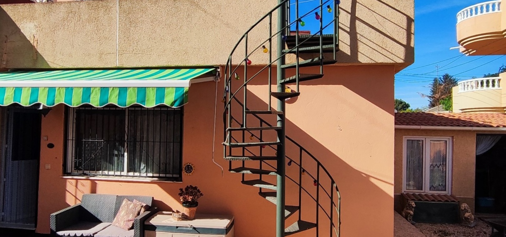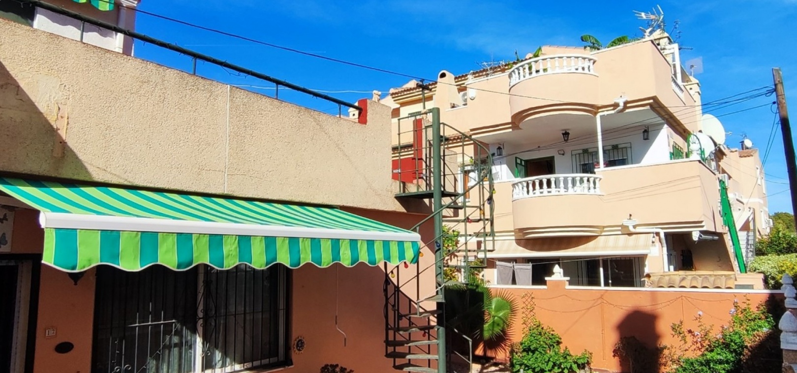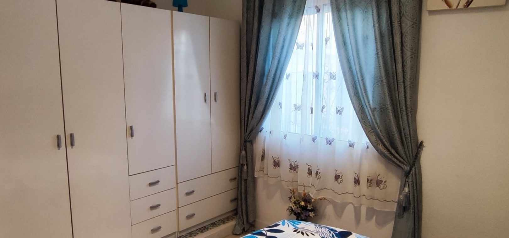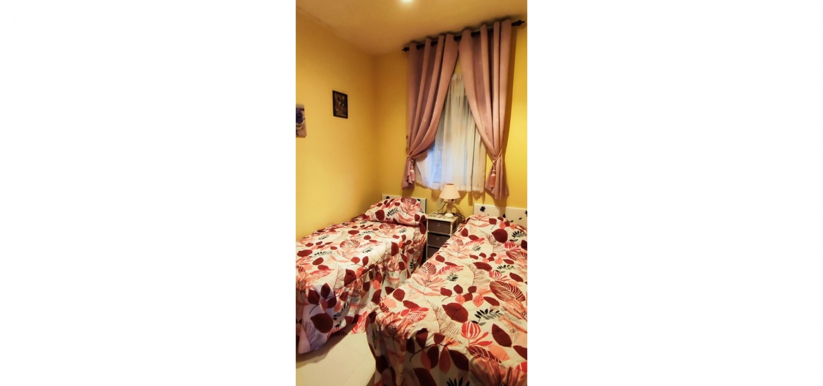 We are happy to introduce this quad style one level villa located close to Las Ramblas golf course on the Orihuela Costa, South Costa Blanca. Situated just 45 minutes drive to both Alicante or Murcia airport and within walking distance to a local supermarket, bars and restaurants and only a short drive or cycle to the beaches of Cabo Roig and Dehesa de Campomor.The property is found within the community so there is no direct car access but street parking is just 2 properties away. There are a few steps beyond the main entrance gate that lead you up onto the flat plot where we find a patio area with outside seating and a garden mainly laid to gravel with a selection of Mediterranean plants bordering the plot. Inside we find an open plan living room with a fitted modern kitchen. There are 2 double bedrooms, one larger master bedroom with ample wardrobe space and a twin room with small storage cupboard. The bathroom has been changed to have a walking shower, vanity unit and W.C.There is a 3rd bedroom/storage room on the roof that is accessed via a spiral staircase, this room currently has 2 single beds and a sofa as well as the washing machine so it would be possible to add a small shower room here for guests as there is already plumbing. The solarium is a great area for sunbathing, the floor has recently been resealed and thee is also a large storage cupboard. Within the garden area there is a brick built shed/tool room. The property will be sold furnished.