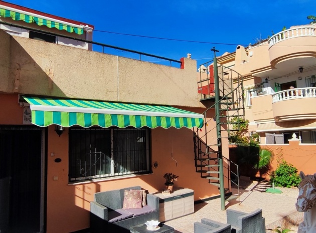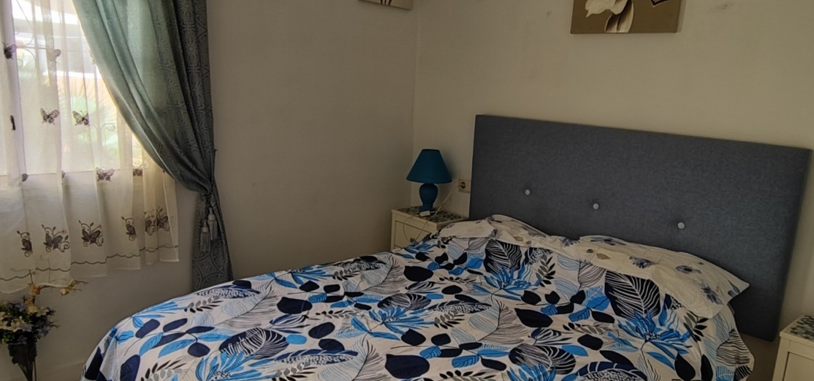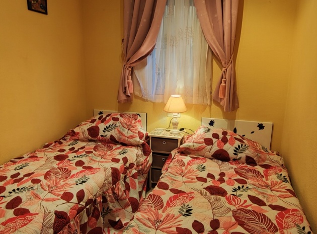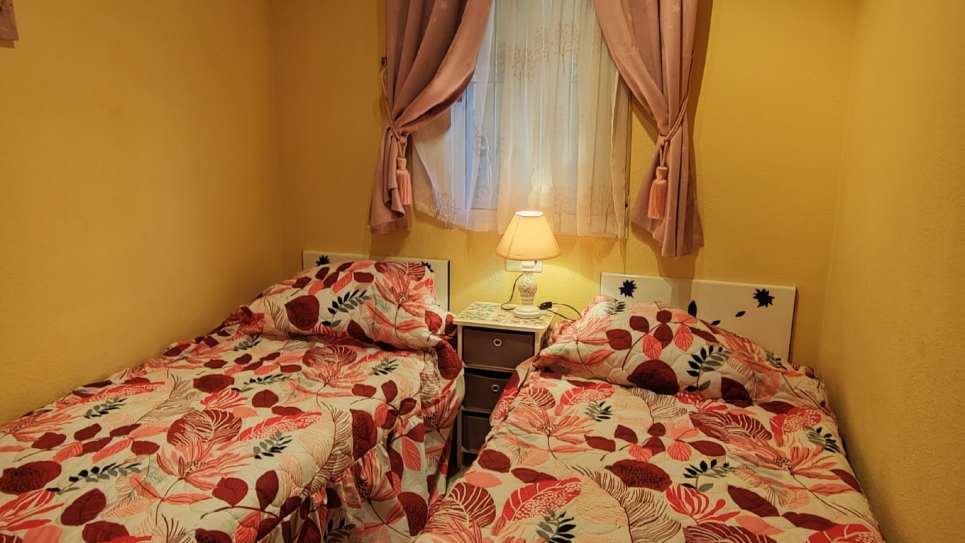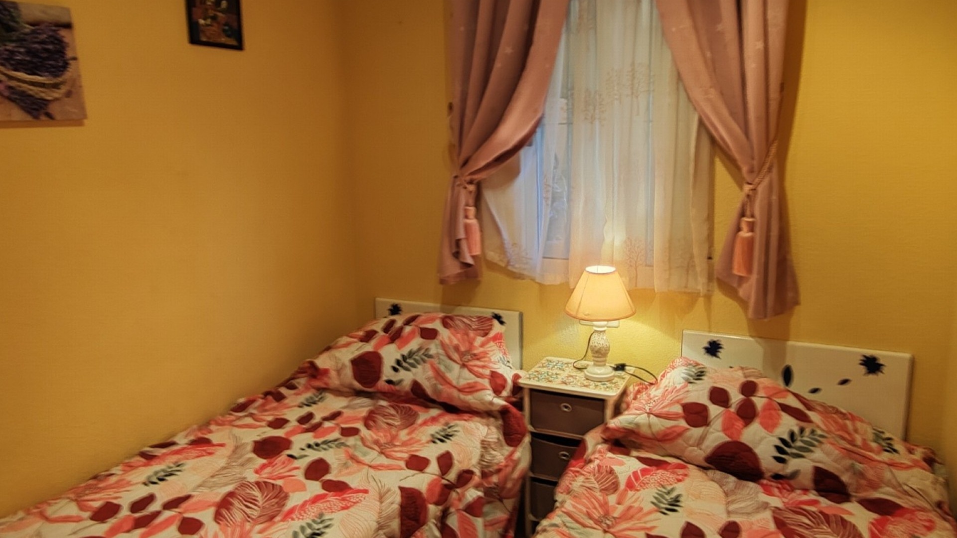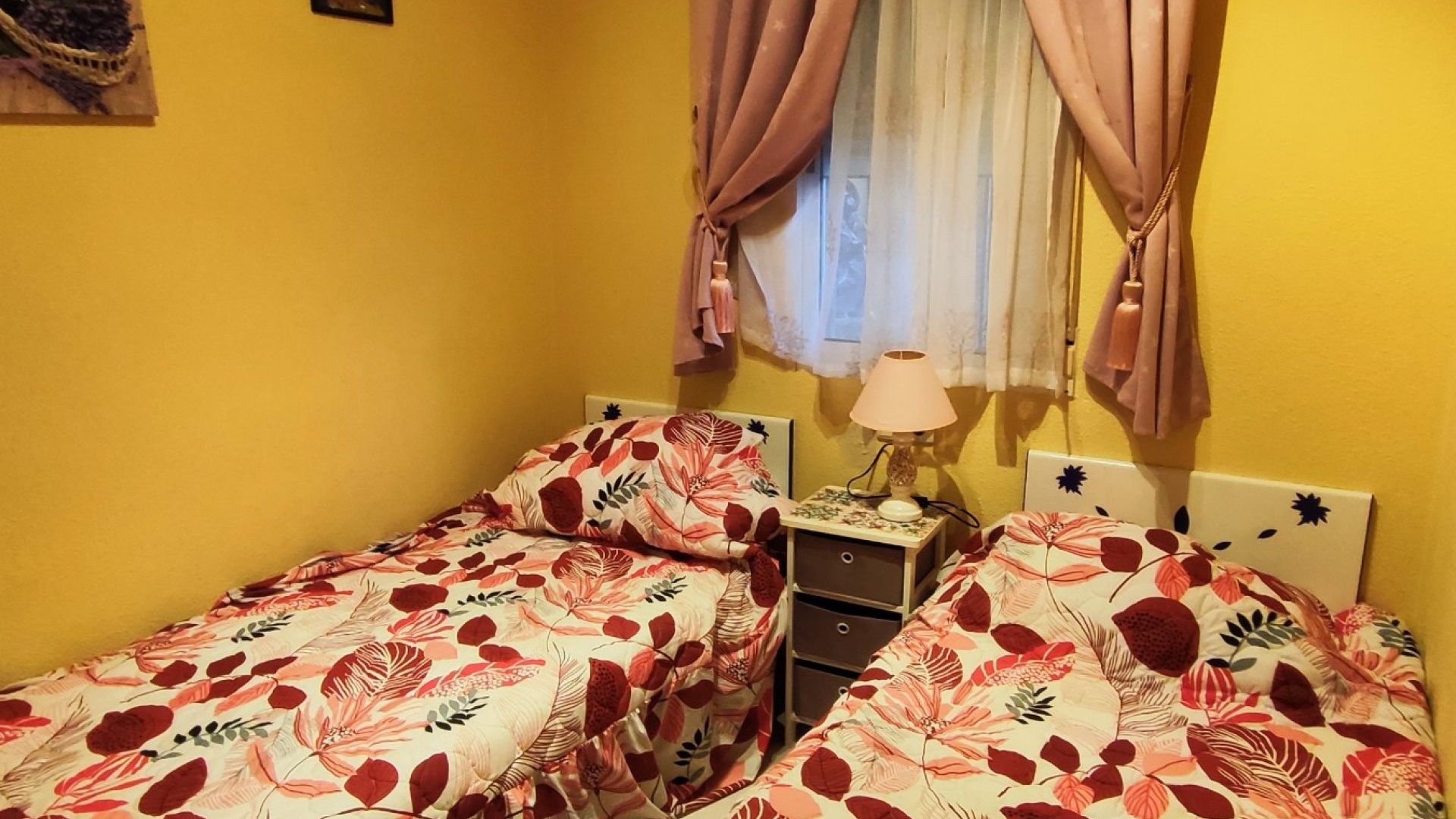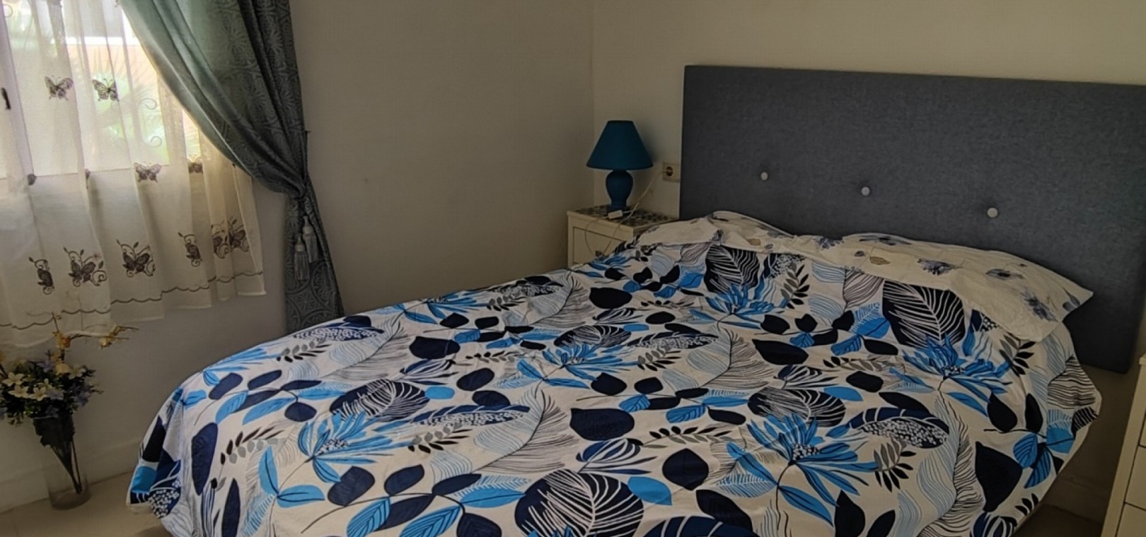 We are happy to introduce this quad style one level villa located close to Las Ramblas golf course on the Orihuela Costa, South Costa Blanca. Situated just 45 minutes drive to both Alicante or Murcia airport and within walking distance to a local supermarket, bars and restaurants and only a short drive or cycle to the beaches of Cabo Roig and Dehesa de Campomor.The property is found within the community so there is no direct car access but street parking is just 2 properties away. There are a few steps beyond the main entrance gate that lead you up onto the flat plot where we find a patio area with outside seating and a garden mainly laid to gravel with a selection of Mediterranean plants bordering the plot. Inside we find an open plan living room with a fitted modern kitchen. There are 2 double bedrooms, one larger master bedroom with ample wardrobe space and a twin room with small storage cupboard. The bathroom has been changed to have a walking shower, vanity unit and W.C.There is a 3rd bedroom/storage room on the roof that is accessed via a spiral staircase, this room currently has 2 single beds and a sofa as well as the washing machine so it would be possible to add a small shower room here for guests as there is already plumbing. The solarium is a great area for sunbathing, the floor has recently been resealed and thee is also a large storage cupboard. Within the garden area there is a brick built shed/tool room. The property will be sold furnished.