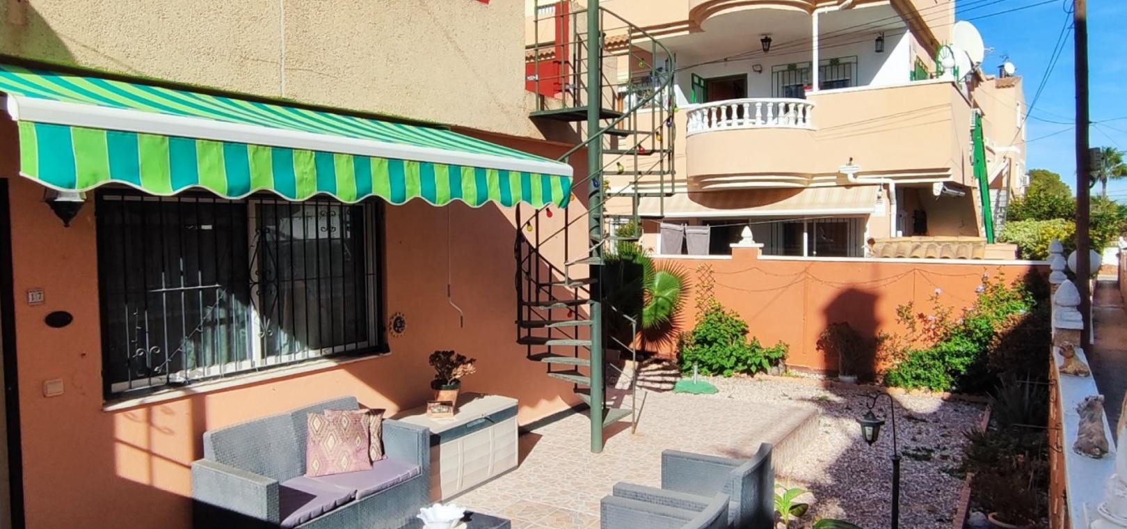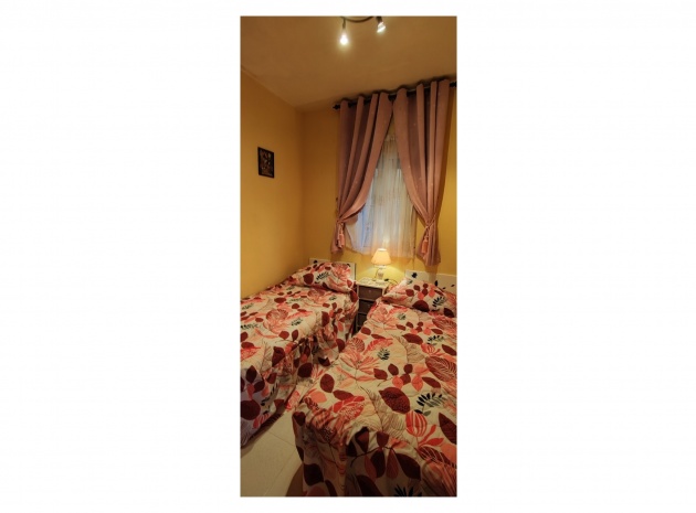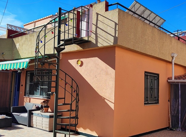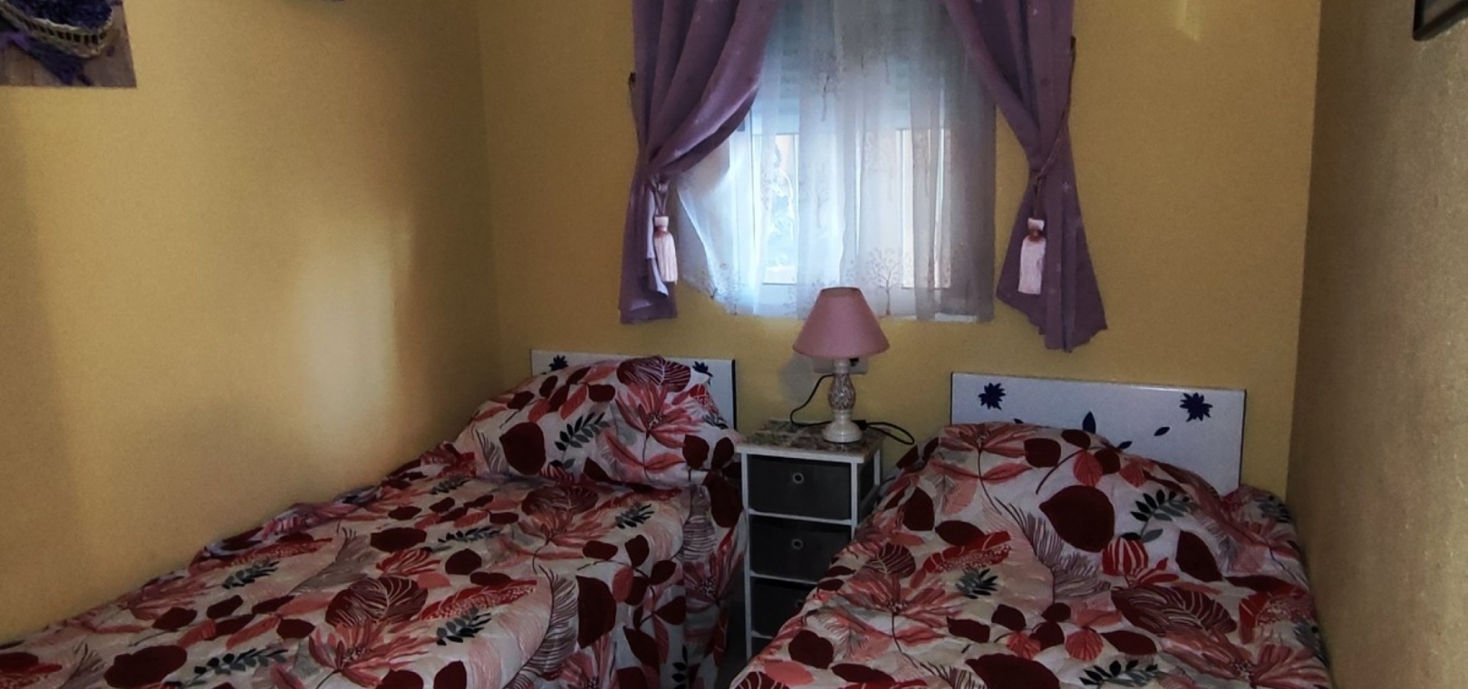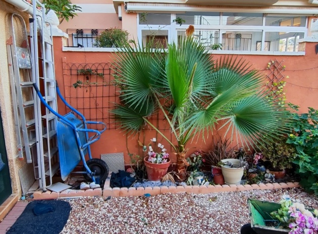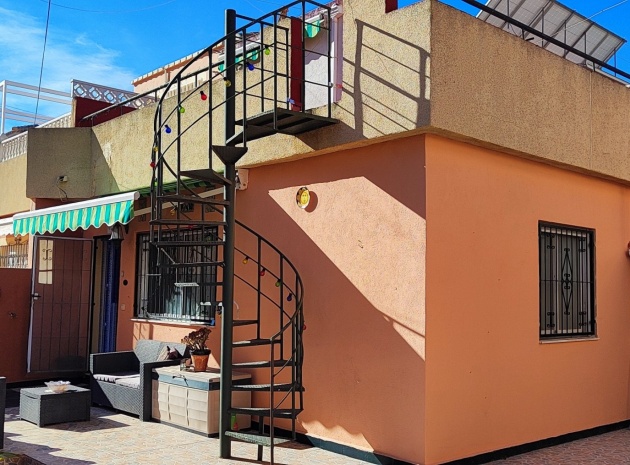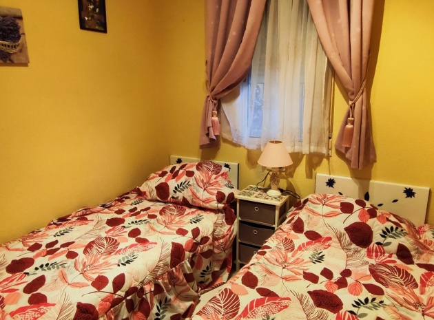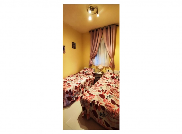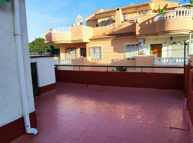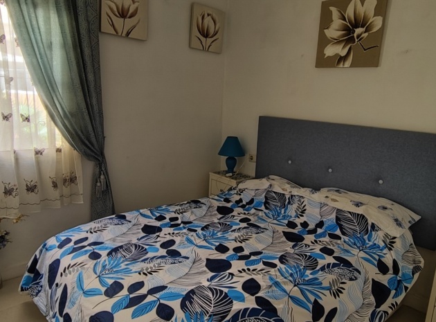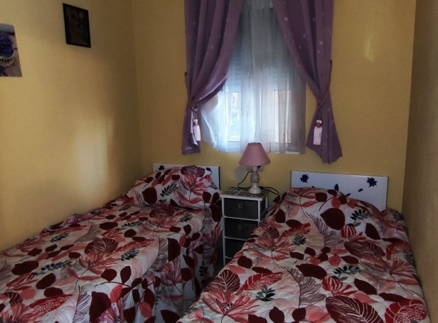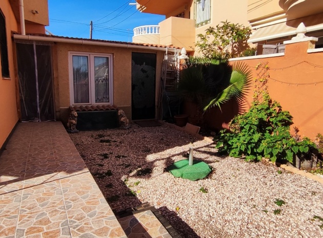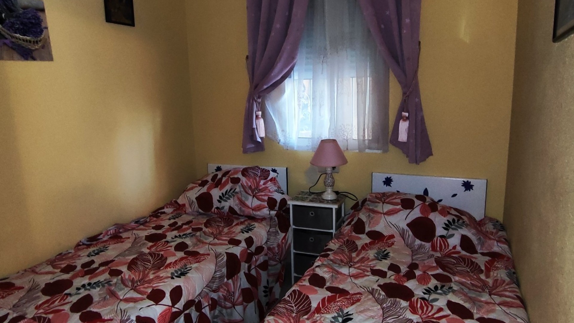 We are happy to introduce this quad style one level villa located close to Las Ramblas golf course on the Orihuela Costa, South Costa Blanca. Situated just 45 minutes drive to both Alicante or Murcia airport and within walking distance to a local supermarket, bars and restaurants and only a short drive or cycle to the beaches of Cabo Roig and Dehesa de Campomor.The property is found within the community so there is no direct car access but street parking is just 2 properties away. There are a few steps beyond the main entrance gate that lead you up onto the flat plot where we find a patio area with outside seating and a garden mainly laid to gravel with a selection of Mediterranean plants bordering the plot. Inside we find an open plan living room with a fitted modern kitchen. There are 2 double bedrooms, one larger master bedroom with ample wardrobe space and a twin room with small storage cupboard. The bathroom has been changed to have a walking shower, vanity unit and W.C.There is a 3rd bedroom/storage room on the roof that is accessed via a spiral staircase, this room currently has 2 single beds and a sofa as well as the washing machine so it would be possible to add a small shower room here for guests as there is already plumbing. The solarium is a great area for sunbathing, the floor has recently been resealed and thee is also a large storage cupboard. Within the garden area there is a brick built shed/tool room. The property will be sold furnished.
