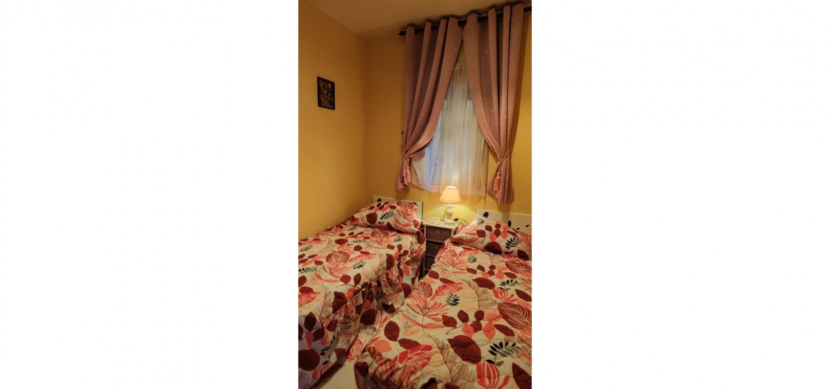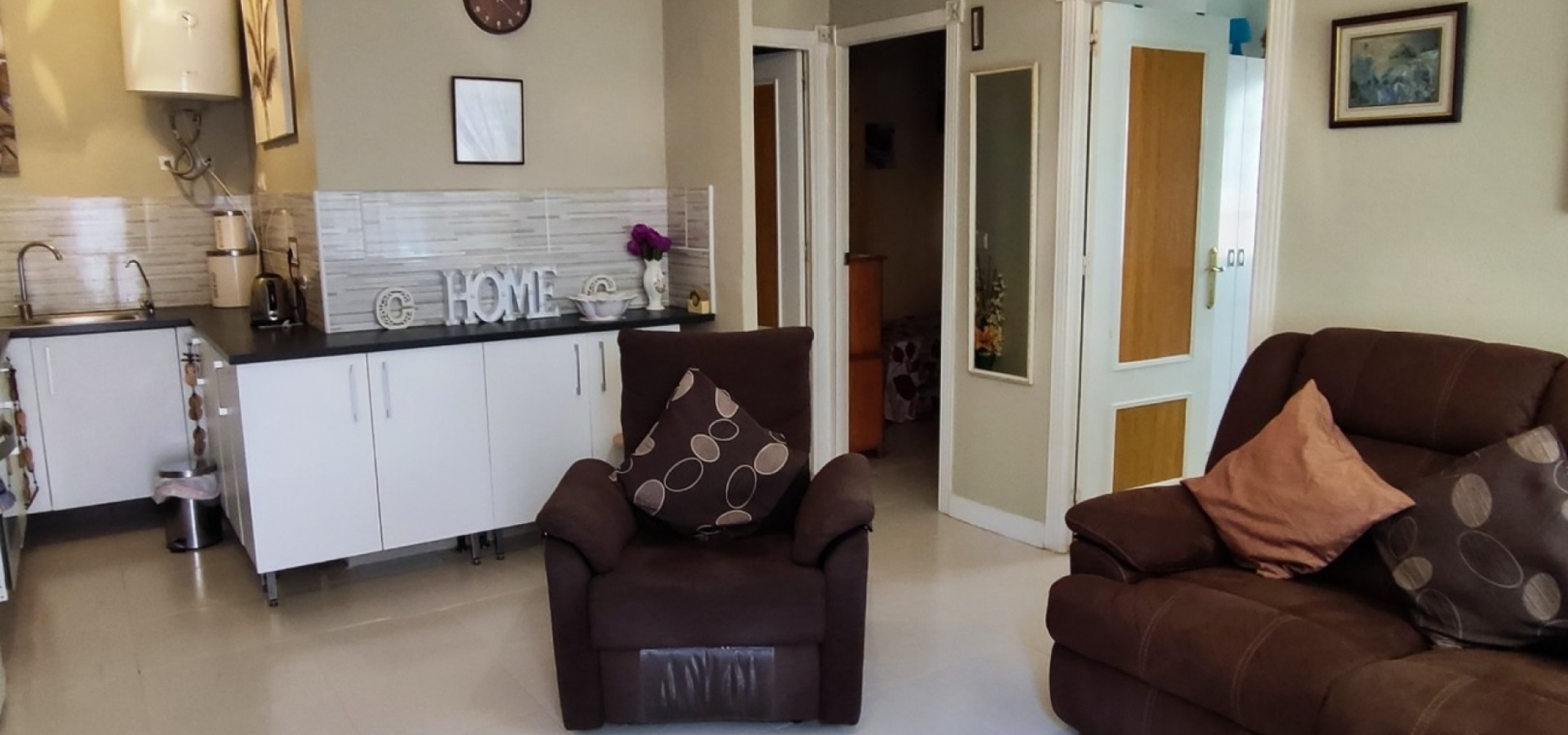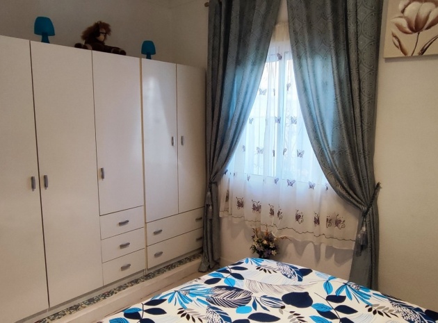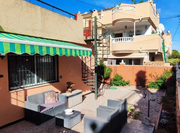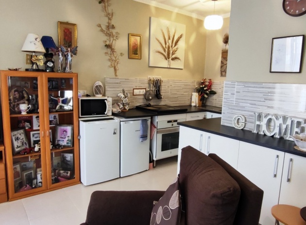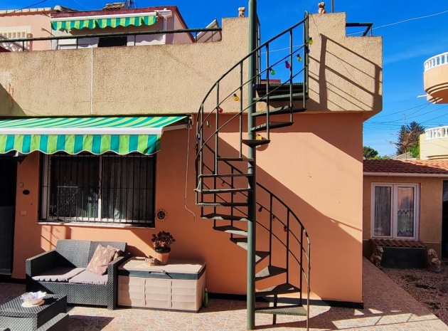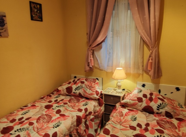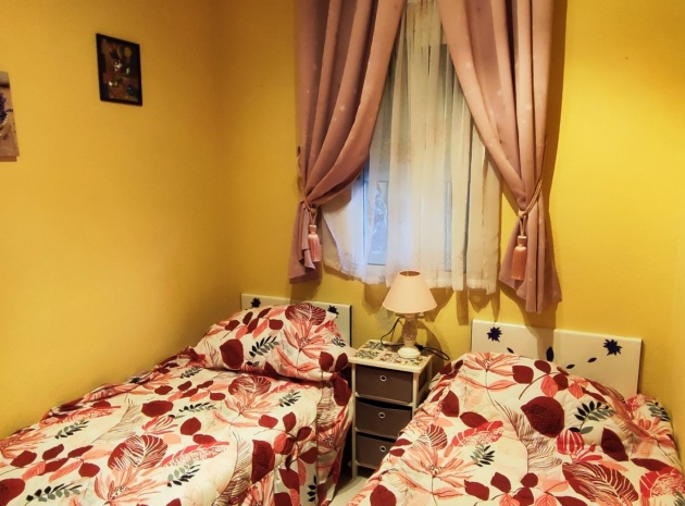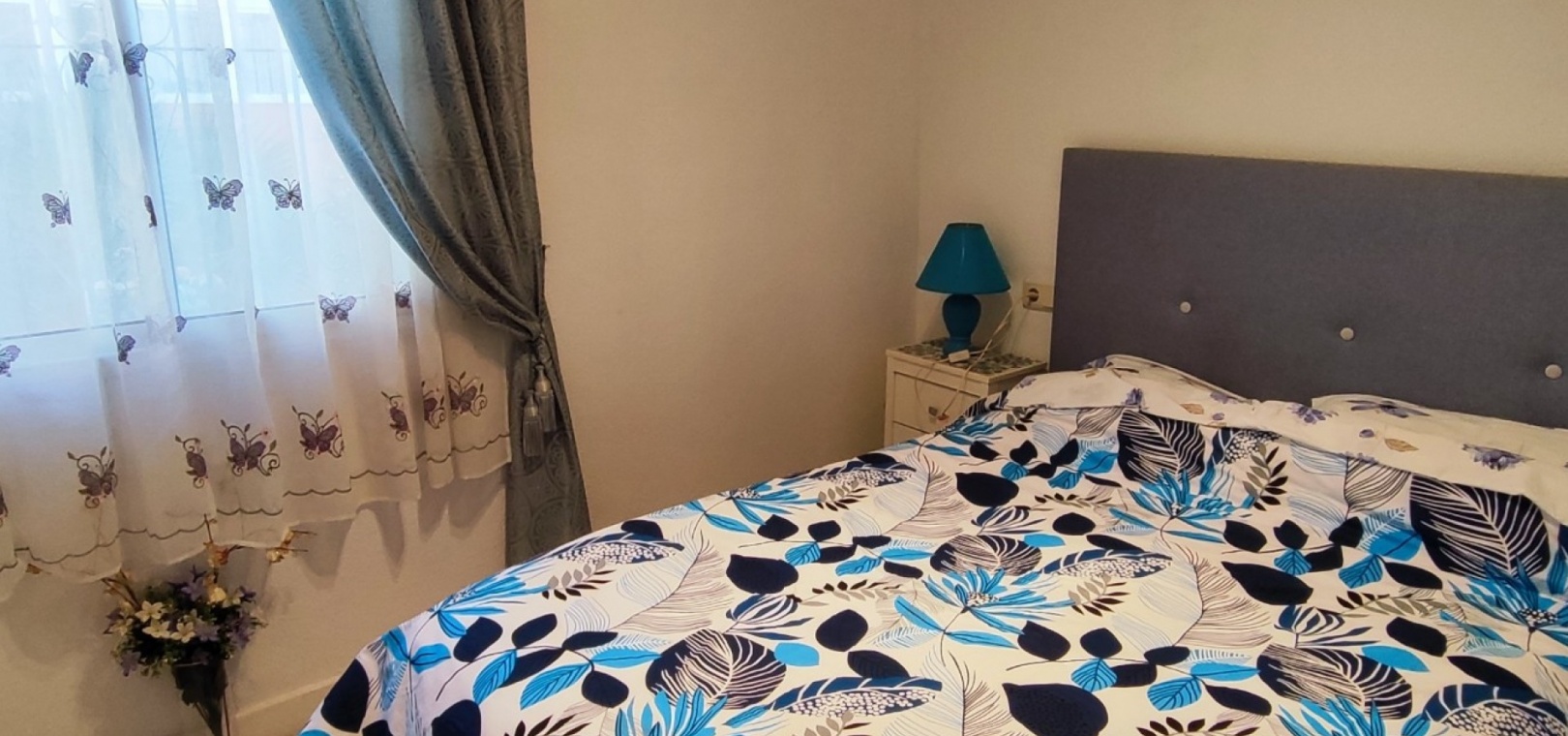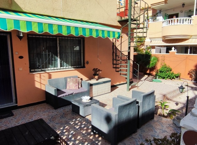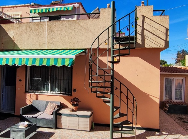 We are happy to introduce this quad style one level villa located close to Las Ramblas golf course on the Orihuela Costa, South Costa Blanca. Situated just 45 minutes drive to both Alicante or Murcia airport and within walking distance to a local supermarket, bars and restaurants and only a short drive or cycle to the beaches of Cabo Roig and Dehesa de Campomor.The property is found within the community so there is no direct car access but street parking is just 2 properties away. There are a few steps beyond the main entrance gate that lead you up onto the flat plot where we find a patio area with outside seating and a garden mainly laid to gravel with a selection of Mediterranean plants bordering the plot. Inside we find an open plan living room with a fitted modern kitchen. There are 2 double bedrooms, one larger master bedroom with ample wardrobe space and a twin room with small storage cupboard. The bathroom has been changed to have a walking shower, vanity unit and W.C.There is a 3rd bedroom/storage room on the roof that is accessed via a spiral staircase, this room currently has 2 single beds and a sofa as well as the washing machine so it would be possible to add a small shower room here for guests as there is already plumbing. The solarium is a great area for sunbathing, the floor has recently been resealed and thee is also a large storage cupboard. Within the garden area there is a brick built shed/tool room. The property will be sold furnished.