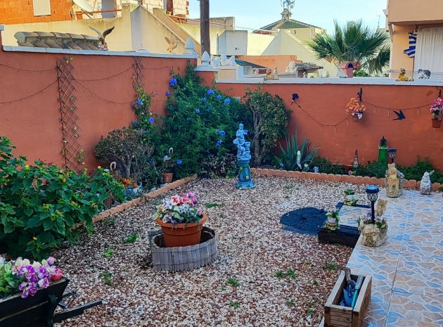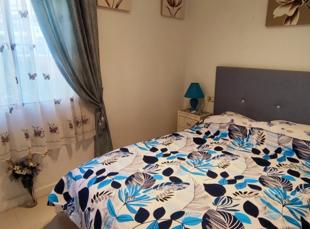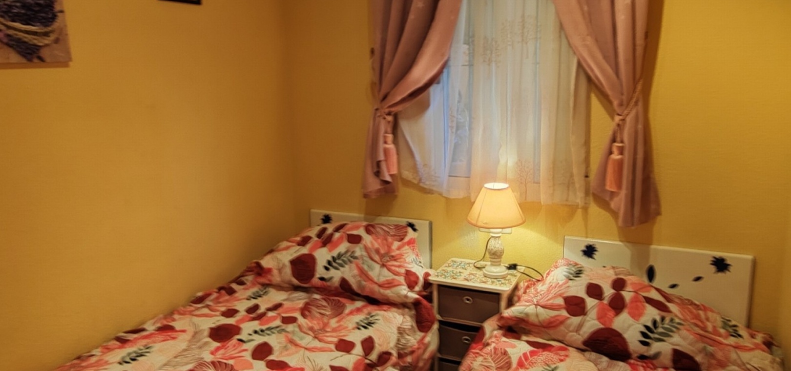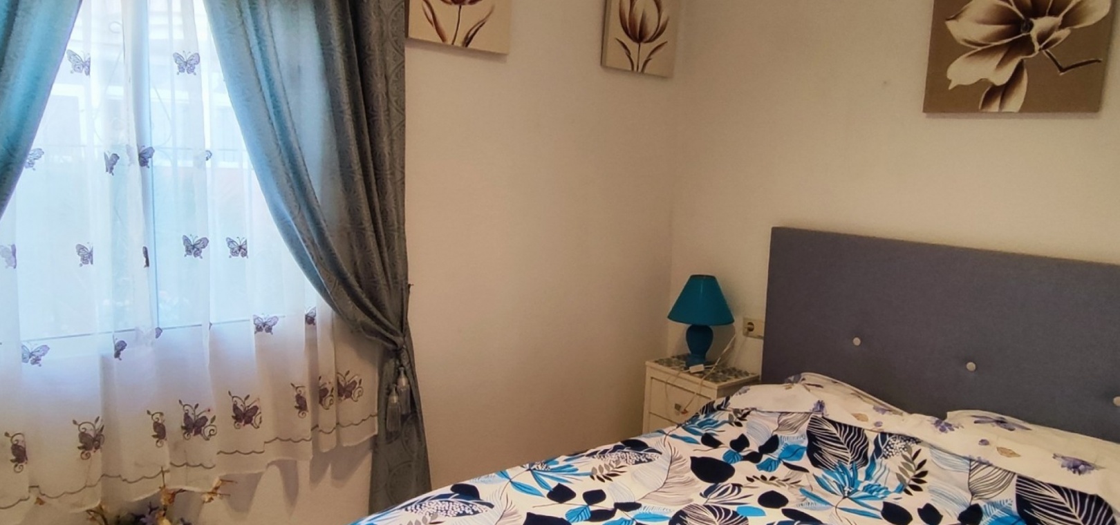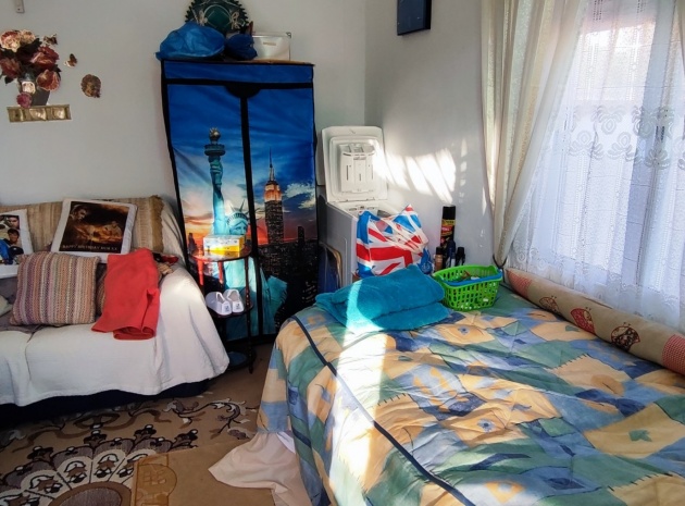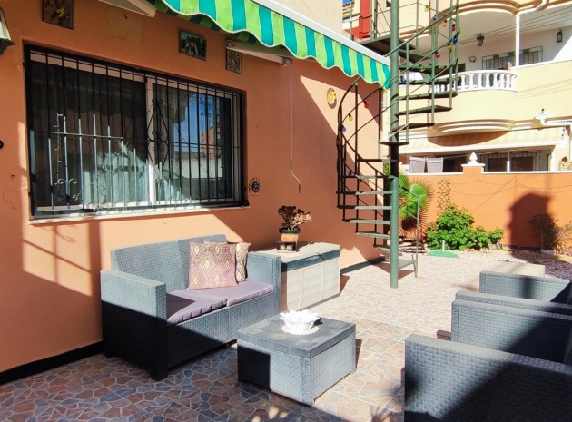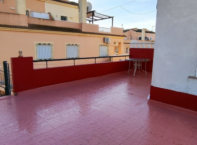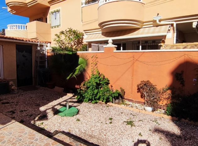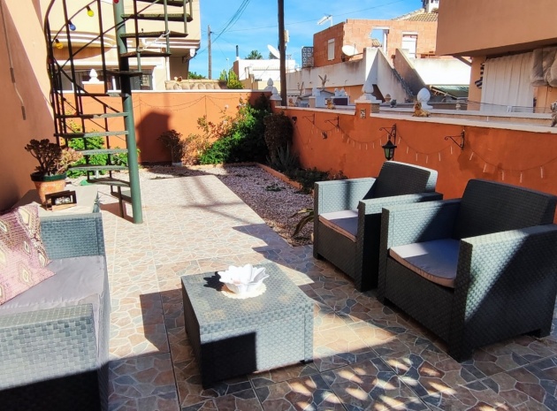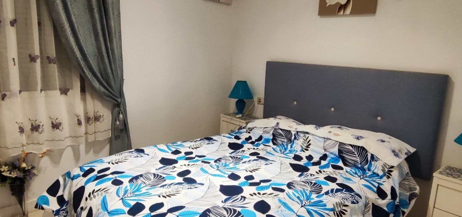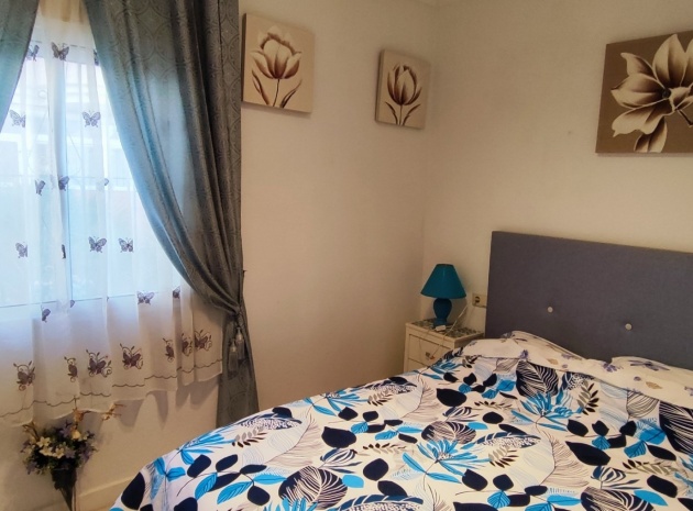 We are happy to introduce this quad style one level villa located close to Las Ramblas golf course on the Orihuela Costa, South Costa Blanca. Situated just 45 minutes drive to both Alicante or Murcia airport and within walking distance to a local supermarket, bars and restaurants and only a short drive or cycle to the beaches of Cabo Roig and Dehesa de Campomor.The property is found within the community so there is no direct car access but street parking is just 2 properties away. There are a few steps beyond the main entrance gate that lead you up onto the flat plot where we find a patio area with outside seating and a garden mainly laid to gravel with a selection of Mediterranean plants bordering the plot. Inside we find an open plan living room with a fitted modern kitchen. There are 2 double bedrooms, one larger master bedroom with ample wardrobe space and a twin room with small storage cupboard. The bathroom has been changed to have a walking shower, vanity unit and W.C.There is a 3rd bedroom/storage room on the roof that is accessed via a spiral staircase, this room currently has 2 single beds and a sofa as well as the washing machine so it would be possible to add a small shower room here for guests as there is already plumbing. The solarium is a great area for sunbathing, the floor has recently been resealed and thee is also a large storage cupboard. Within the garden area there is a brick built shed/tool room. The property will be sold furnished.