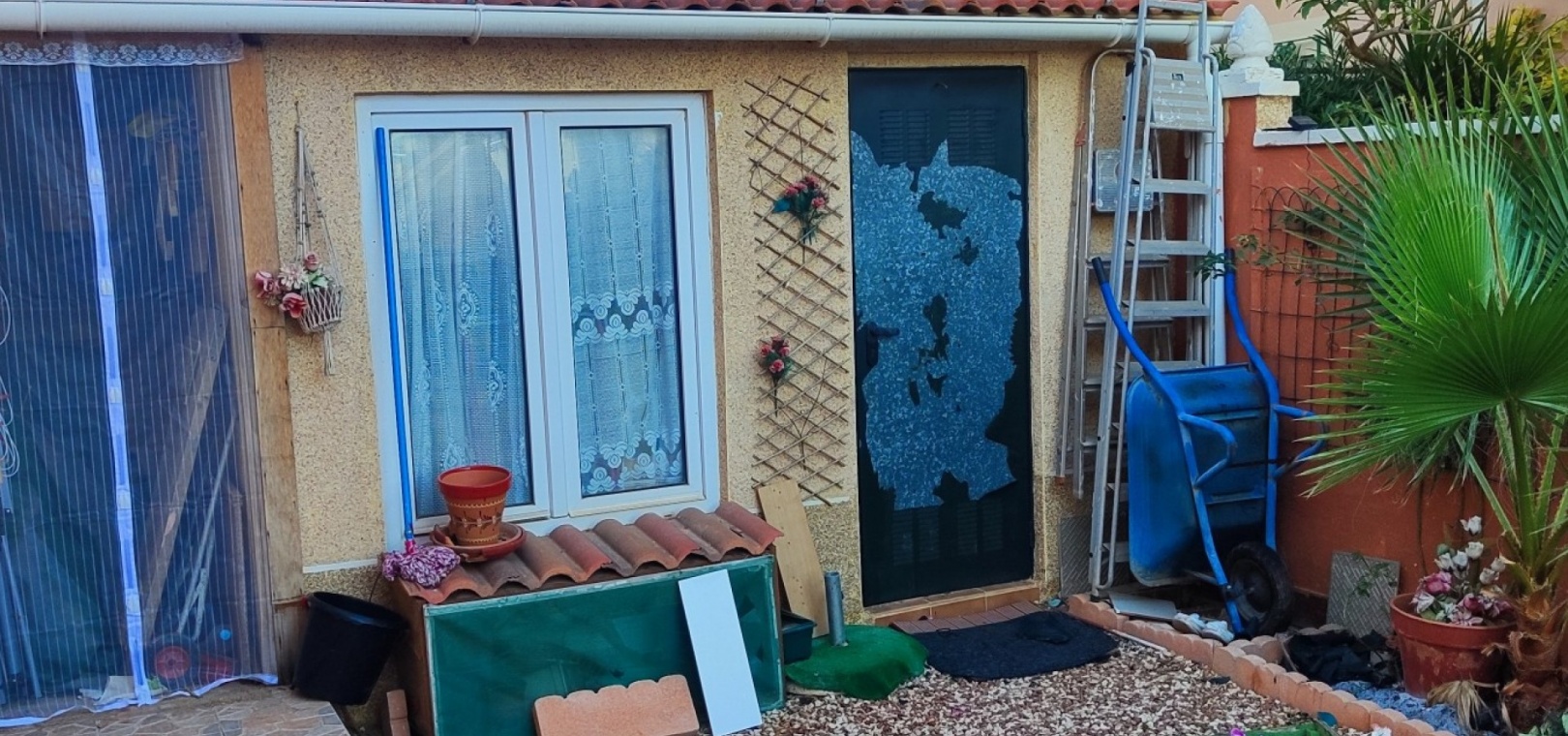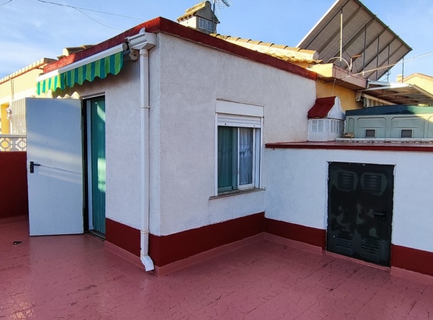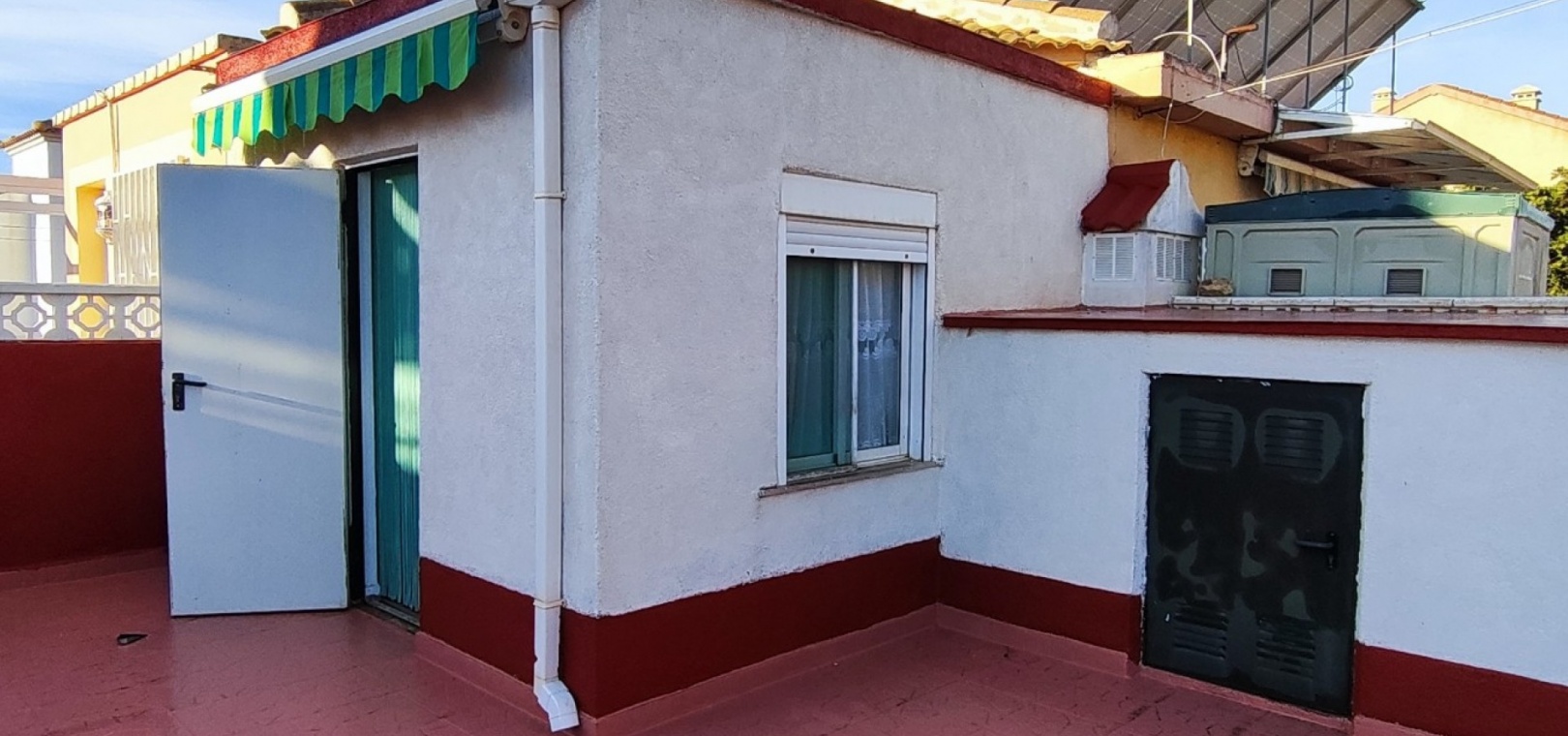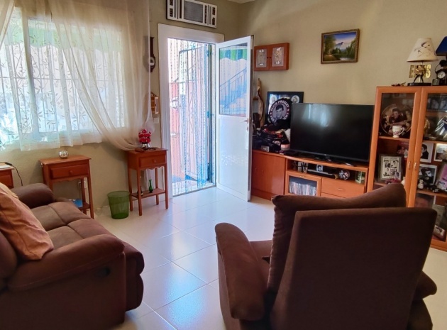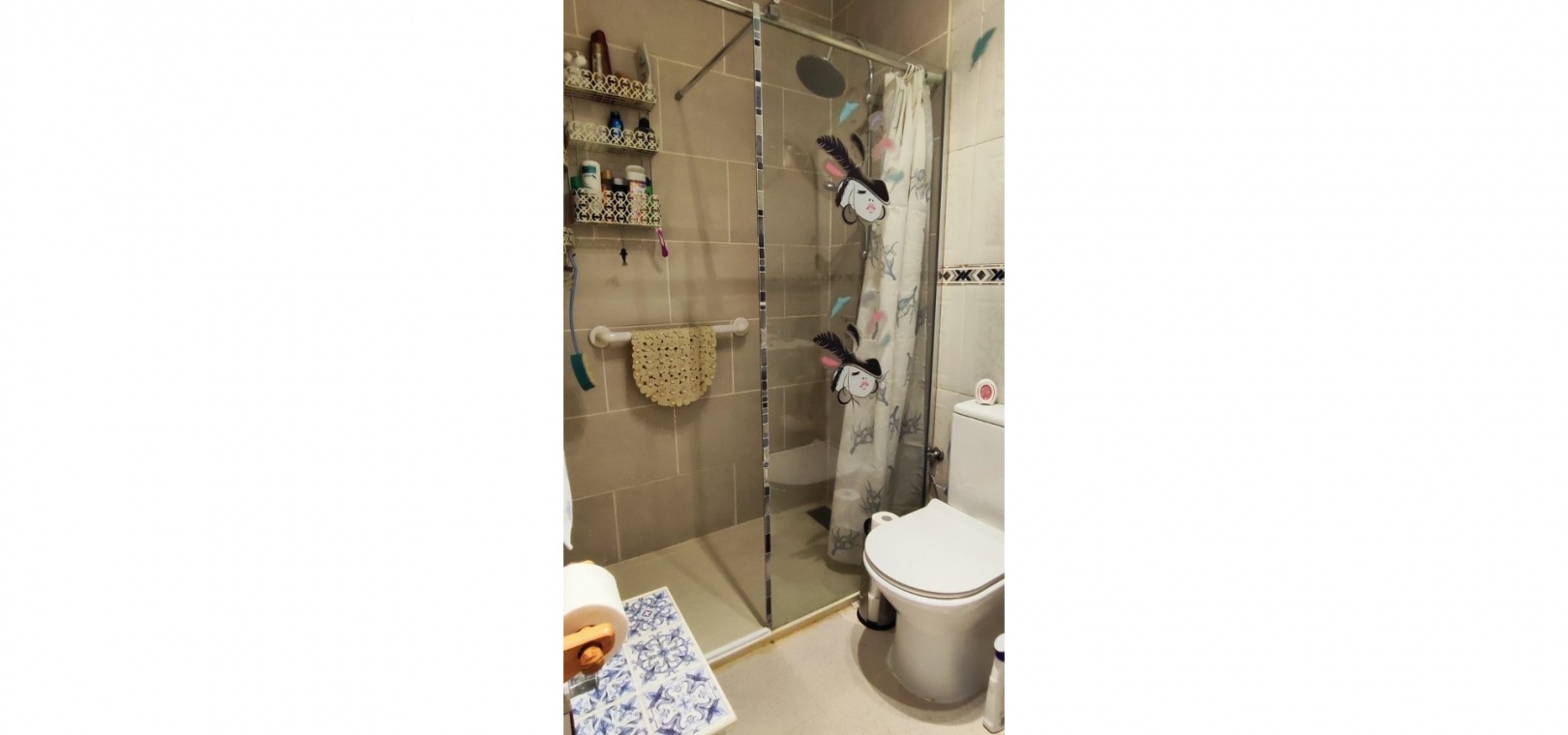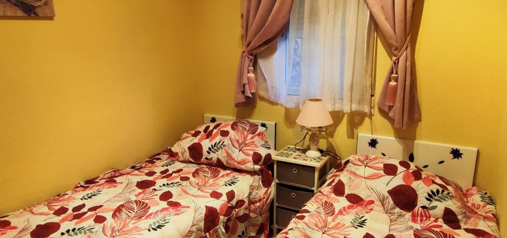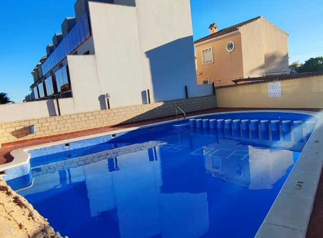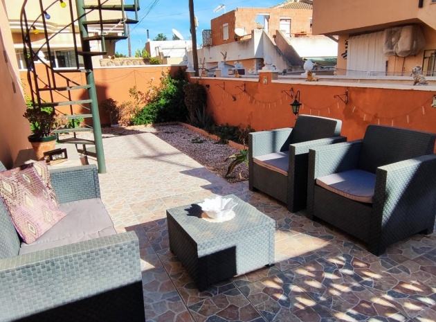 We are happy to introduce this quad style one level villa located close to Las Ramblas golf course on the Orihuela Costa, South Costa Blanca. Situated just 45 minutes drive to both Alicante or Murcia airport and within walking distance to a local supermarket, bars and restaurants and only a short drive or cycle to the beaches of Cabo Roig and Dehesa de Campomor.The property is found within the community so there is no direct car access but street parking is just 2 properties away. There are a few steps beyond the main entrance gate that lead you up onto the flat plot where we find a patio area with outside seating and a garden mainly laid to gravel with a selection of Mediterranean plants bordering the plot. Inside we find an open plan living room with a fitted modern kitchen. There are 2 double bedrooms, one larger master bedroom with ample wardrobe space and a twin room with small storage cupboard. The bathroom has been changed to have a walking shower, vanity unit and W.C.There is a 3rd bedroom/storage room on the roof that is accessed via a spiral staircase, this room currently has 2 single beds and a sofa as well as the washing machine so it would be possible to add a small shower room here for guests as there is already plumbing. The solarium is a great area for sunbathing, the floor has recently been resealed and thee is also a large storage cupboard. Within the garden area there is a brick built shed/tool room. The property will be sold furnished.
