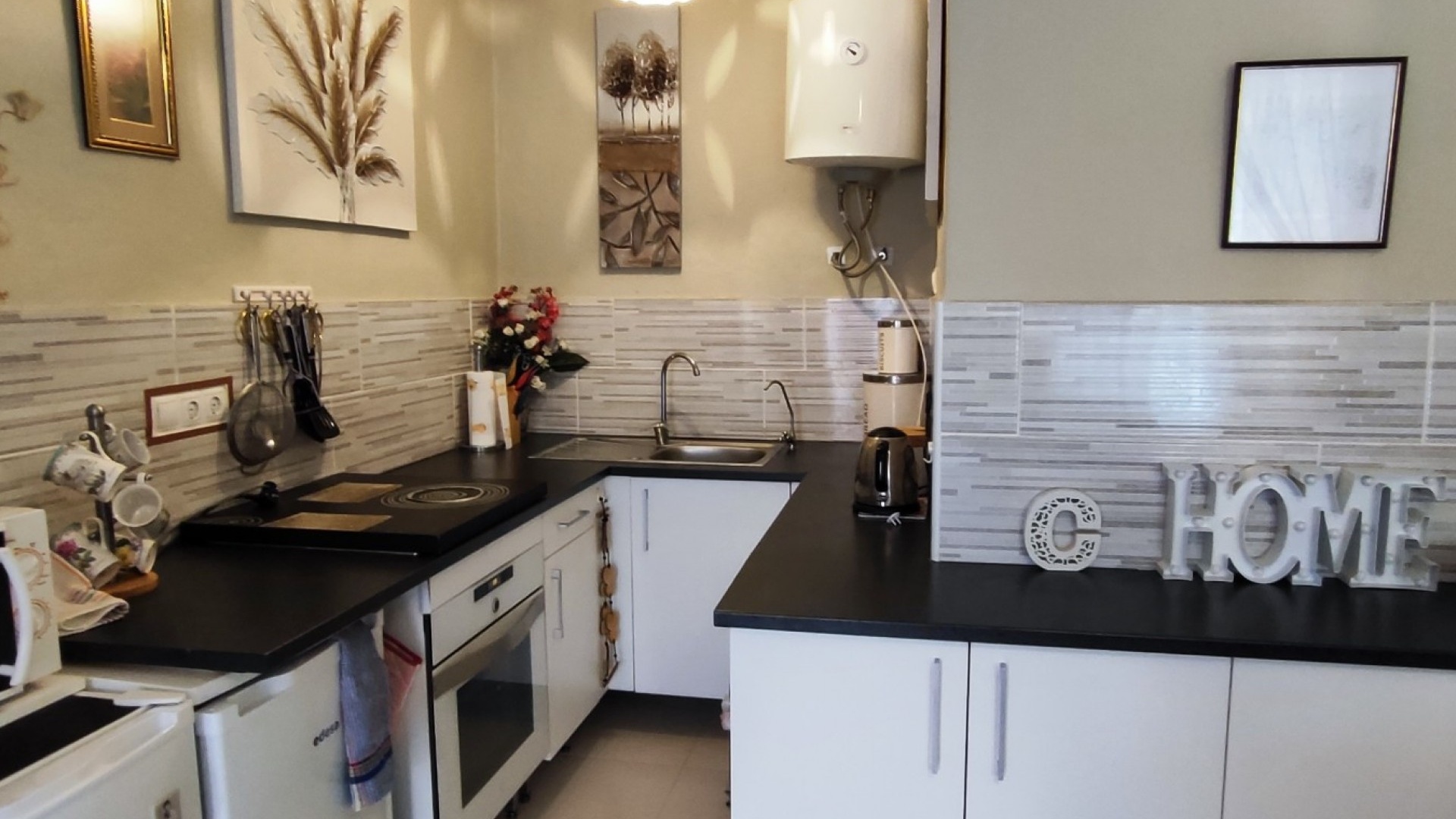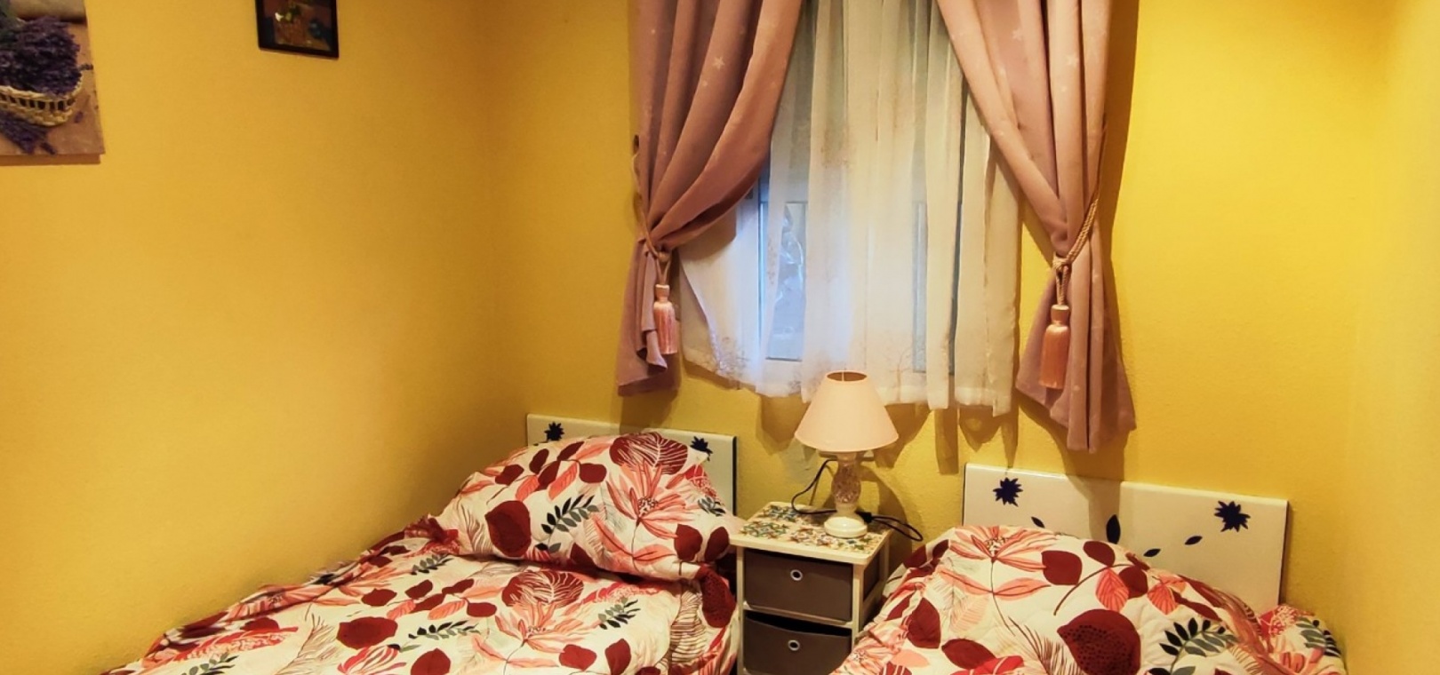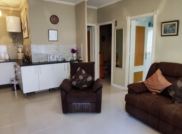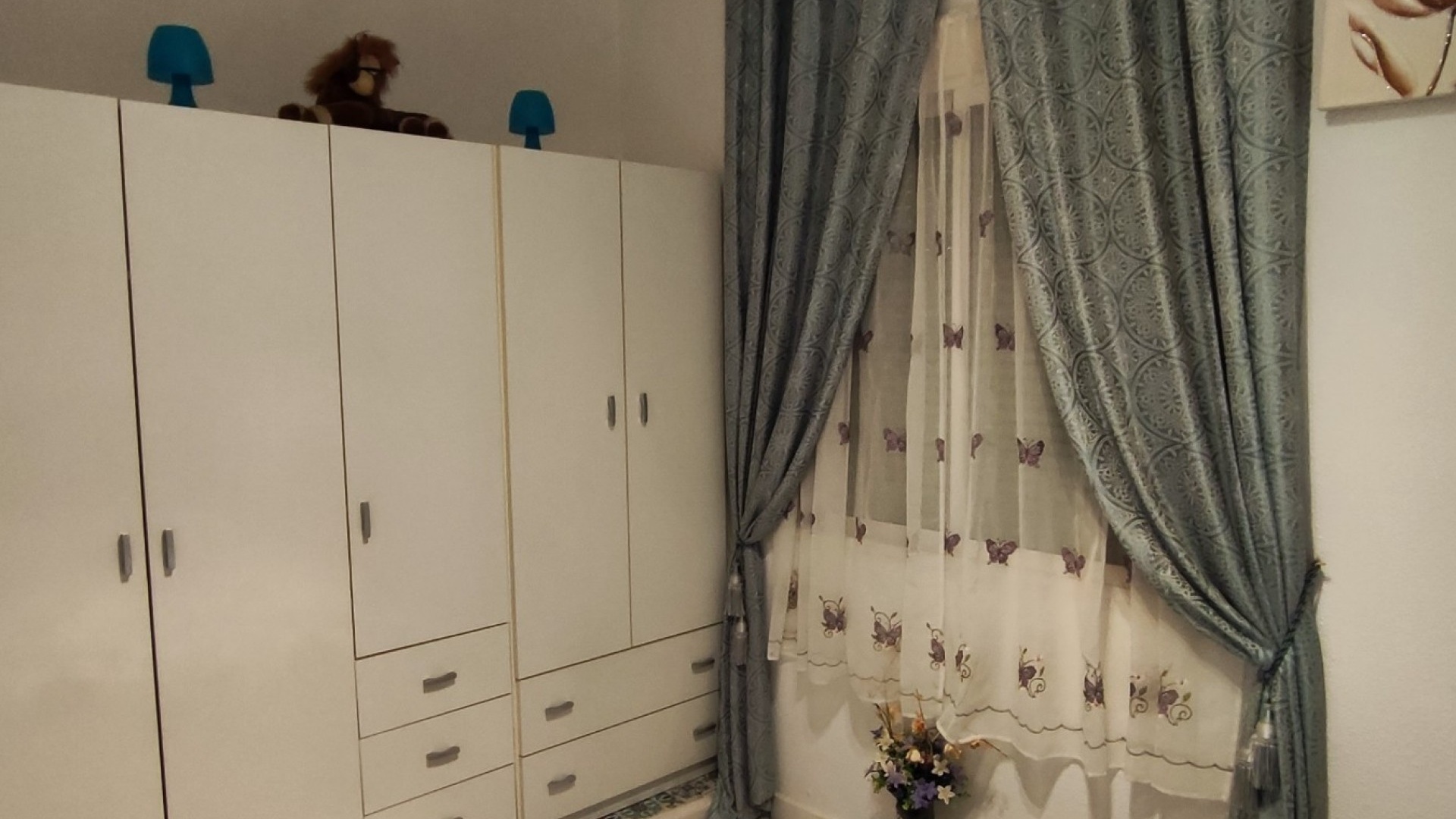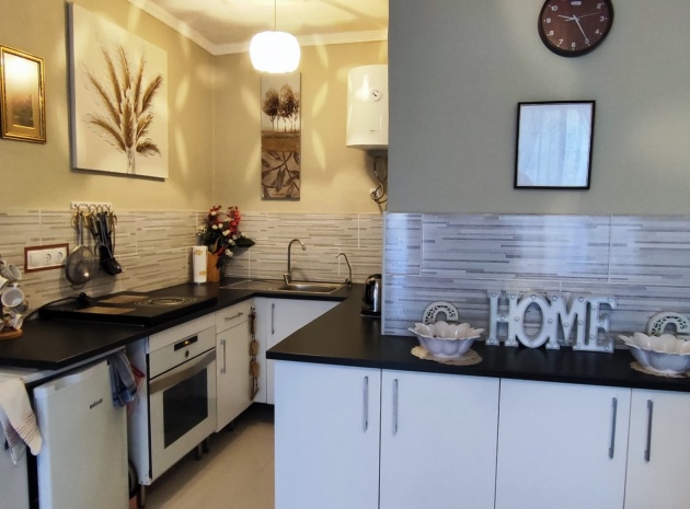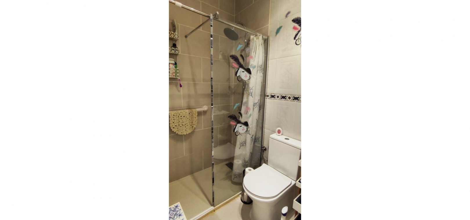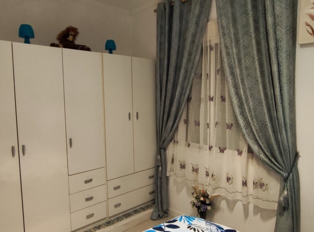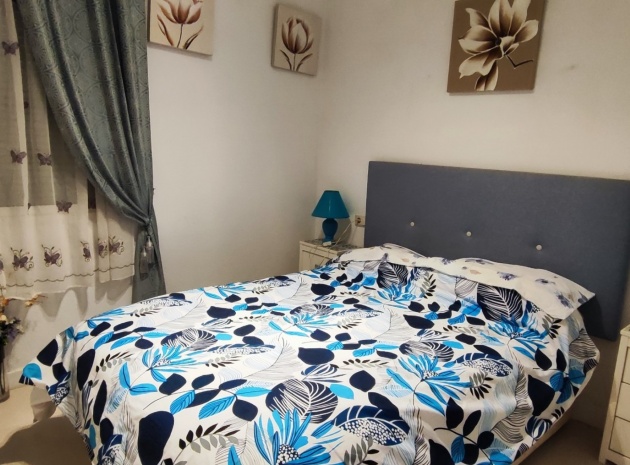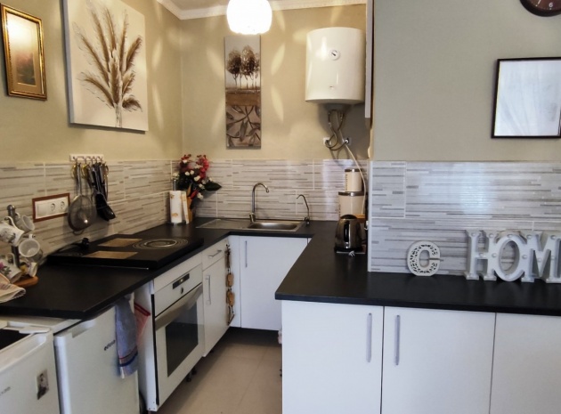 We are happy to introduce this quad style one level villa located close to Las Ramblas golf course on the Orihuela Costa, South Costa Blanca. Situated just 45 minutes drive to both Alicante or Murcia airport and within walking distance to a local supermarket, bars and restaurants and only a short drive or cycle to the beaches of Cabo Roig and Dehesa de Campomor.The property is found within the community so there is no direct car access but street parking is just 2 properties away. There are a few steps beyond the main entrance gate that lead you up onto the flat plot where we find a patio area with outside seating and a garden mainly laid to gravel with a selection of Mediterranean plants bordering the plot. Inside we find an open plan living room with a fitted modern kitchen. There are 2 double bedrooms, one larger master bedroom with ample wardrobe space and a twin room with small storage cupboard. The bathroom has been changed to have a walking shower, vanity unit and W.C.There is a 3rd bedroom/storage room on the roof that is accessed via a spiral staircase, this room currently has 2 single beds and a sofa as well as the washing machine so it would be possible to add a small shower room here for guests as there is already plumbing. The solarium is a great area for sunbathing, the floor has recently been resealed and thee is also a large storage cupboard. Within the garden area there is a brick built shed/tool room. The property will be sold furnished.
