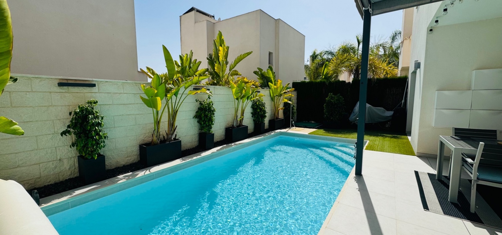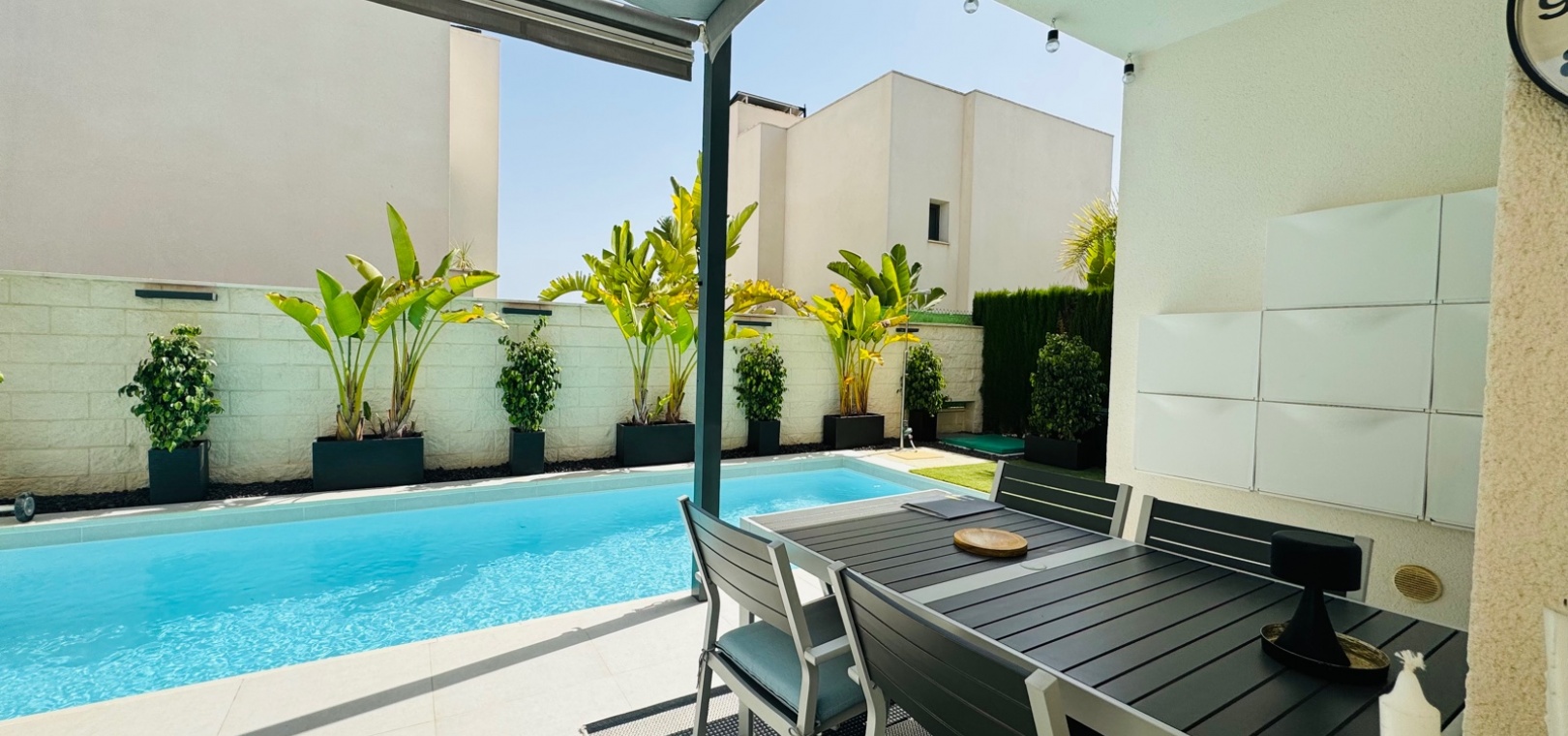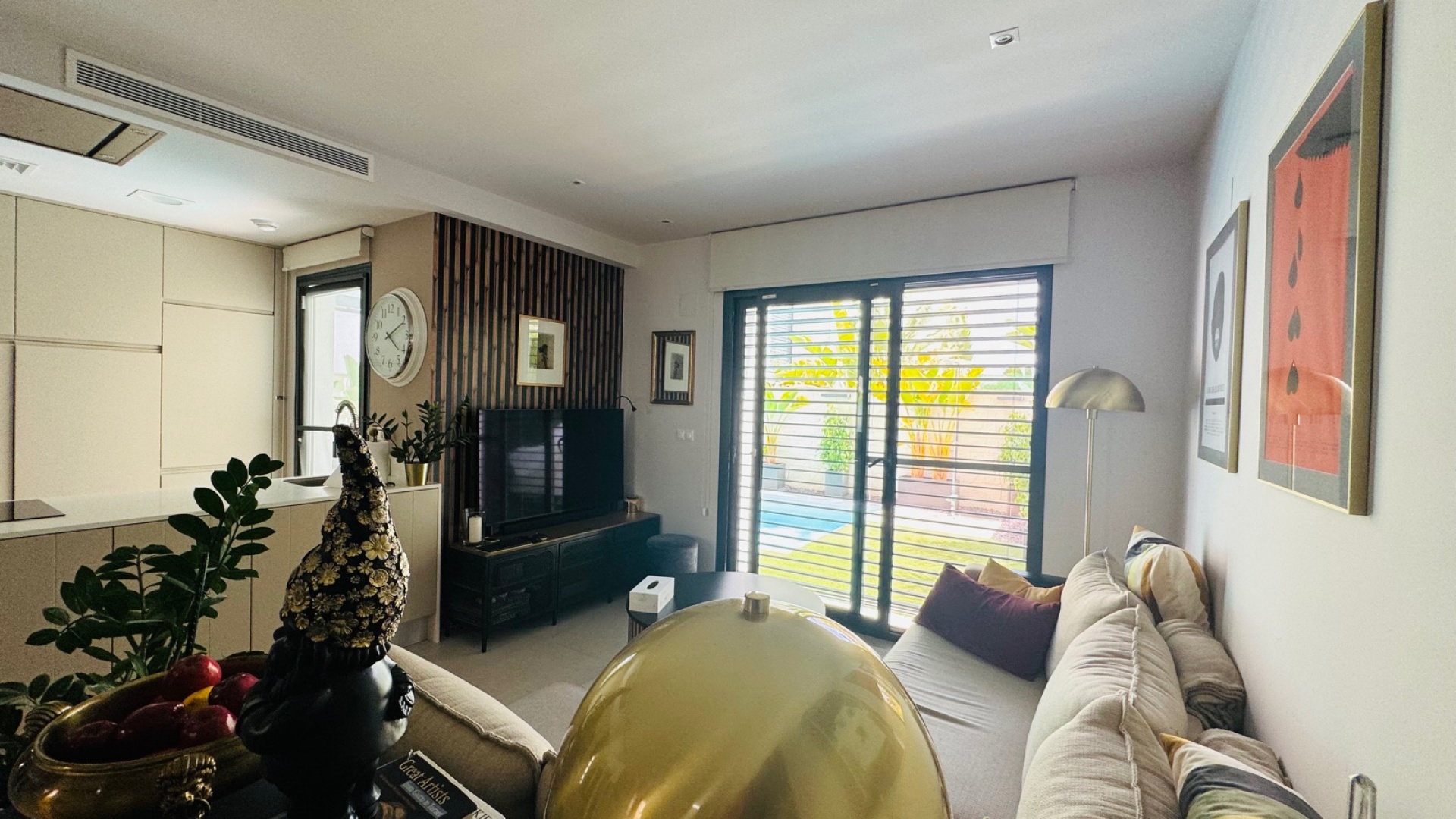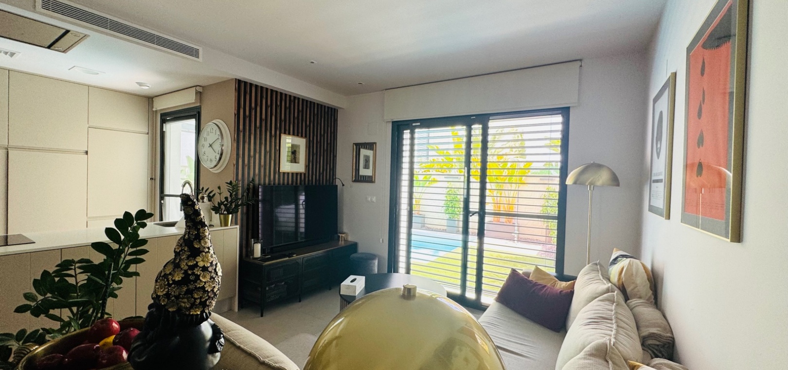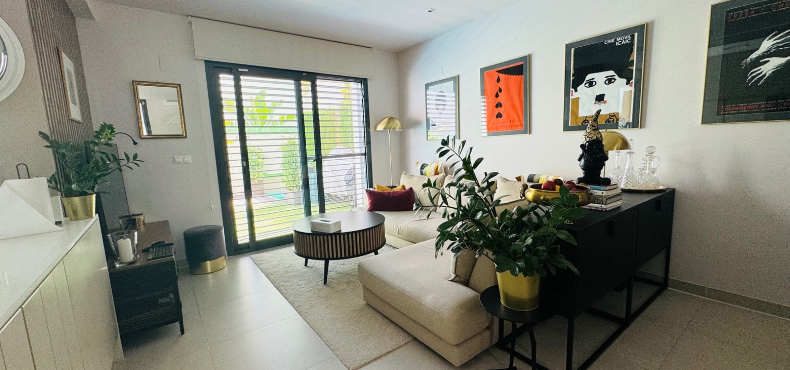 We are pleased to introduce this contemporary home that offers a spacious and bright living room with direct access to the garden and pool area. The open-plan kitchen is fully equipped with modern appliances and high-quality finishes. Both bedrooms are generously sized and come with built-in wardrobes, while the two stylish bathrooms are fitted with modern fixtures and walk-in showers.The outdoor space is perfect for relaxation and entertainment, featuring a beautifully landscaped garden, a heated pool, and ample space for lounging and al fresco dining. The property also includes a private parking spot for your convenience. Situated in the peaceful and desirable Pueblo Bravo area, this home offers both tranquility and easy access to local amenities and the vibrant center of Ciudad Quesada.