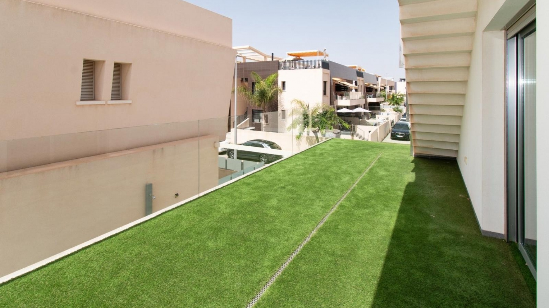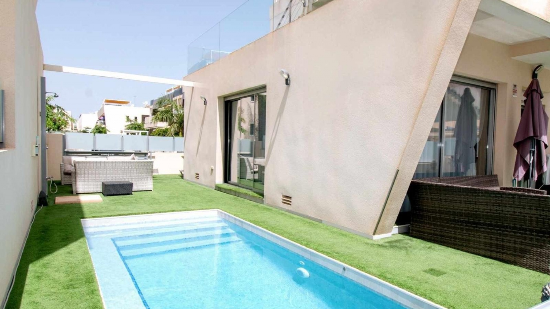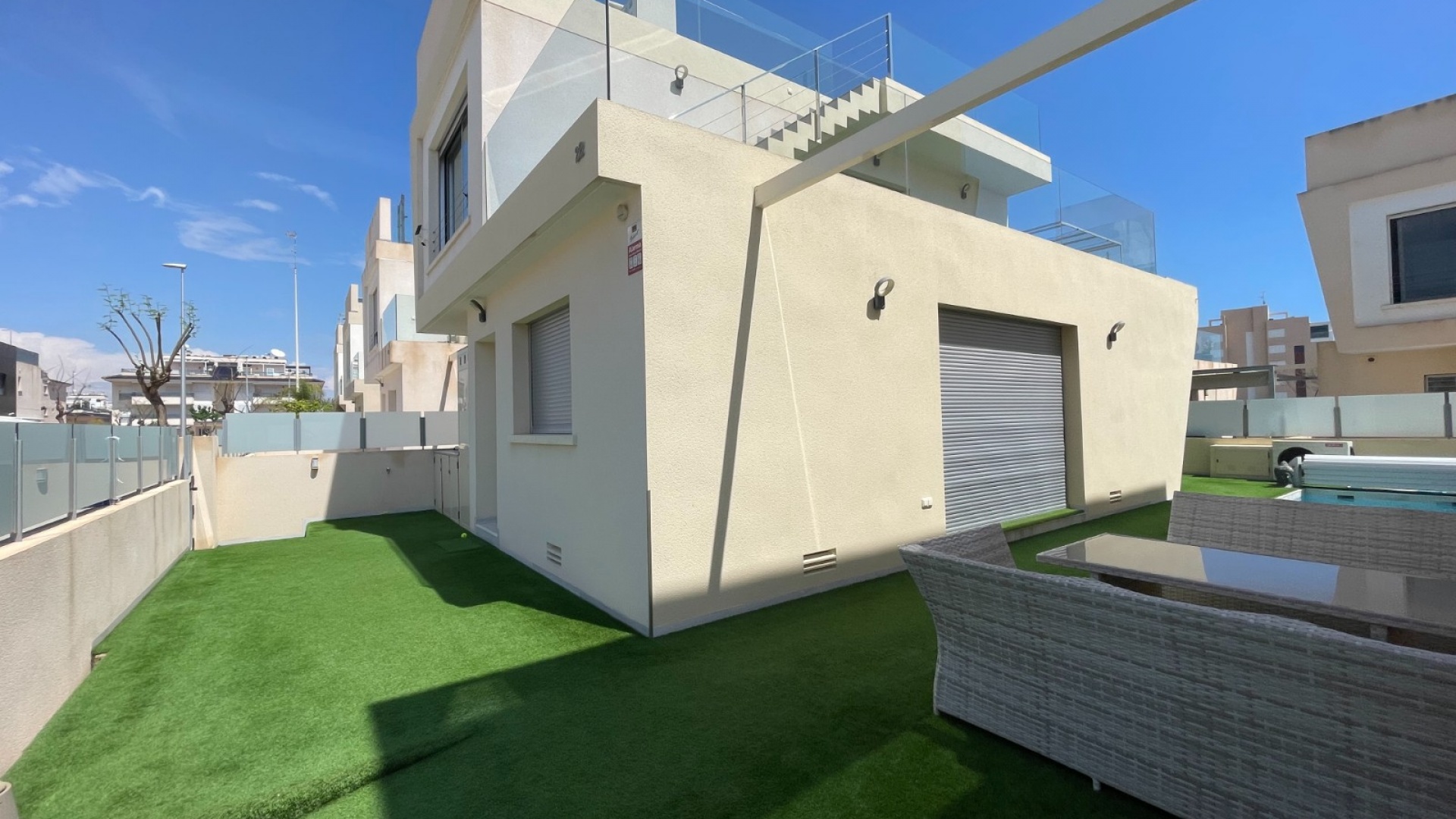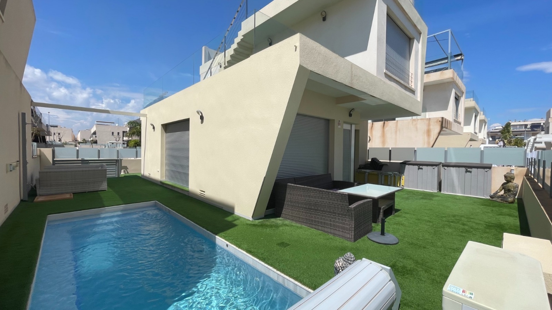 This East Facing, Three Bedroom Detached Villa in Mil Palmeras is located just 150 metres from the stunning sea front and beaches of Mil Palmeras, within walking distance to a range of local amenities and facilities. This modern, high-quality property, built in 2019, boasts 3 bedrooms and 3 shower rooms (2 en suite), all with fitted wardrobes. Air zone air conditioning throughout ensures comfort, while the open plan kitchen with a feature island and Siemens white goods adds a luxurious touch. The villa also includes a utility room, off-road parking, and an artificial grassed garden, complemented by a covered terrace off the living room. The double-level solarium offers spectacular sea views, and the property features a separate private garage. A heated private swimming pool with a pool cover enhances the outdoor living space, while the villa is sold fully furnished with a security door for added peace of mind. With a build size of 120m² on a 320m² plot, this property offers many extras and is located just a five-minute drive from Orihuela Costa in Costa Blanca South.