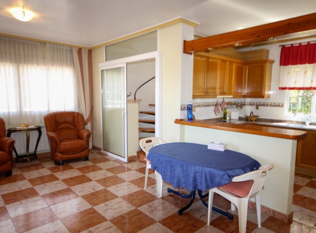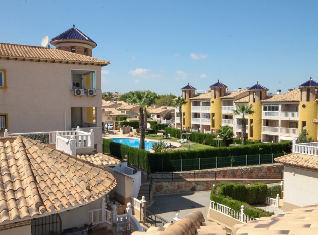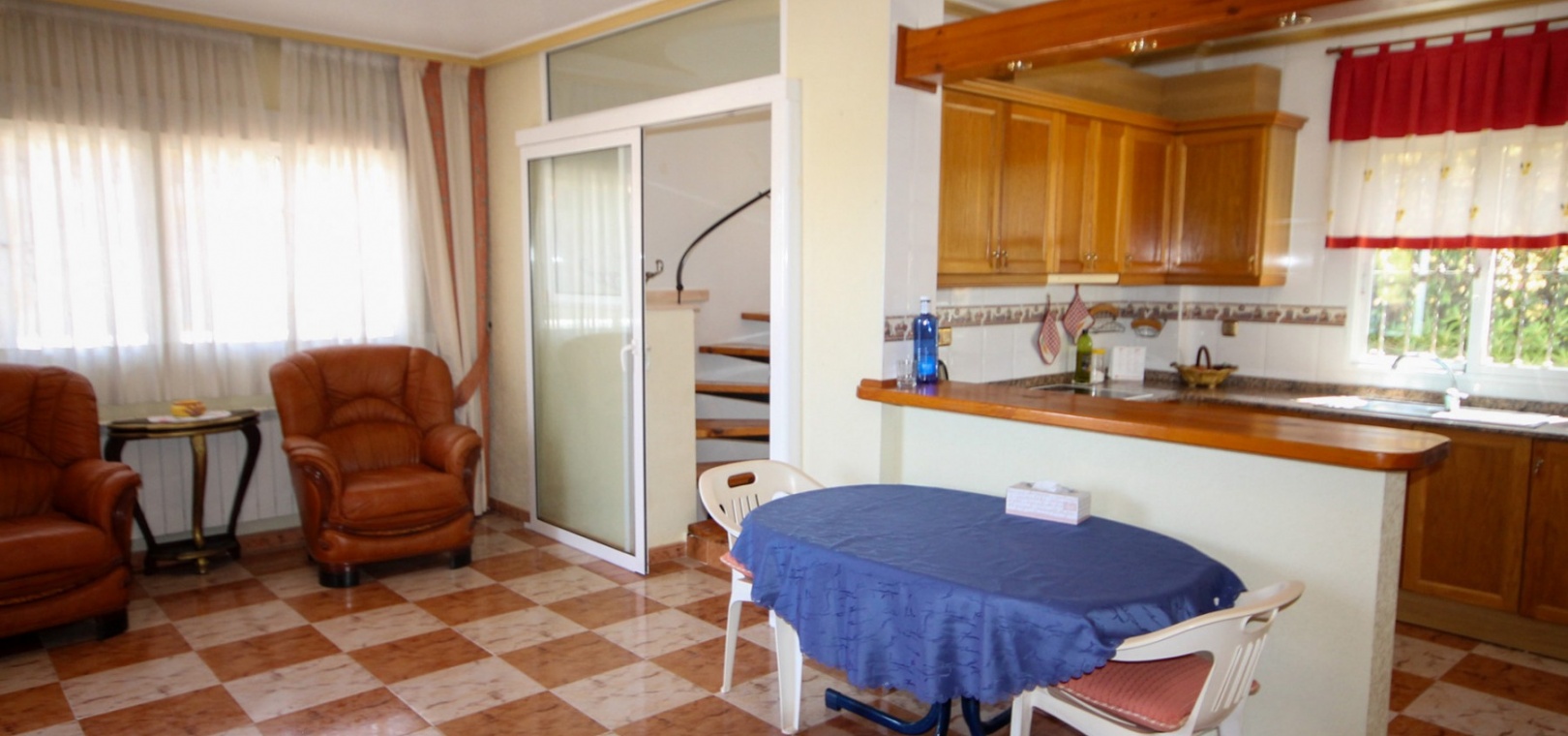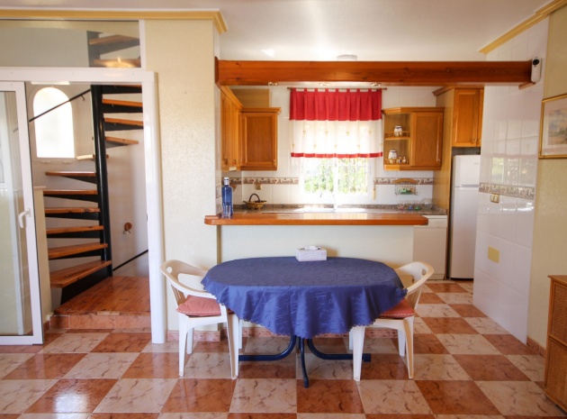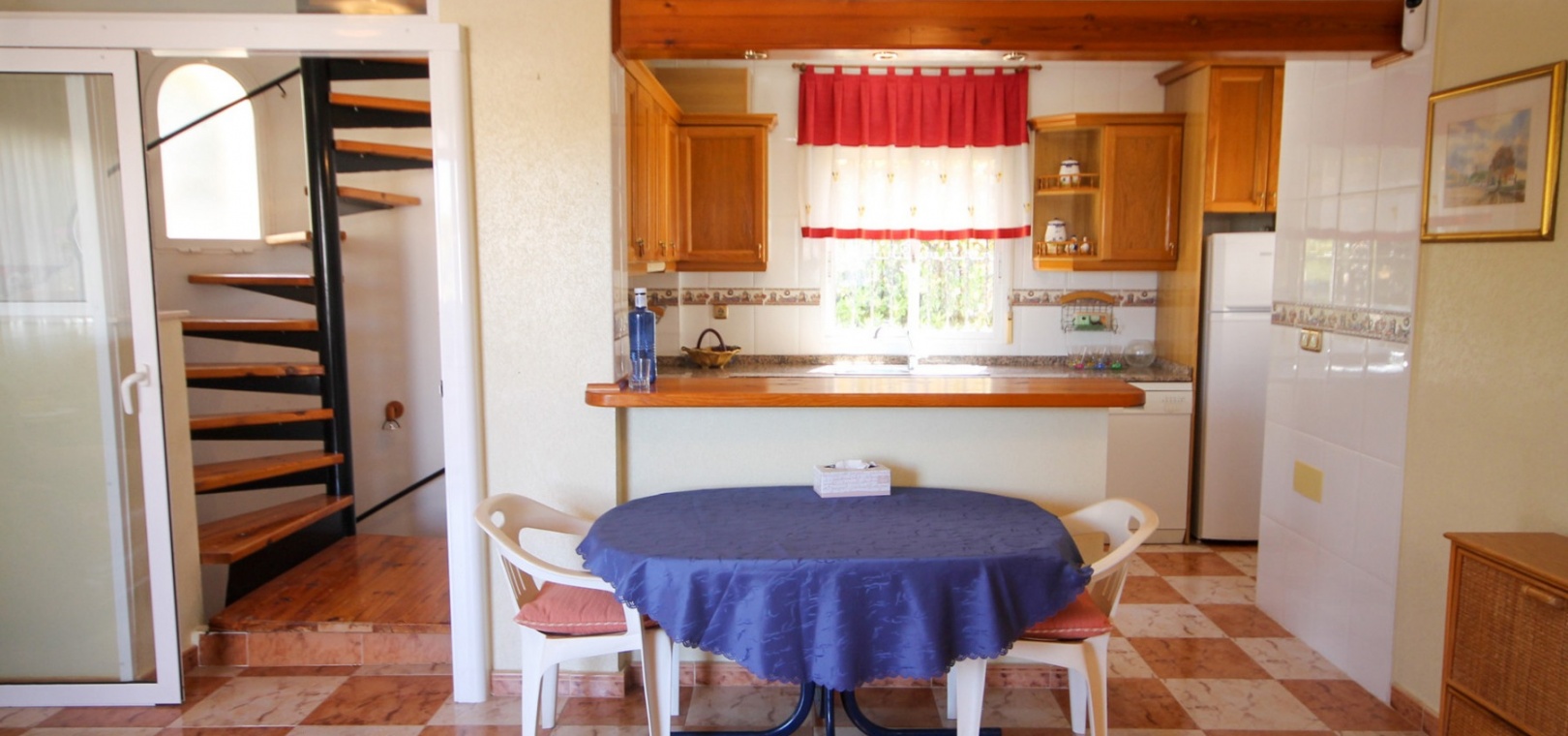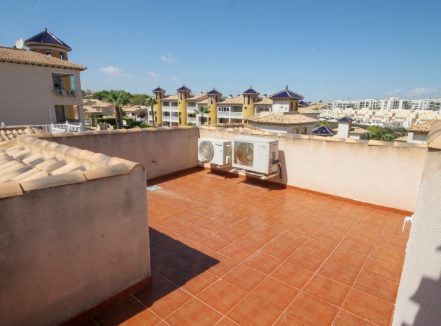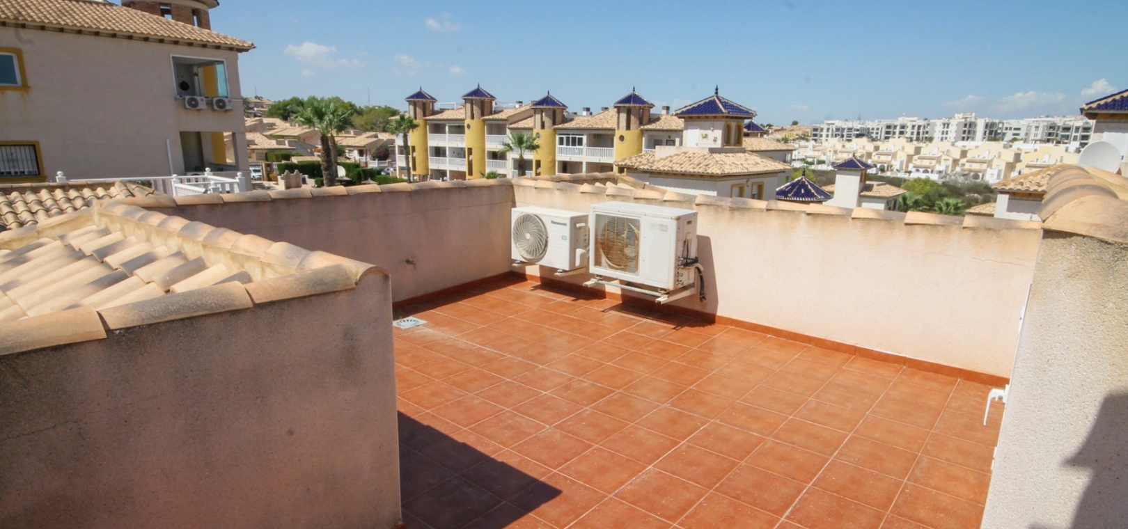 A large terrace opens into the lounge diner with a spacious open plan kitchen adjacent. Just off the lounge is a family shower room, and two double bedrooms with fitted wardrobes. The master bedroom having a spacious en-suite bathroom. A spiral staircase leads up to the roof solarium enjoying lovely views of the urbanisation and distant sea views. There is also a small storage room.