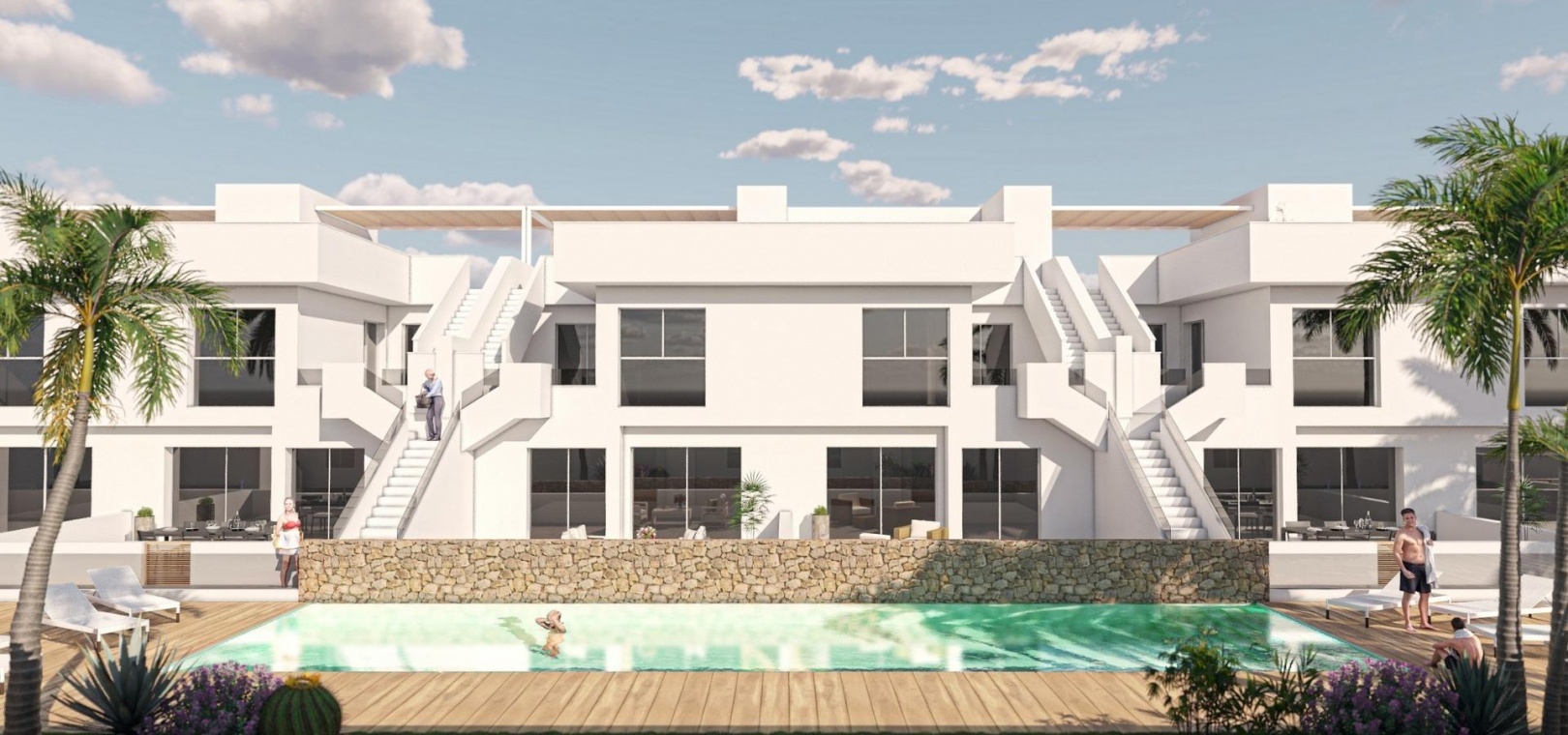 This new development offers 16 stylish bungalows in the desirable town of Pilar de la Horadada, located in the southernmost part of Costa Blanca. Choose between 2 or 3-bedroom options, each featuring 2 bathrooms. Ground-floor units come with spacious front and rear terraces, providing direct access to the communal pool and garden, while top-floor units boast a large private rooftop solarium.