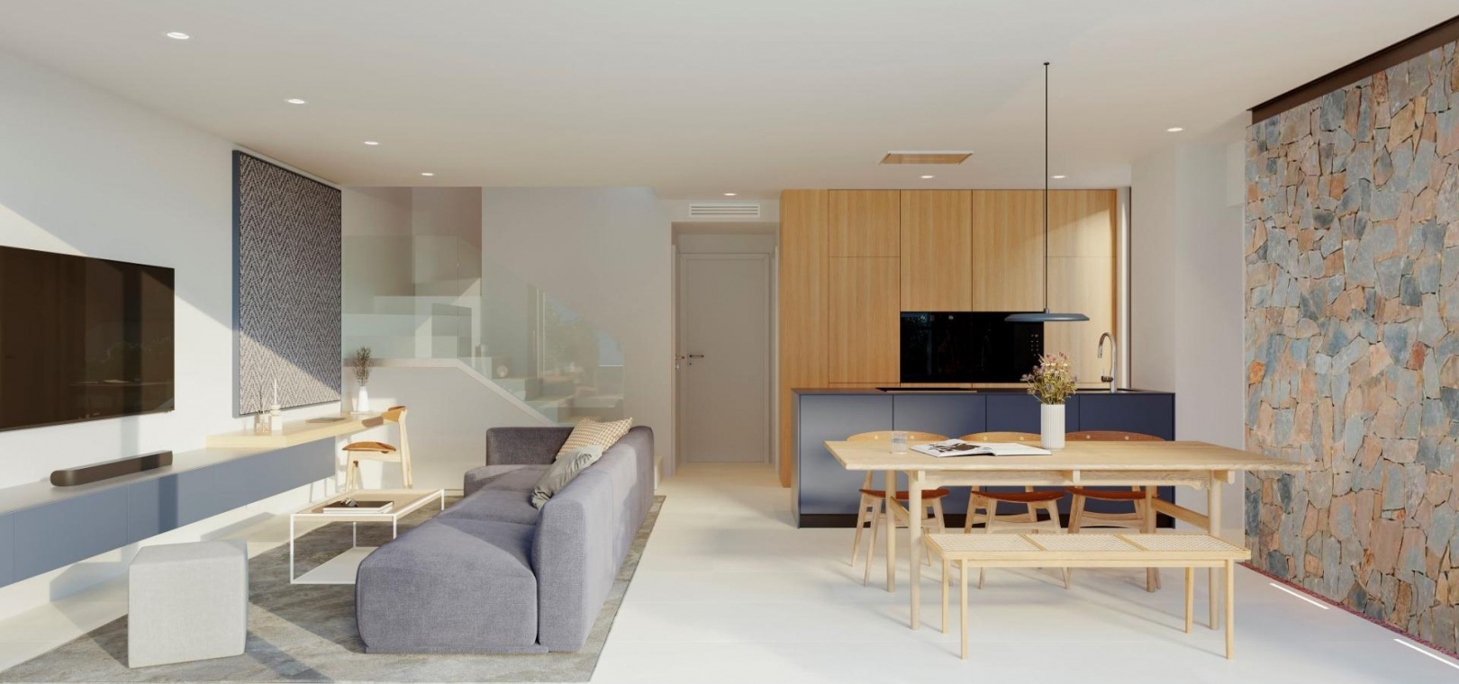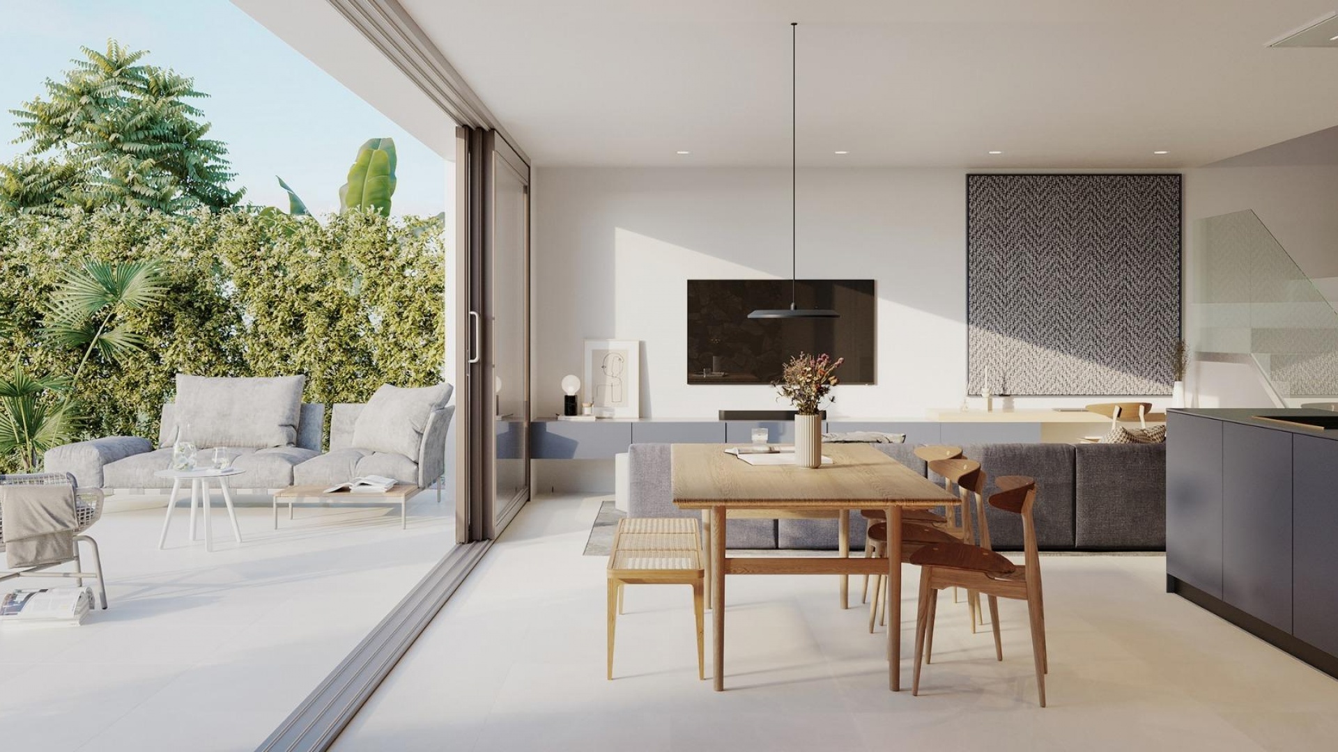 Each villa is thoughtfully designed across three floors, providing ample space and a comfortable layout. With 2 or 3 bedrooms, 2 bathrooms, these homes are ideal for families and couples alike. The open-plan kitchen flows seamlessly into the dining and living areas, creating a bright, airy atmosphere. Key features include fitted wardrobes, a private basement, optional solarium, and a private garden with an optional swimming pool and parking space.