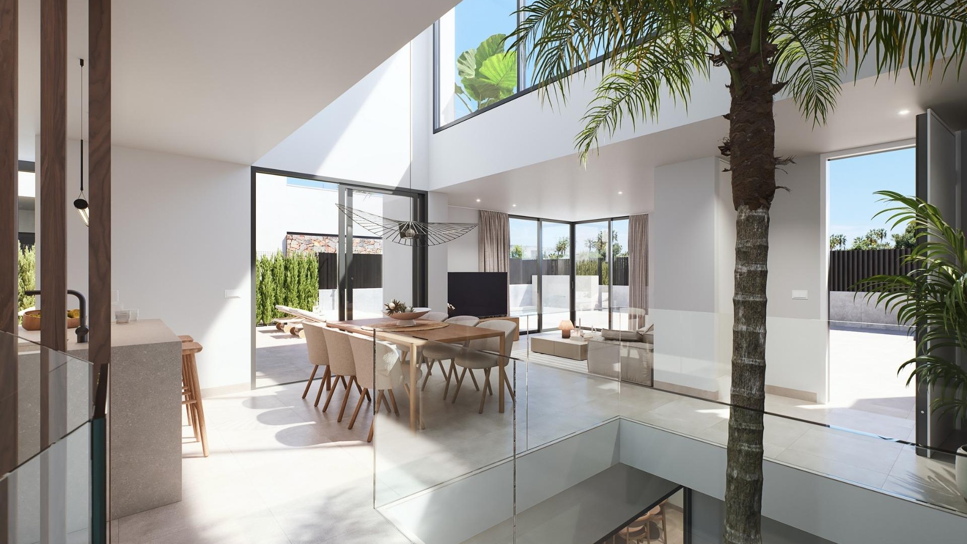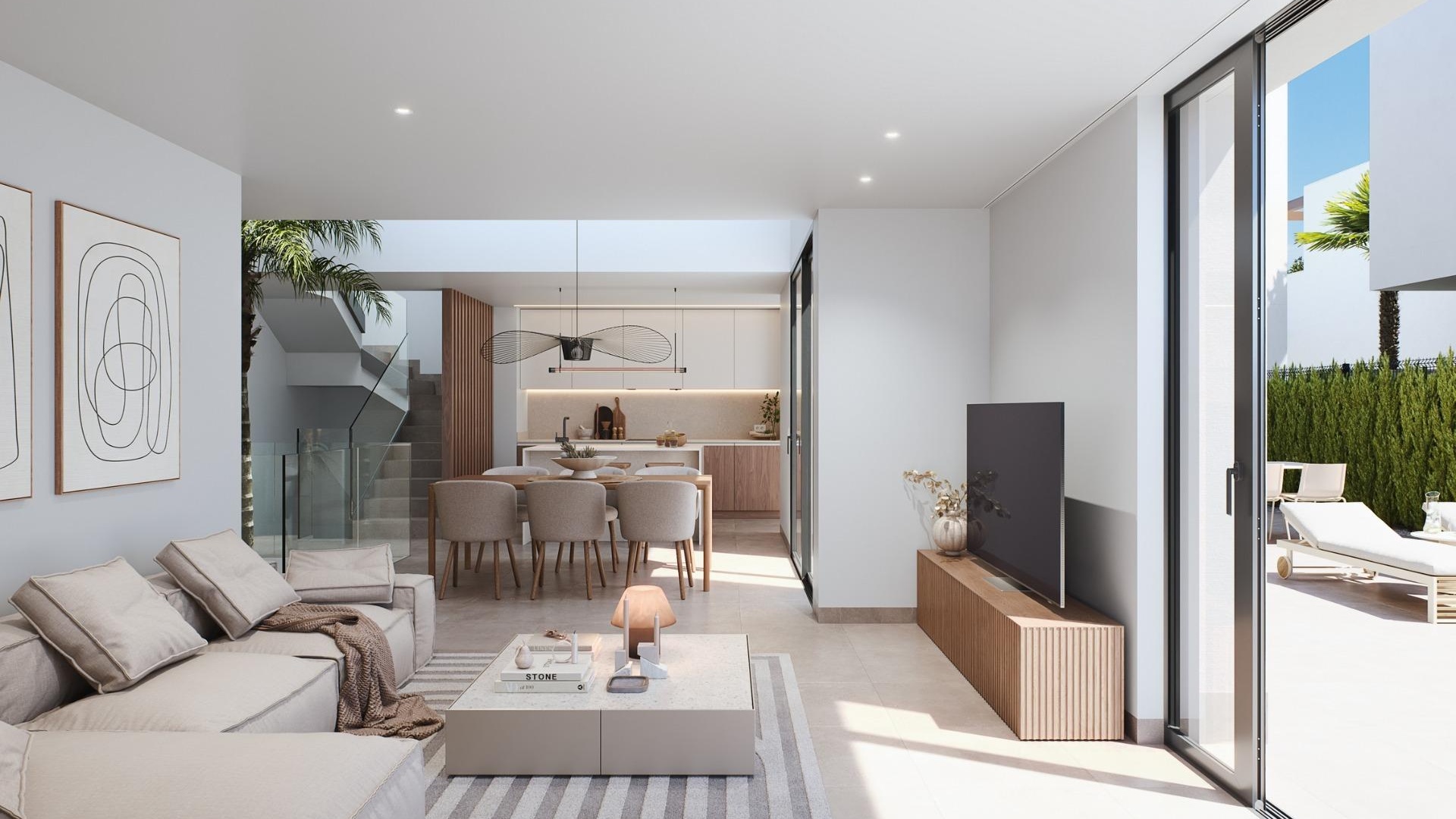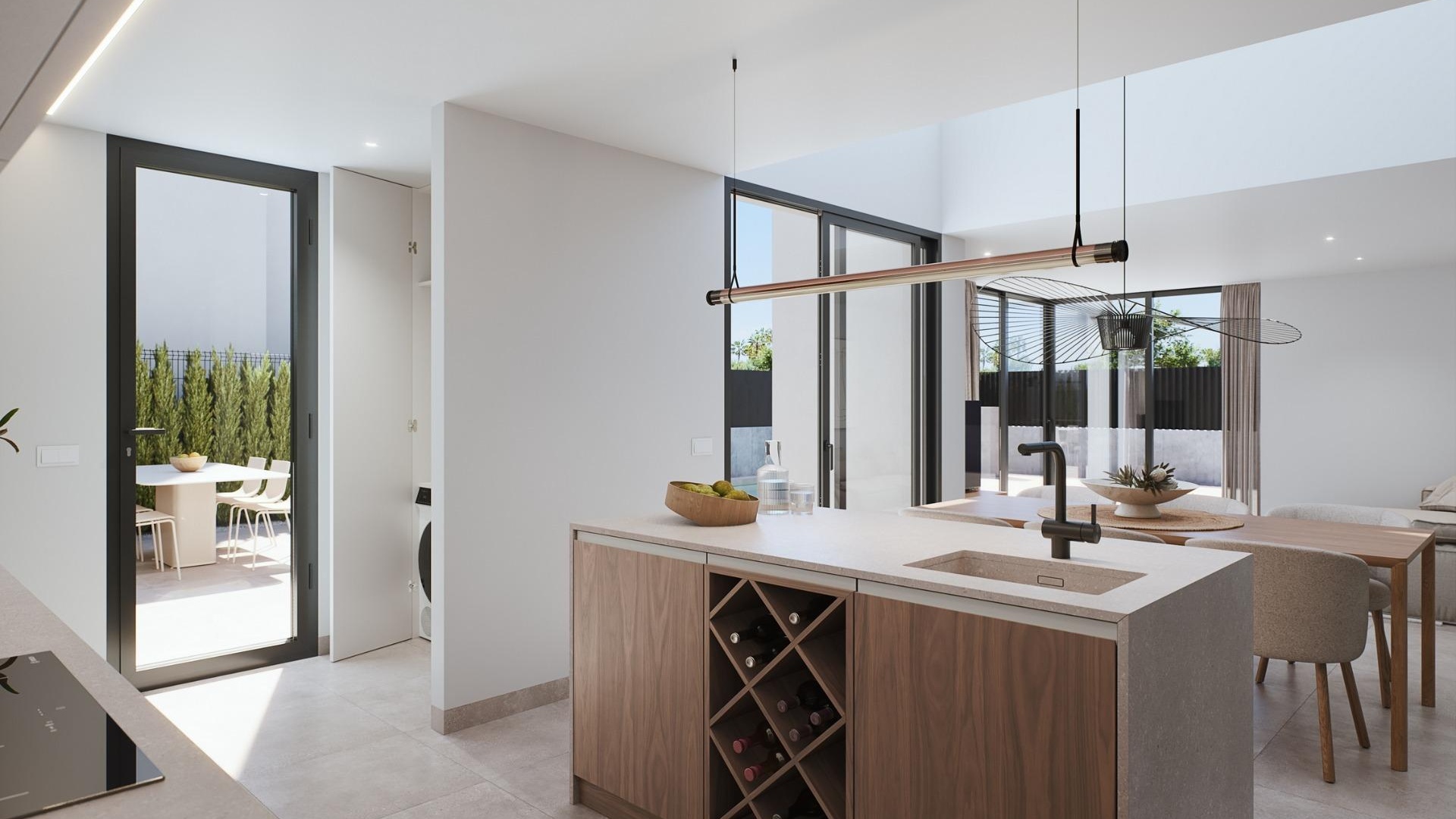 Each villa is thoughtfully designed across three floors, providing ample space and a comfortable layout. With 3 bedrooms, 2 bathrooms, and an additional guest toilet, these homes are ideal for families and couples alike. The open-plan kitchen flows seamlessly into the dining and living areas, creating a bright, airy atmosphere. Key features include fitted wardrobes, a private basement, solarium, and a private garden with a swimming pool and parking space. Enjoy panoramic views and the beautiful Murcia climate from the solarium, which is pre-fitted for an outdoor kitchen, jacuzzi, and solar panels.