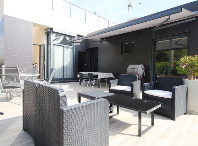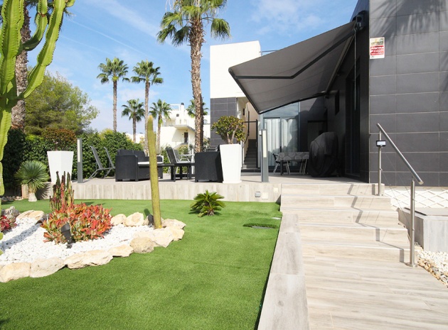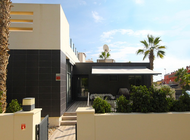 A South West facing 2 bed 2 bath modern style semi detached villa with views to the communal swimming pool located in La Fuente, Villamartin, Costa Blanca.