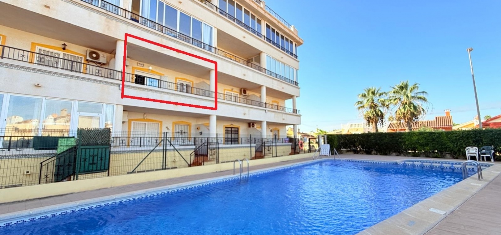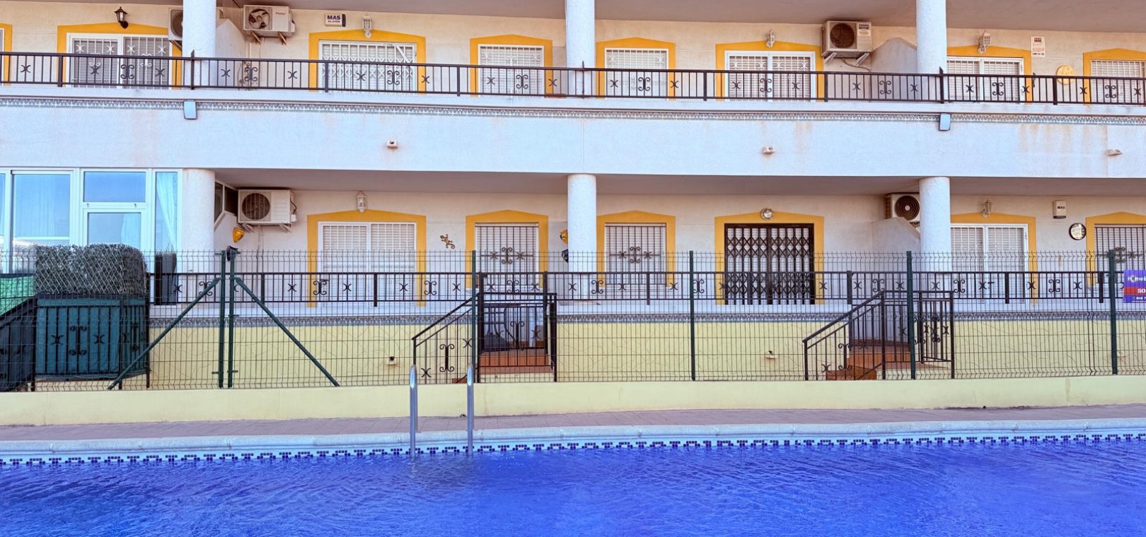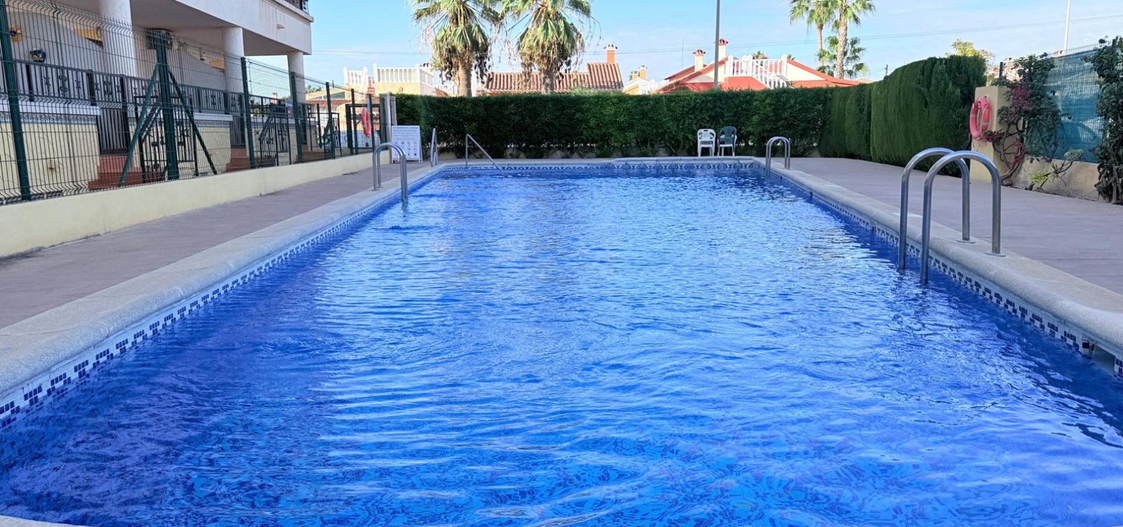 A 2 bed 1 bath 1st floor apartment with views to the communal swimming pool located in Res. La Mirada, Playa Flamenca, Costa Blanca.