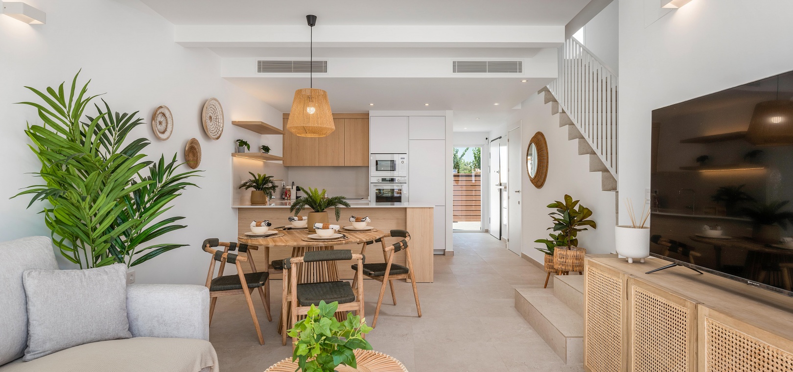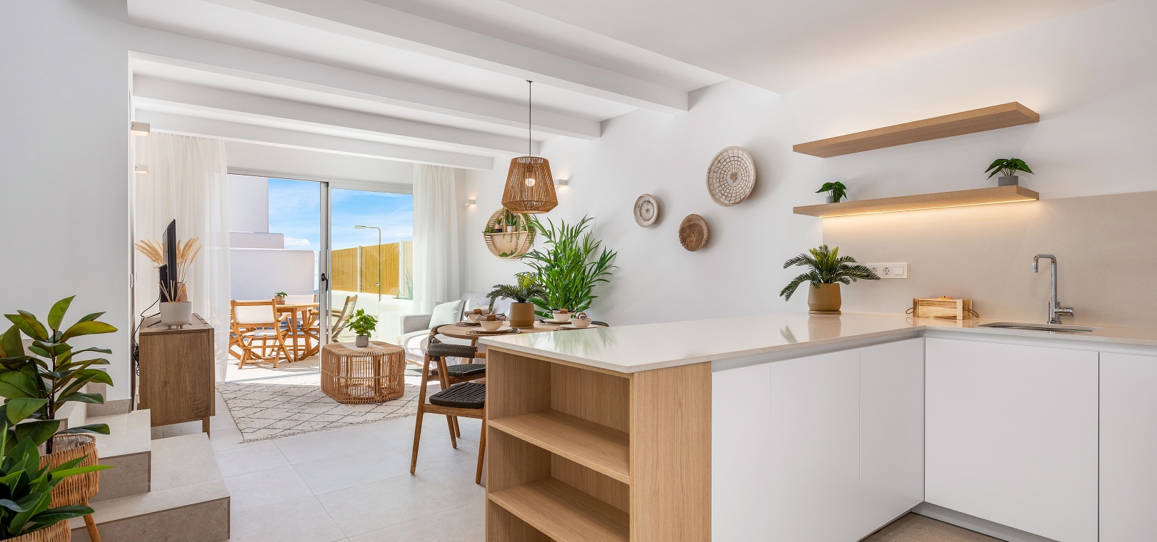 Lounge / diner, open plan fitted kitchen, 3 x double bedrooms, 2 x bathrooms, large garden / terrace OR large private solarium, communal swimming pool,private parking space with storage & much more.