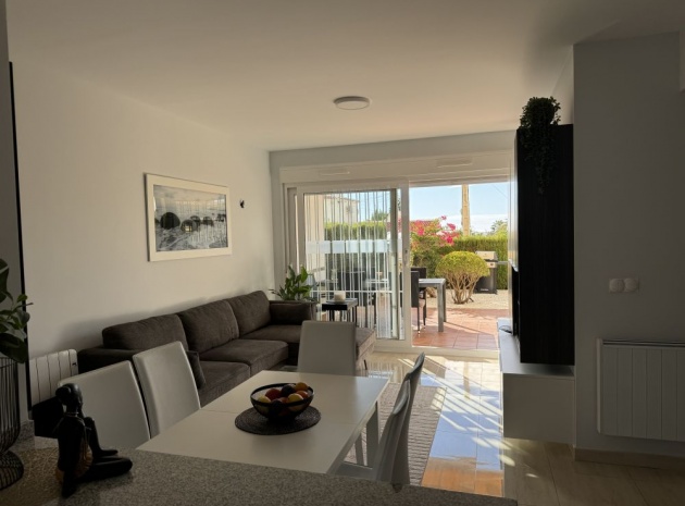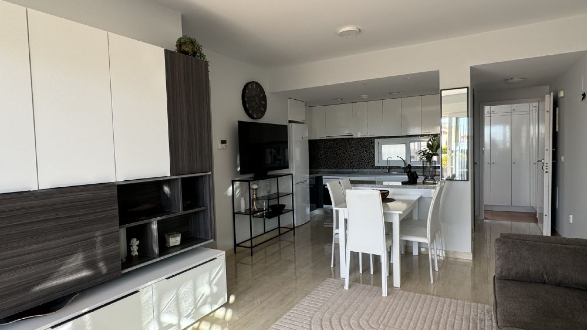 Lounge/diner with doors onto the front terrace with a sun awning & garden area, open plan fully fitted kitchen, 2 x bedrooms with fitted wardrobes, the main bedroom has an en suite shower room, 1 x guest shower room, communal swimming pool, communal parking, secure gated communitty & much more.
