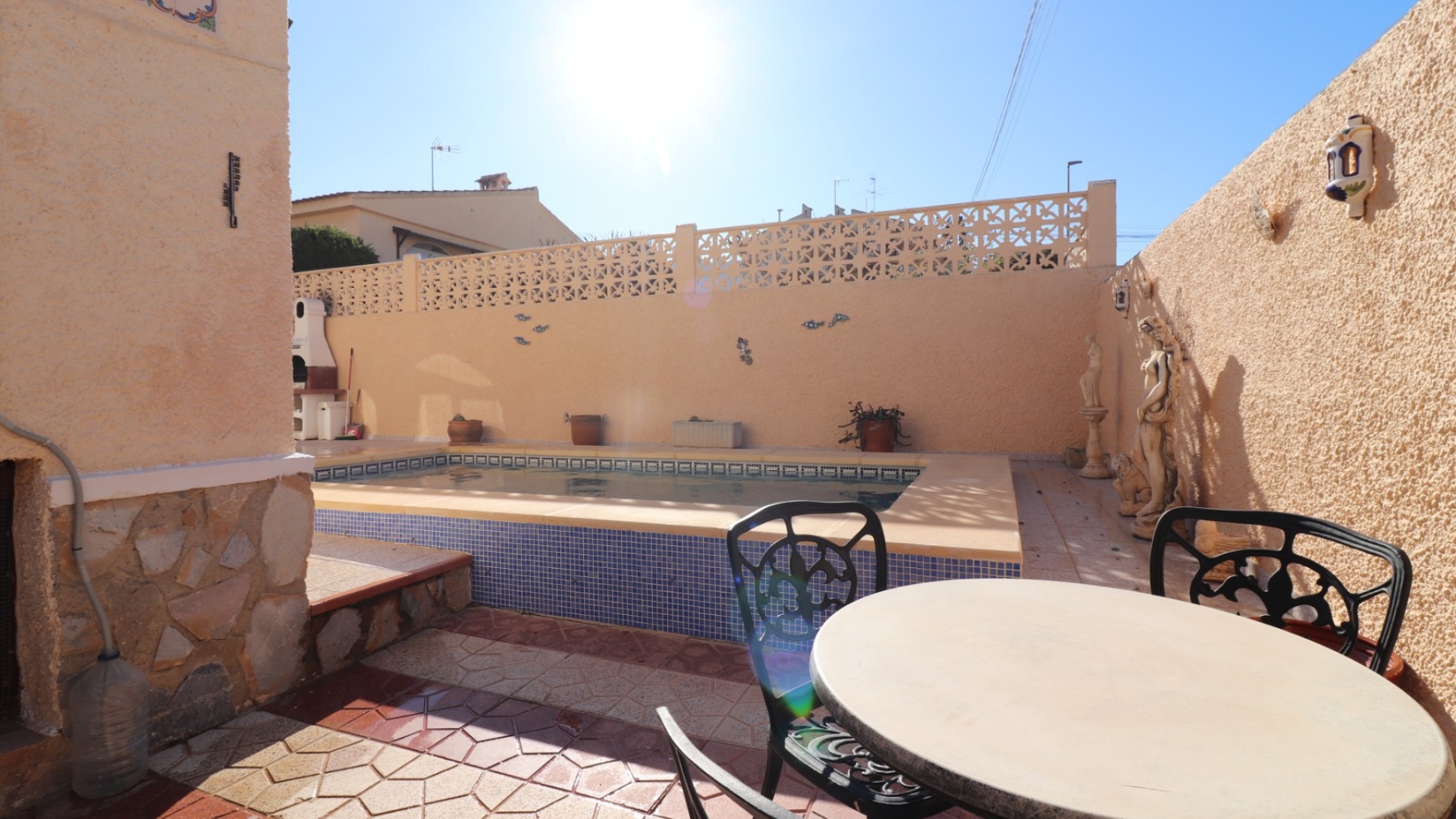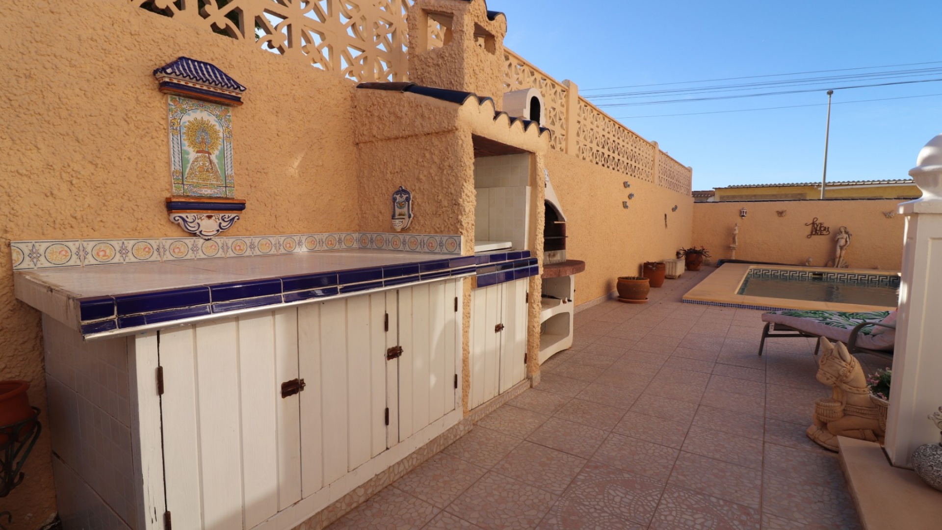 This South West Facing, Four Bedroom, Detached Villa in Benijofar with underbuild, is located within a desirable area, just a five-minute walk to a wide range of amenities, including a sports ground, school, medical centre, pharmacy, and a commercial centre featuring McDonald’s and an array of eating places and café bars. Additionally, there are a couple of main chain supermarkets nearby. La Marquesa golf course is only a five-minute drive away, and the beautiful Costa Blanca South coastline is approximately 12 minutes by car. This lovely presented villa boasts a covered and glazed-in entrance terrace leading into a cozy lounge with a feature fireplace and air conditioning. A wide arch connects the lounge to the dining area, which further leads through to a fitted kitchen. The main property includes two double bedrooms with built-in wardrobes, the master benefiting from air conditioning and an en suite bathroom. There is also a family shower room. The under build, accessed externally, offers additional accommodation with two double bedrooms (one with an en suite), another family shower room, a kitchenette, a utility area, and a storage area, providing great flexibility for guests or extended family. The exterior features a tiled garden with off-road parking, a private 3 x 6 pool, a BBQ and work area, and some planted borders. This is a fantastic opportunity for a permanent home or holiday retreat on the Costa Blanca South.
