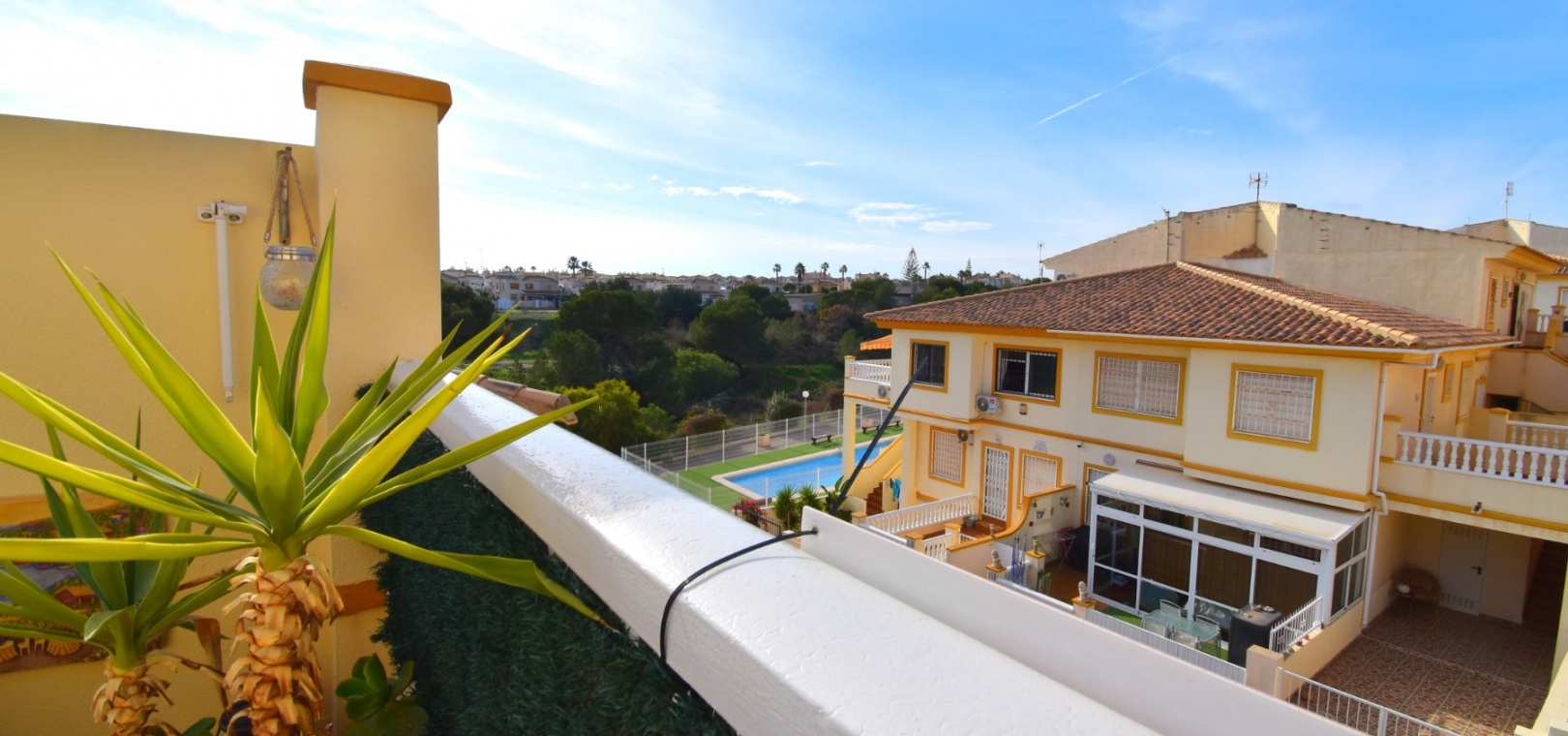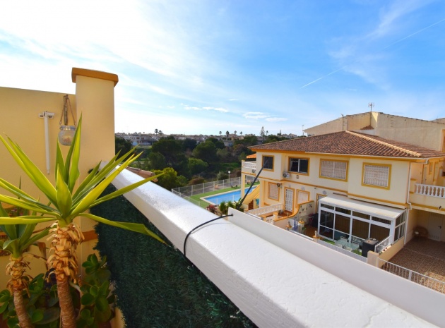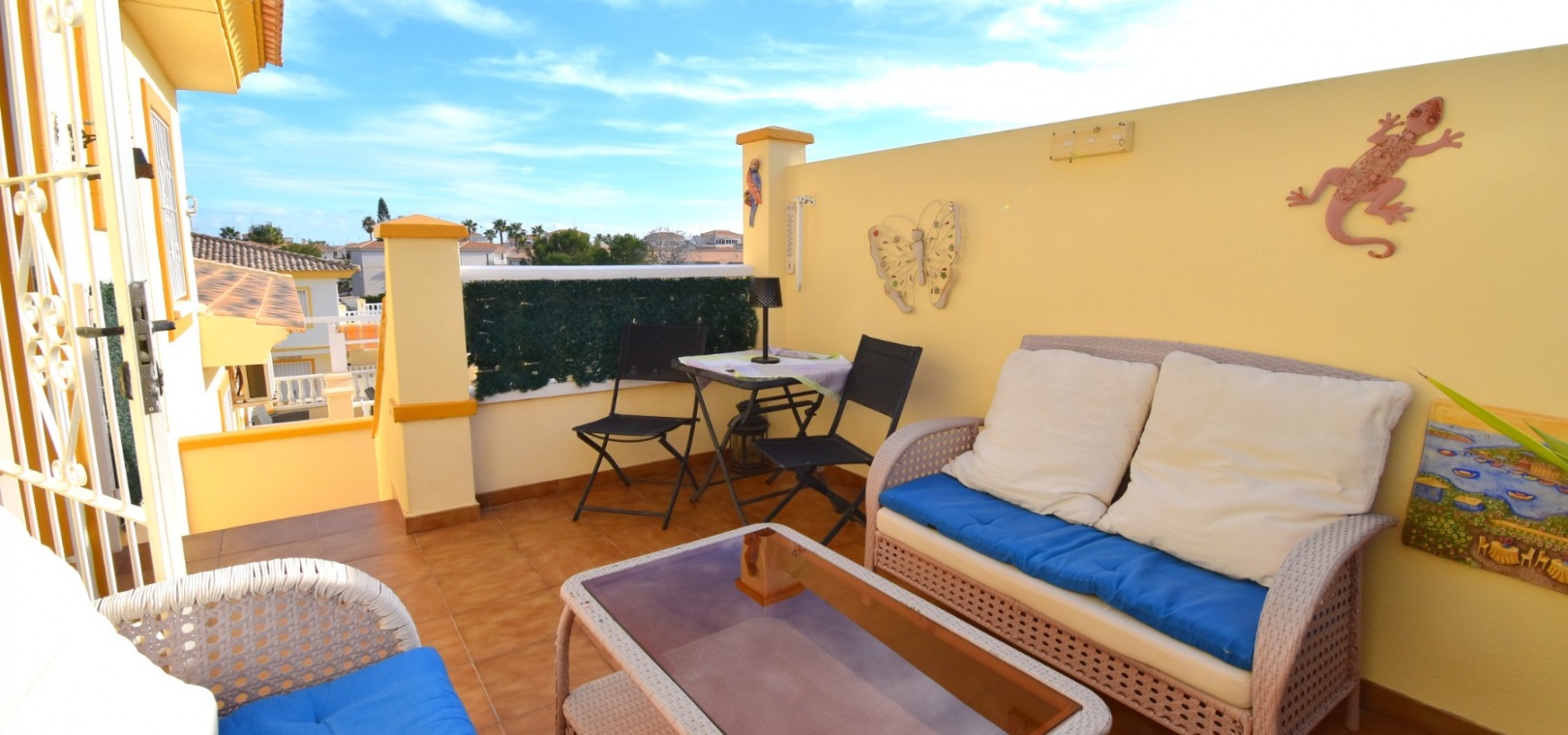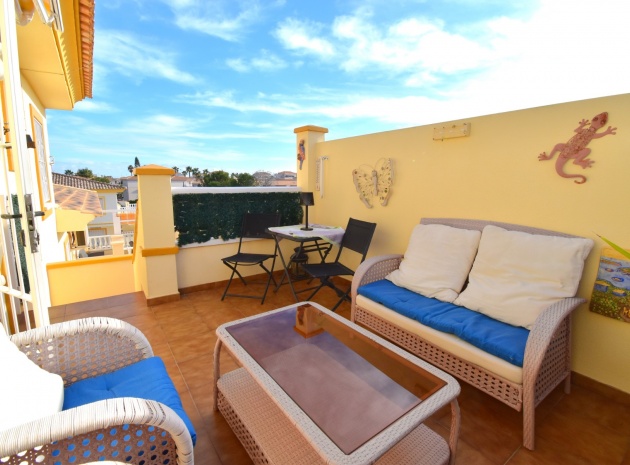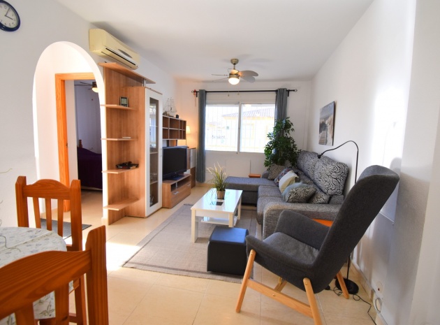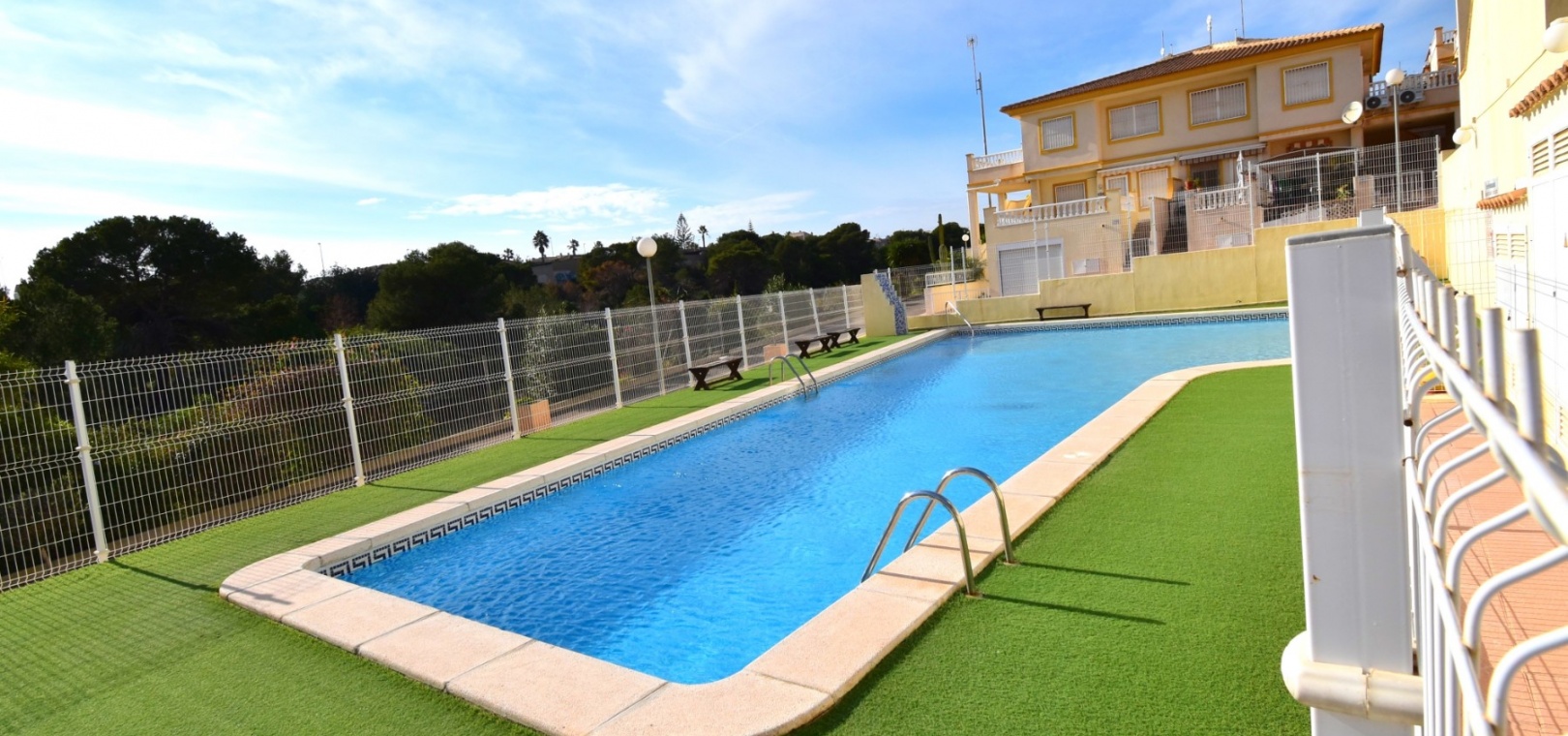 This South West Facing, Top Floor, Two Bedroom Apartment in Playa Flamenca, is located in the heart of the Orihuela Costa, within a short walk of less than 10 minutes to a variety of bars and restaurants. La Zenia Boulevard shopping centre is just 15-20 minutes on foot, with the beach and golf course only a 5-minute drive away. Although situated on the top floor, this apartment benefits from its own tiled garden area, making it ideal for outdoor relaxation or entertaining. The property is nicely presented and well maintained, featuring a great terrace area leading into the lounge/dining room with air conditioning. The bright American-style fitted kitchen adds to the welcoming feel of the home. There are two double bedrooms, both with built-in wardrobes, while the master also includes air conditioning. The family bathroom is conveniently located. A separate storage room provides additional practicality. The property is part of a gated community offering parking and a communal pool surrounded by astro turf, perfect for enjoying the Costa Blanca South lifestyle.