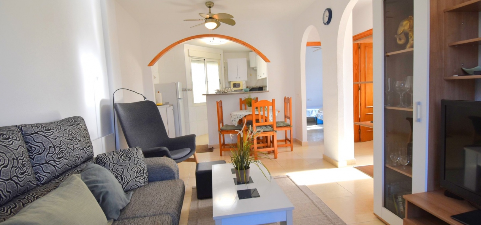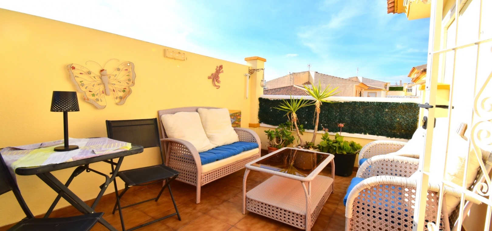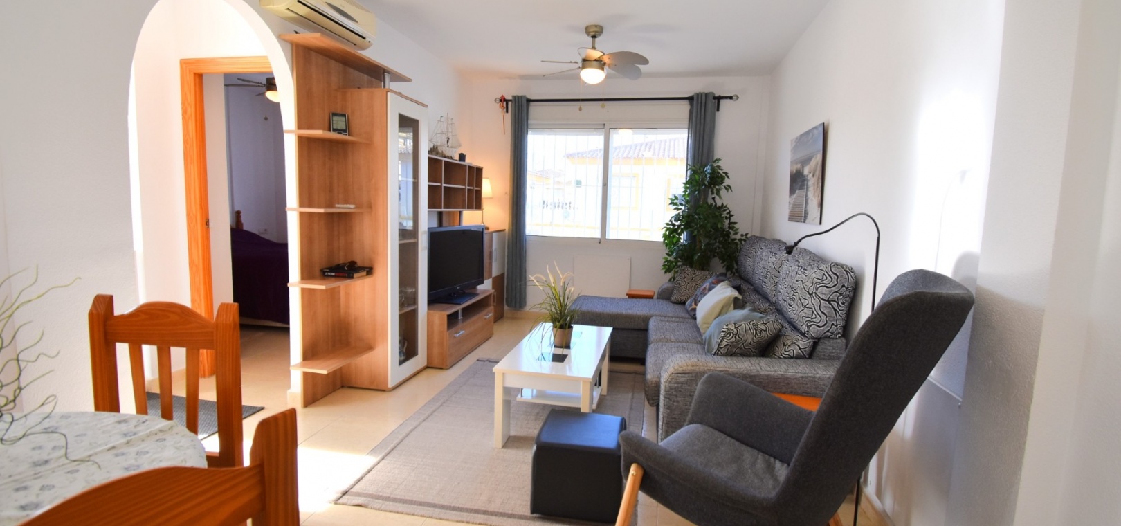 This South West Facing, Top Floor, Two Bedroom Apartment in Playa Flamenca, is located in the heart of the Orihuela Costa, within a short walk of less than 10 minutes to a variety of bars and restaurants. La Zenia Boulevard shopping centre is just 15-20 minutes on foot, with the beach and golf course only a 5-minute drive away. Although situated on the top floor, this apartment benefits from its own tiled garden area, making it ideal for outdoor relaxation or entertaining. The property is nicely presented and well maintained, featuring a great terrace area leading into the lounge/dining room with air conditioning. The bright American-style fitted kitchen adds to the welcoming feel of the home. There are two double bedrooms, both with built-in wardrobes, while the master also includes air conditioning. The family bathroom is conveniently located. A separate storage room provides additional practicality. The property is part of a gated community offering parking and a communal pool surrounded by astro turf, perfect for enjoying the Costa Blanca South lifestyle.