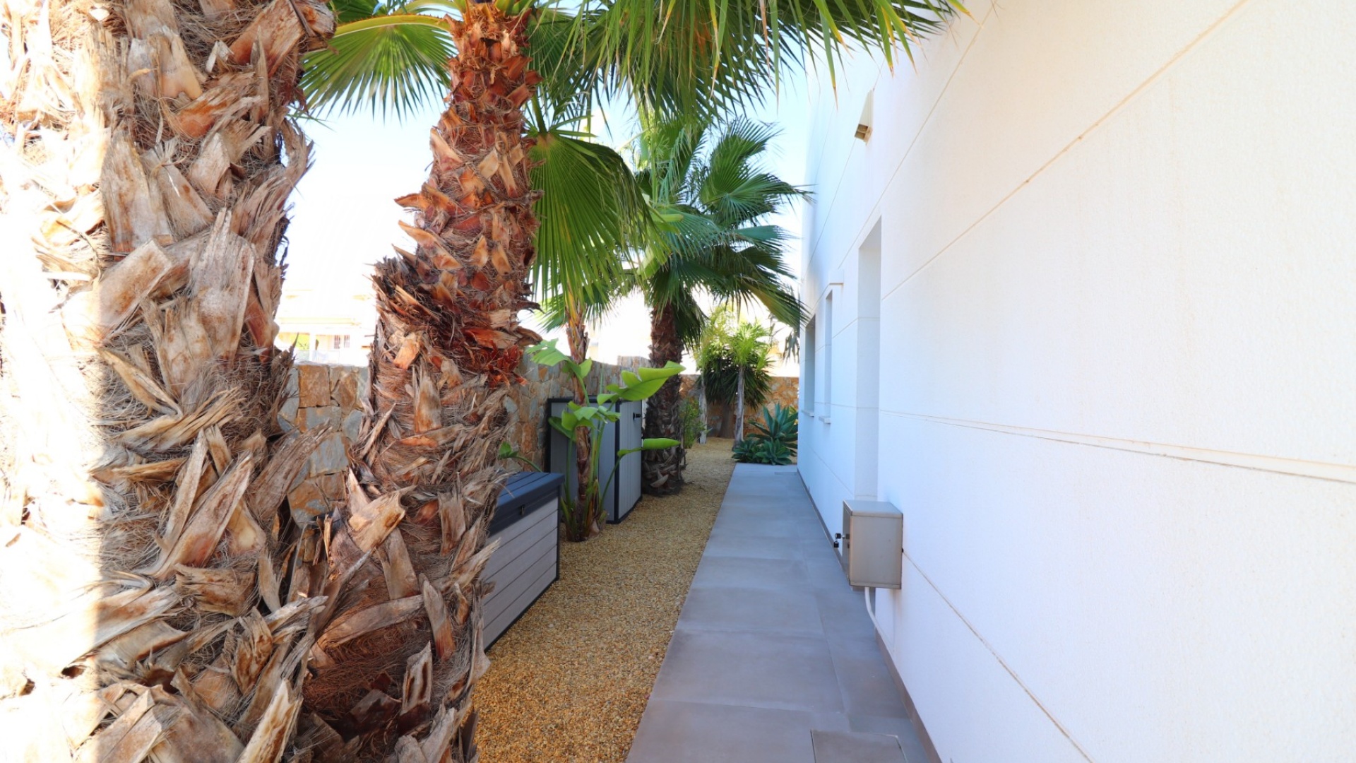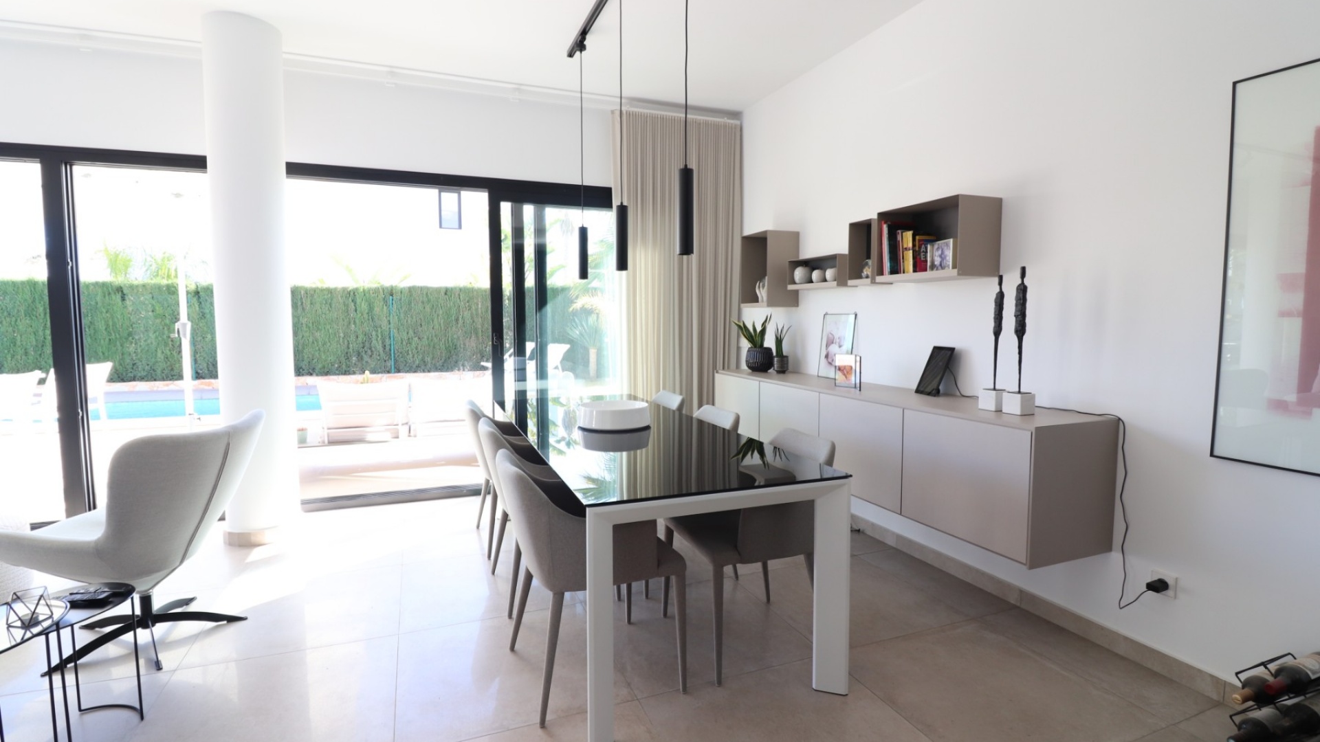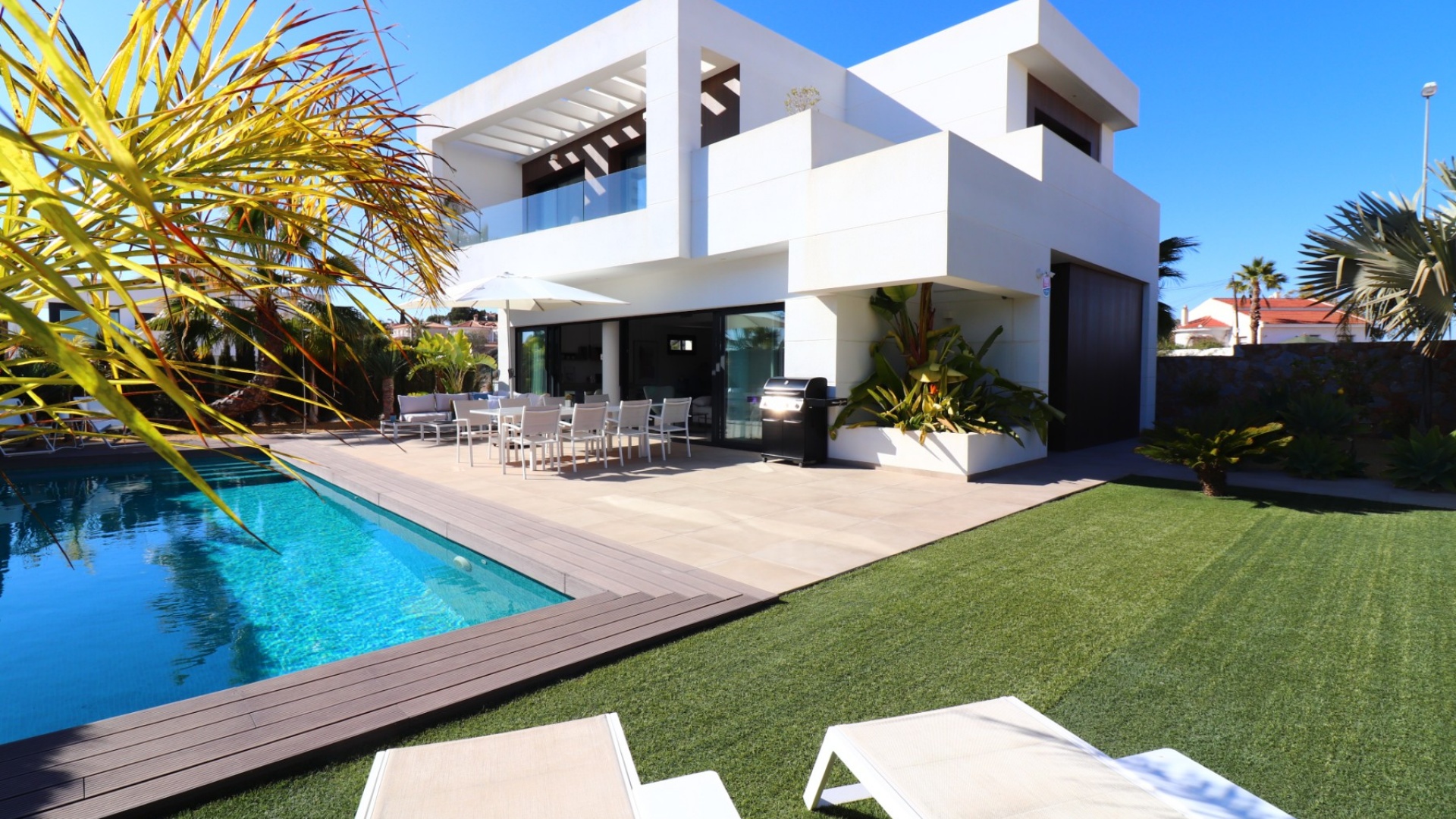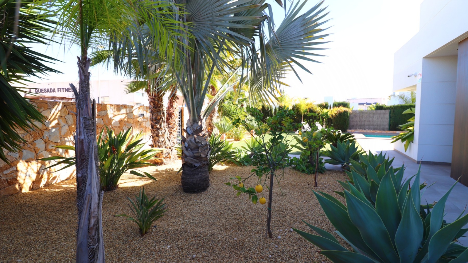 This Stunning, South East Facing, Three Bedroom, Detached Villa in Quesada, is located near the picturesque El Recorral park and within a 20-minute walk of the vibrant Quesada high street. Amenities such as an “essentials” supermarket, entertainment venue, restaurant, and bar are just a couple of minutes away. La Marquesa golf course is a few minutes by car with the beach reachable in 10-15 minutes. Built in 2021 and originally the show home, this property spans an impressive 160m2 and is finished to an exceptionally high standard. The villa enjoys views of the Sea, mountains, and salt lakes. The open-plan living area is bright and spacious, featuring wall-to-wall glazed sliding doors that open to the pool area. The modern fitted kitchen includes a breakfast bar, complemented by a separate utility room. On the ground floor, there is a double bedroom and a family shower room. Stairs from the lounge lead to the first floor, which houses two further double bedrooms. The master bedroom boasts walk-in wardrobes, and both bedrooms have access to terraces and en suite shower rooms. Additional features include ducted air conditioning and built-in wardrobes. The exterior is equally impressive, with a mix of tiled and grassed areas, a stunning 10 x 4 private pool pre-installed for heating, fir tree borders, and mature palm trees. There is also off-road parking, making this villa an ideal choice for a luxurious home in Costa Blanca South.