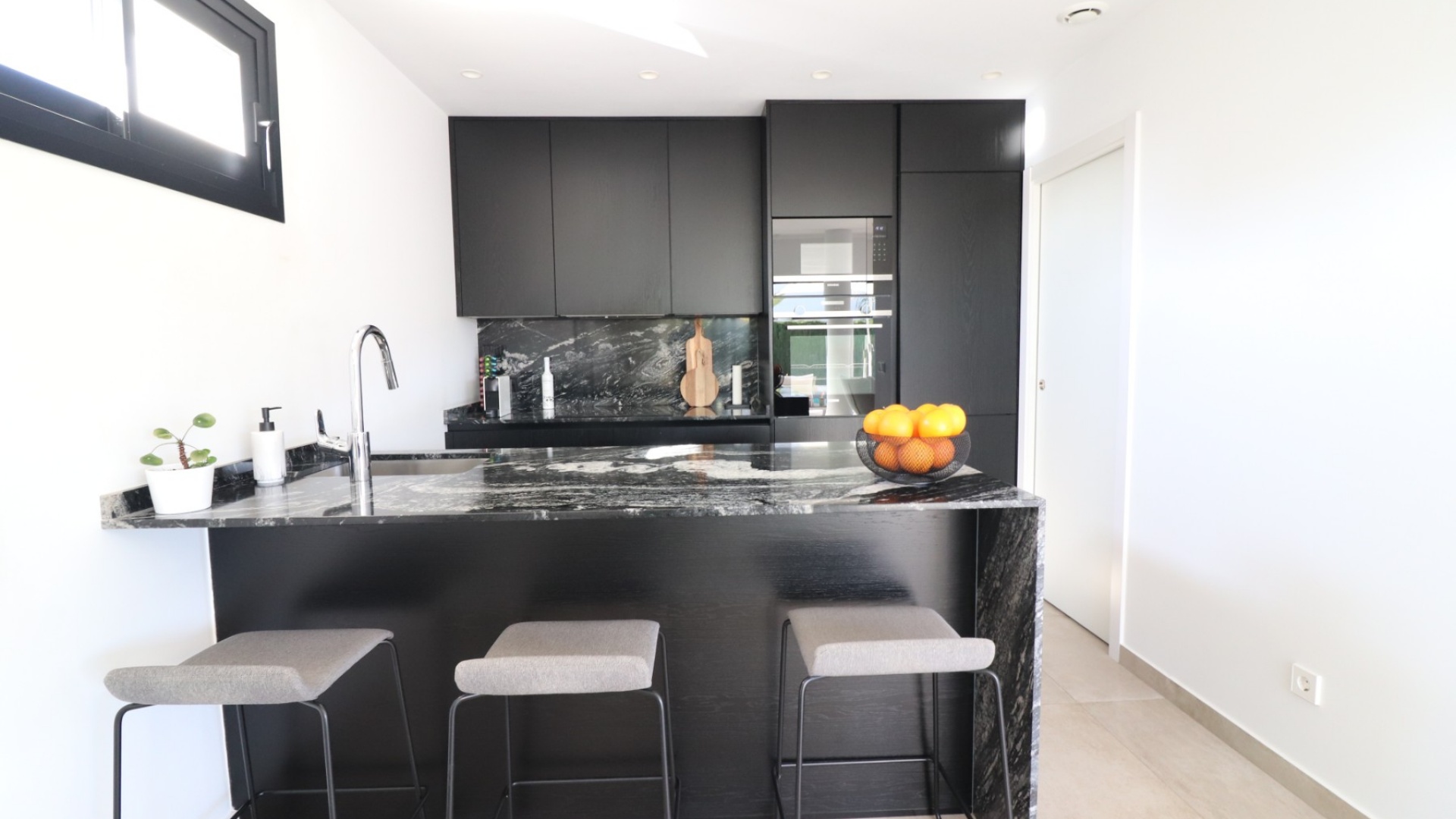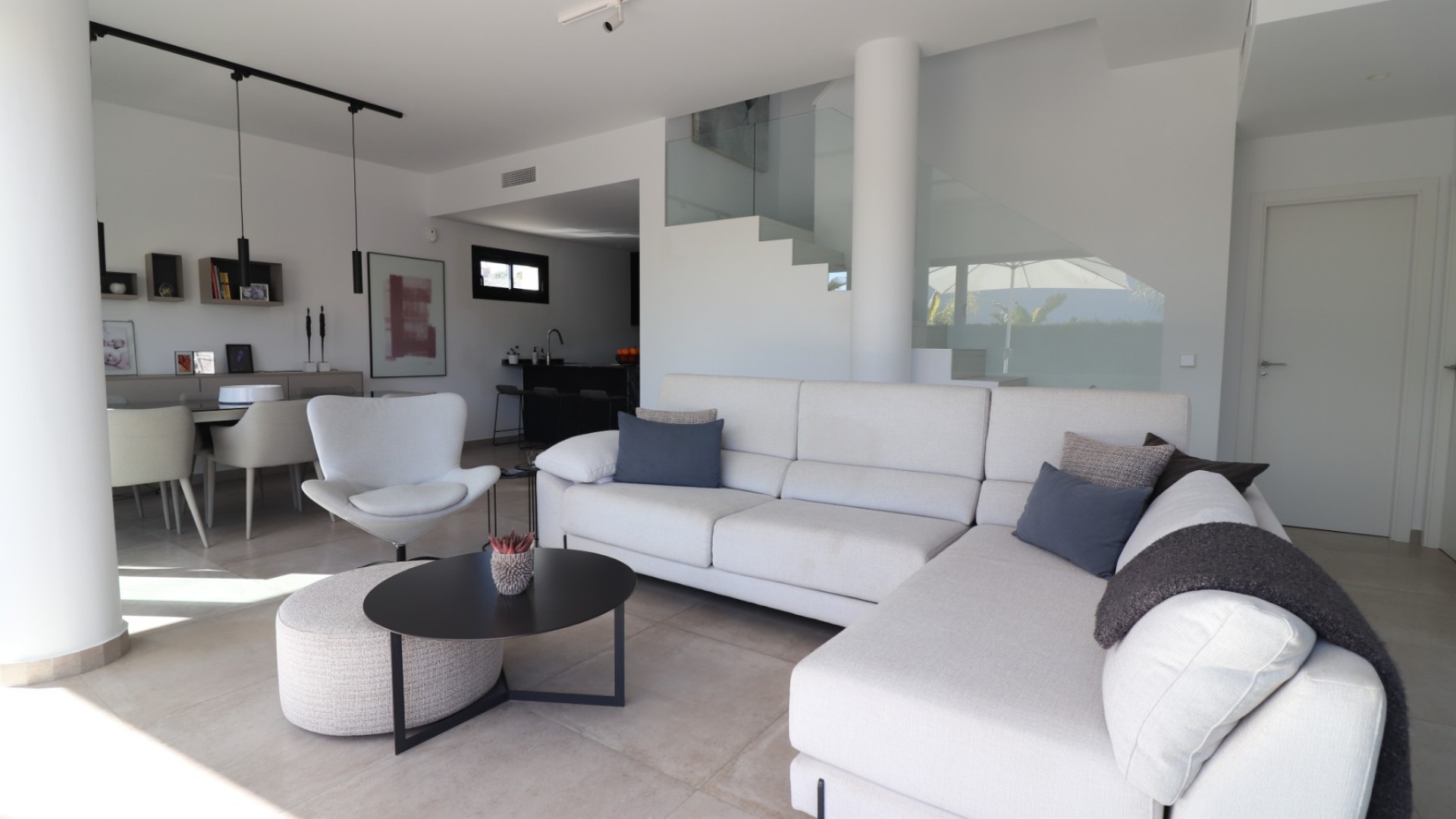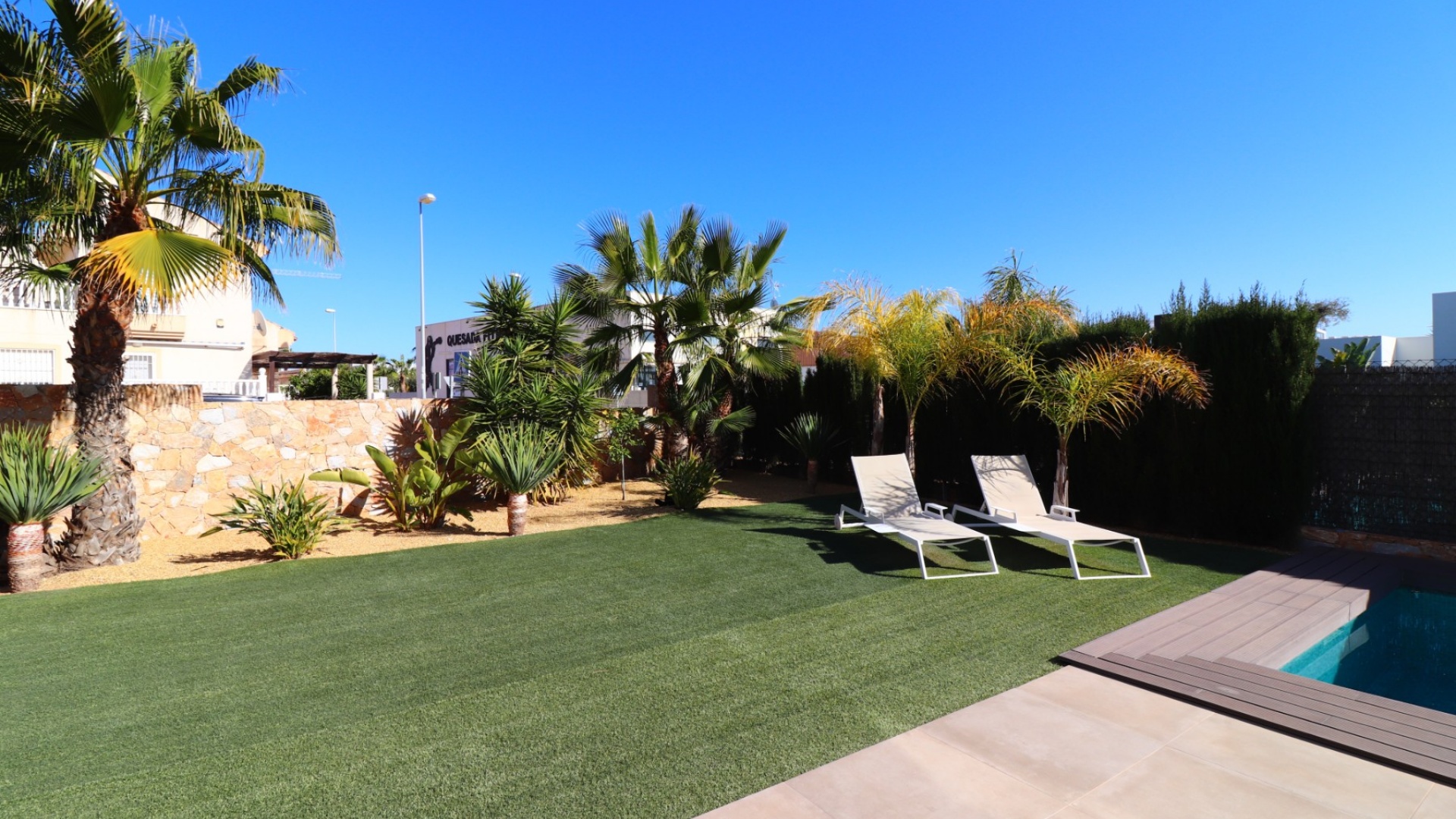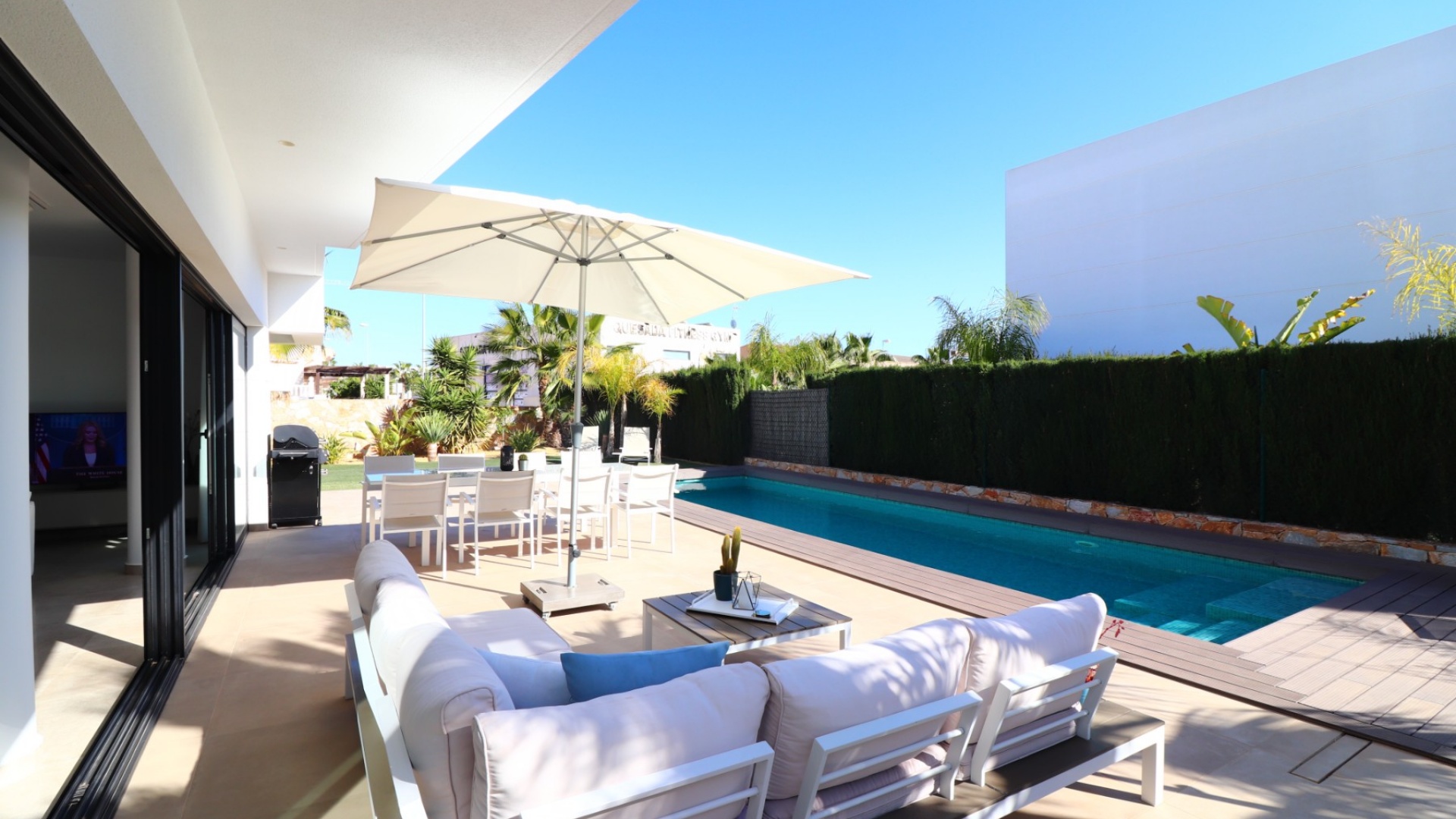 This Stunning, South East Facing, Three Bedroom, Detached Villa in Quesada, is located near the picturesque El Recorral park and within a 20-minute walk of the vibrant Quesada high street. Amenities such as an “essentials” supermarket, entertainment venue, restaurant, and bar are just a couple of minutes away. La Marquesa golf course is a few minutes by car with the beach reachable in 10-15 minutes. Built in 2021 and originally the show home, this property spans an impressive 160m2 and is finished to an exceptionally high standard. The villa enjoys views of the Sea, mountains, and salt lakes. The open-plan living area is bright and spacious, featuring wall-to-wall glazed sliding doors that open to the pool area. The modern fitted kitchen includes a breakfast bar, complemented by a separate utility room. On the ground floor, there is a double bedroom and a family shower room. Stairs from the lounge lead to the first floor, which houses two further double bedrooms. The master bedroom boasts walk-in wardrobes, and both bedrooms have access to terraces and en suite shower rooms. Additional features include ducted air conditioning and built-in wardrobes. The exterior is equally impressive, with a mix of tiled and grassed areas, a stunning 10 x 4 private pool pre-installed for heating, fir tree borders, and mature palm trees. There is also off-road parking, making this villa an ideal choice for a luxurious home in Costa Blanca South.
