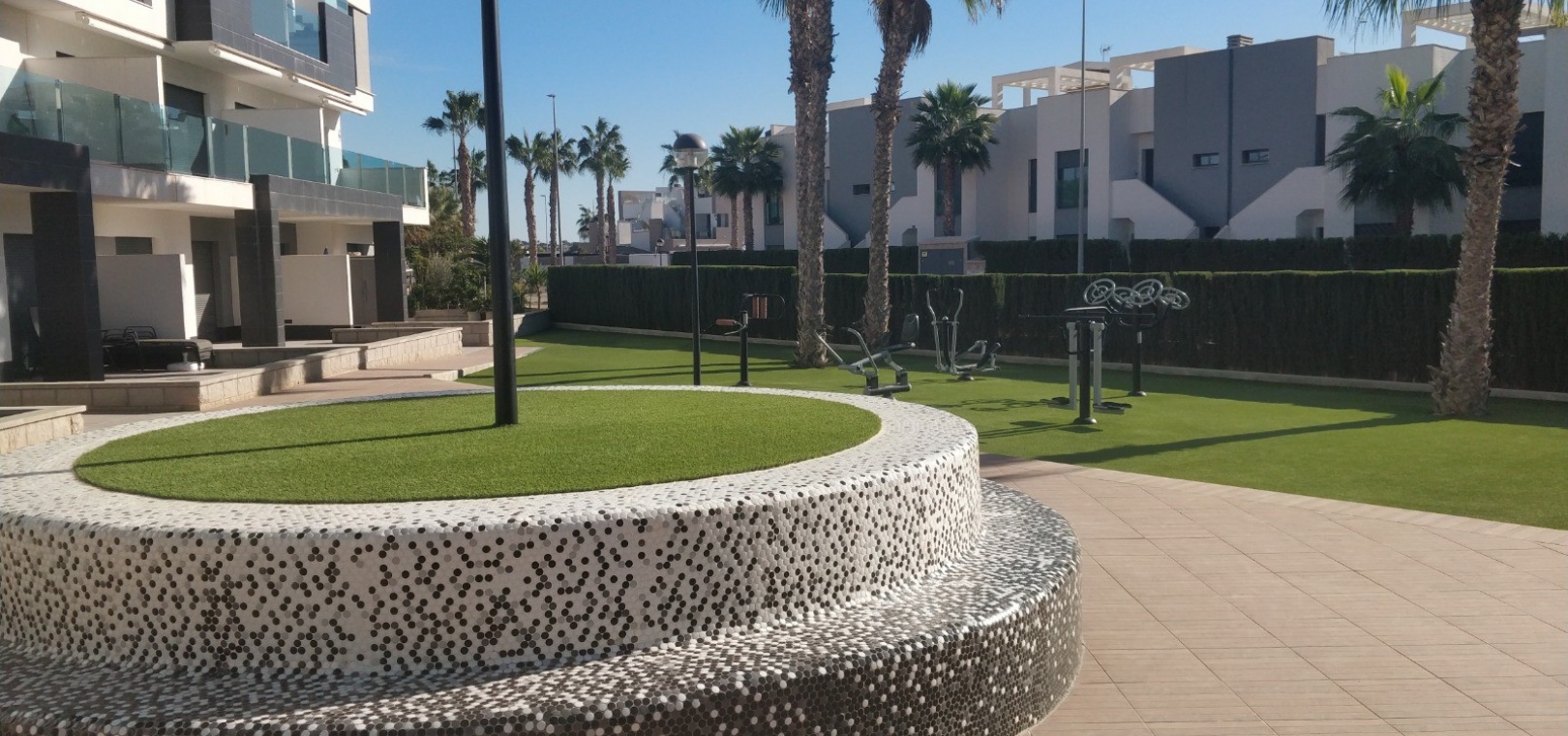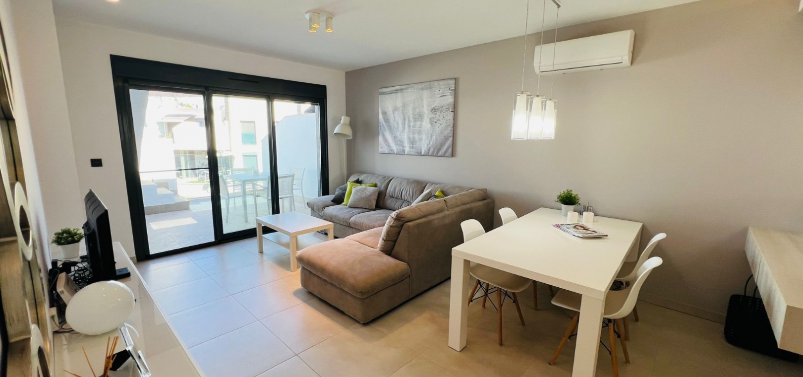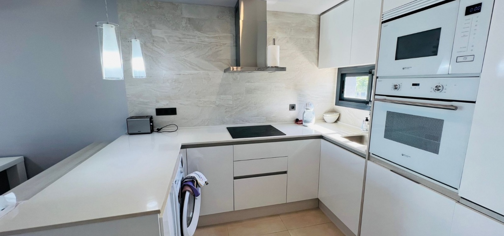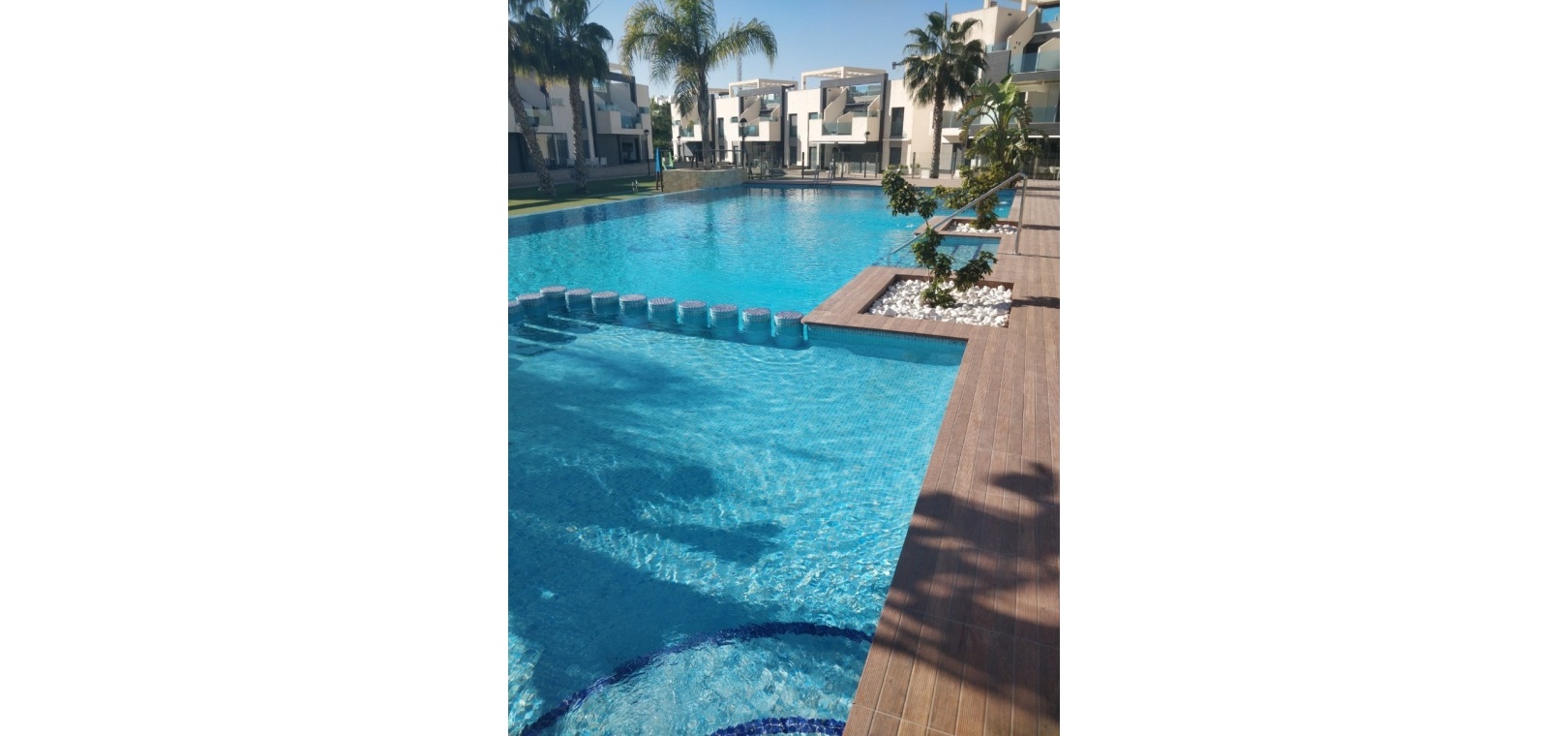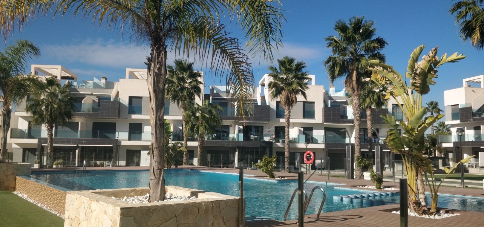 The apartment has an open kitchen and two fitted wardrobes that offer plenty of storage space. Located on the first floor with E-Se orientation, you can enjoy beautiful views and natural light all day long. It also has a huge solarium of 68 m2, ideal for dining and socializing on warm summer evenings. Other included extras include air conditioning, an underground parking space and the property is sold furnished with white goods. Residents have access to fantastic amenities including a community pool, spa, fitness center and indoor pool. The resort also has an exotic atmosphere with a garden full of palm trees, creating a peaceful and tropical atmosphere.