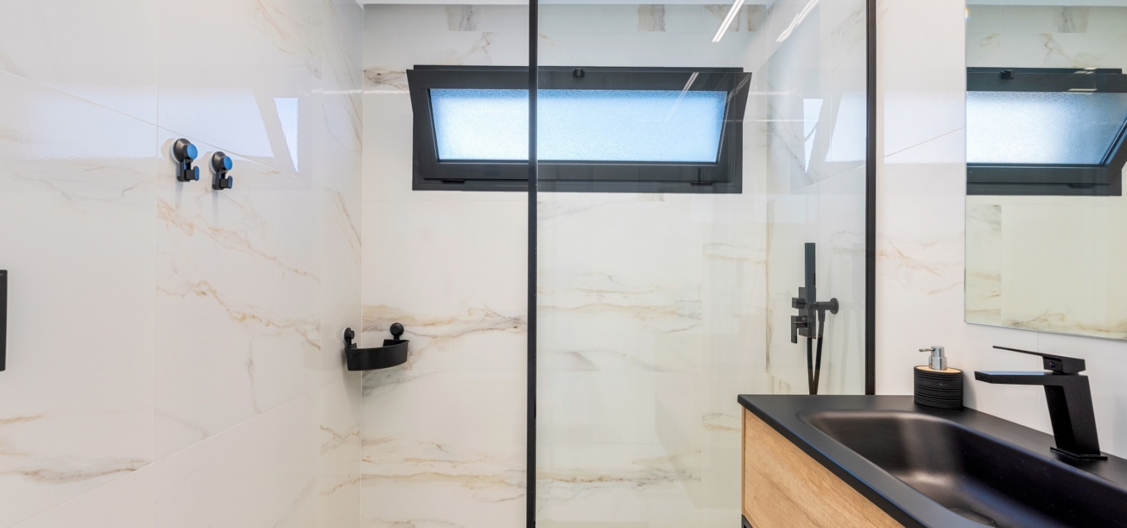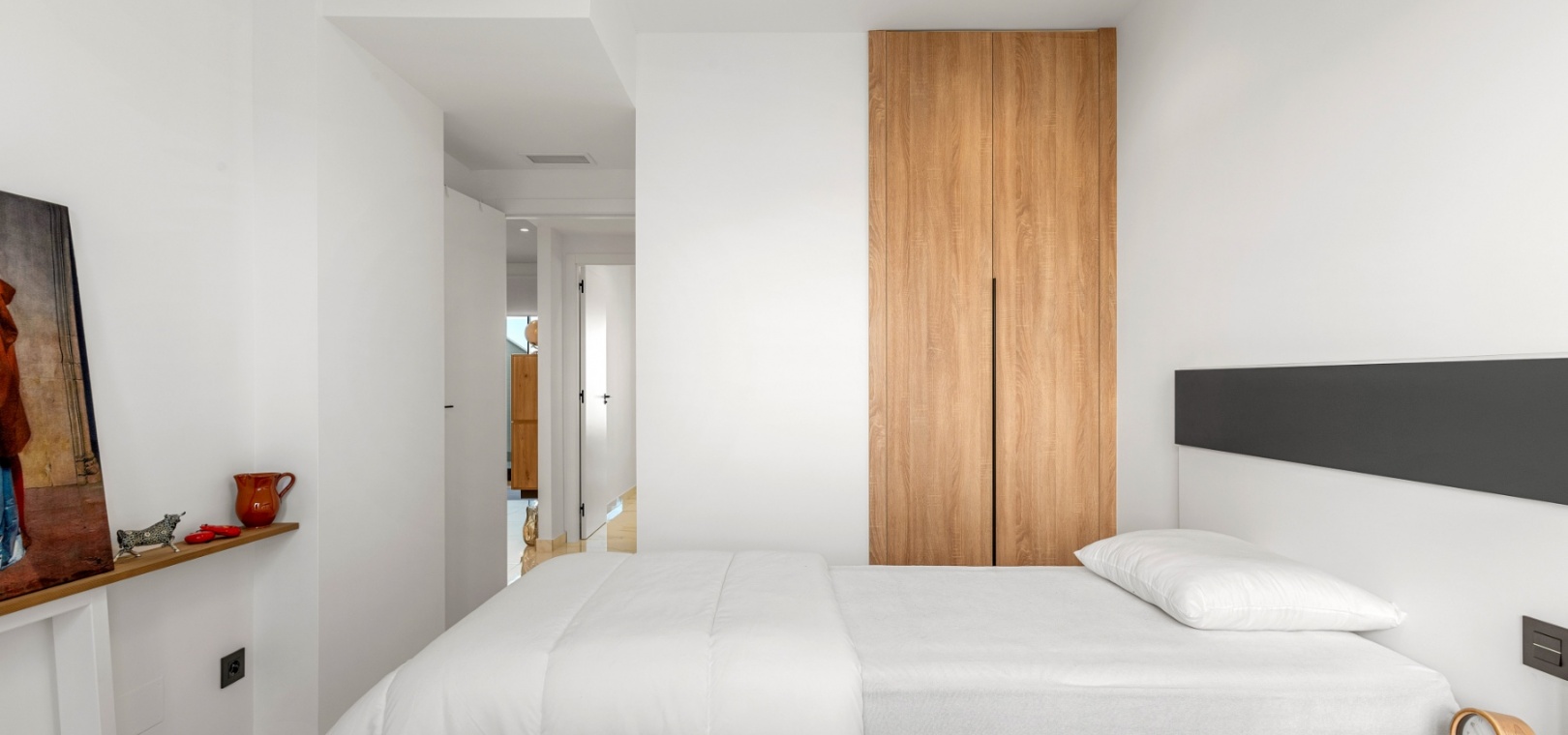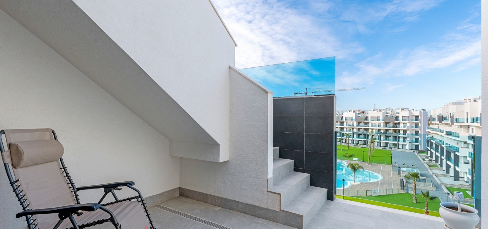 The terrace off the living room offers not only views of the pool and the expansive communal garden. From this terrace, there is access to the generous rooftop terrace, spanning 66 m², where you can enjoy the excellent Spanish climate year-round. For added comfort, the rooftop terrace is equipped with an outdoor shower and a sun awning, ideal for those warm summer days.