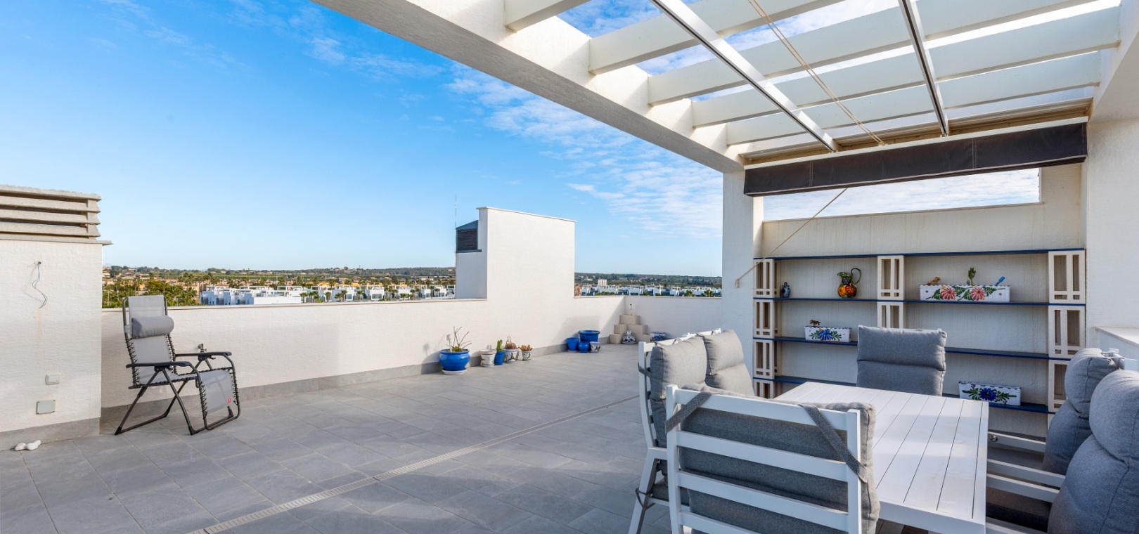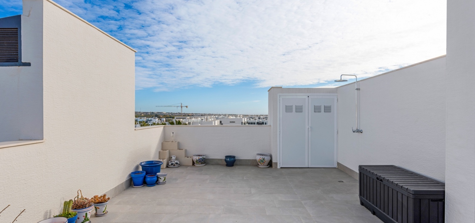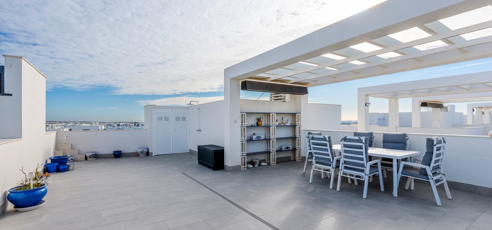 This stunning corner penthouse is located in the prestigious Oasis Beach XV, El Raso, Guardamar del Segura. The spacious, modern apartment features 2 bedrooms, 2 bathrooms, a bright living room with dining area, a fully equipped open kitchen, a terrace off the living room, a large rooftop terrace, and an added bonus of an underground parking space.
