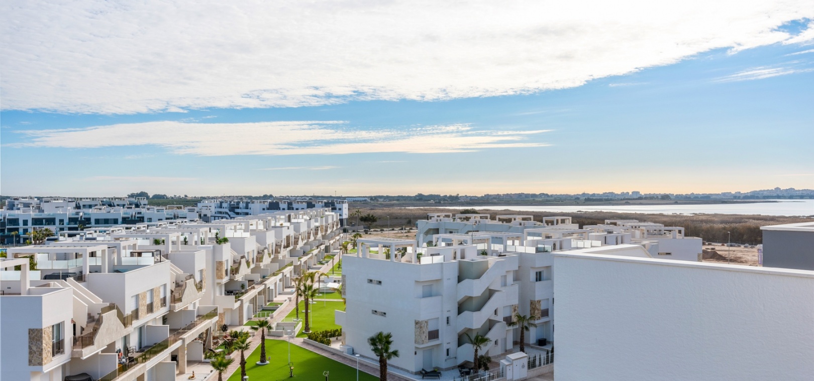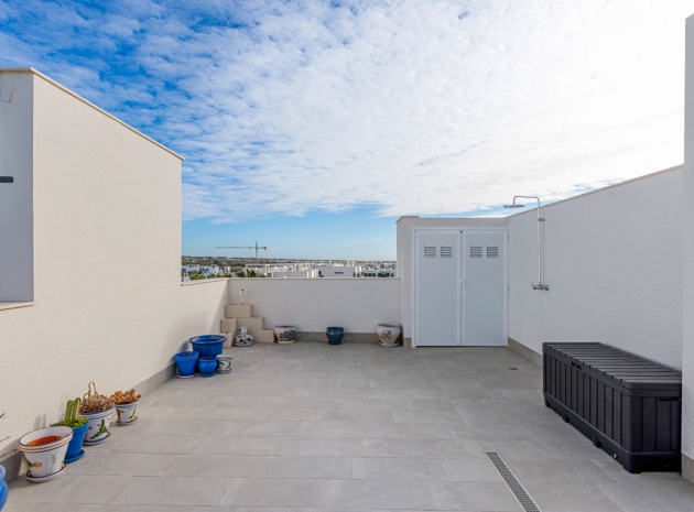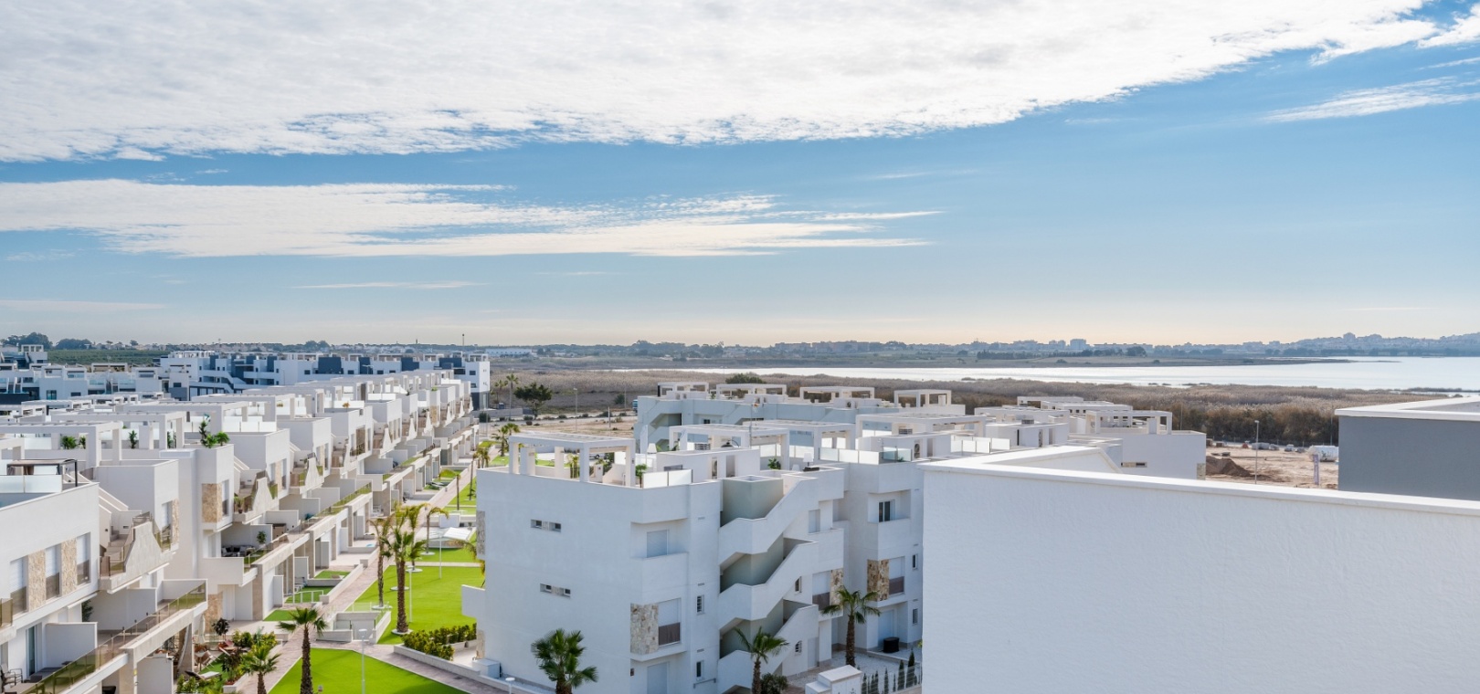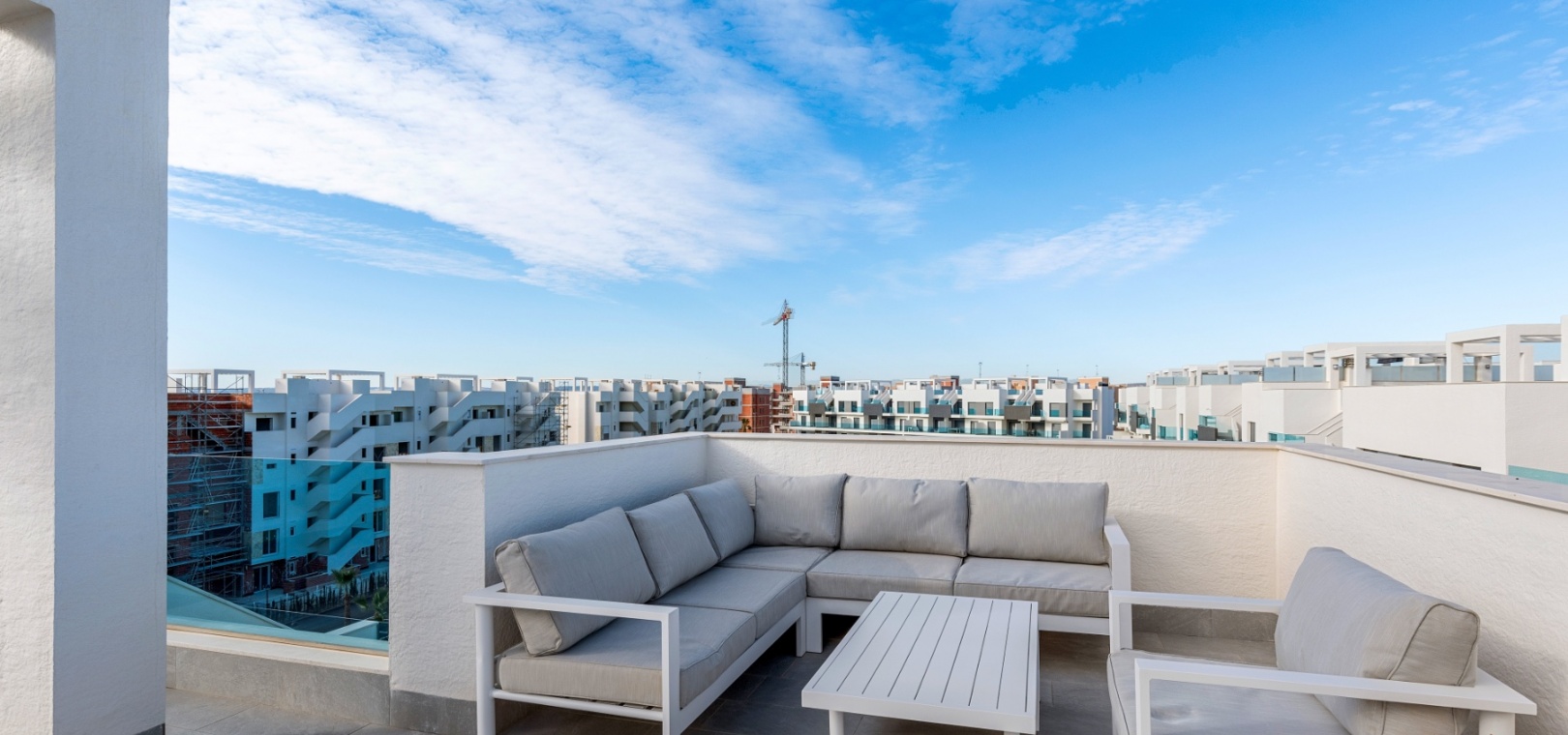 This stunning corner penthouse is located in the prestigious Oasis Beach XV, El Raso, Guardamar del Segura. The spacious, modern apartment features 2 bedrooms, 2 bathrooms, a bright living room with dining area, a fully equipped open kitchen, a terrace off the living room, a large rooftop terrace, and an added bonus of an underground parking space.