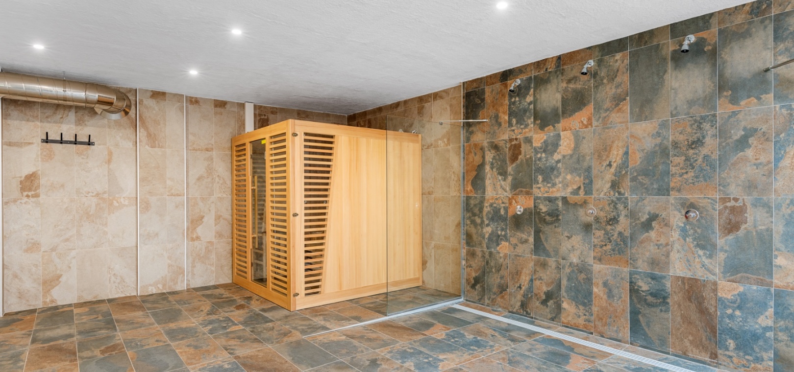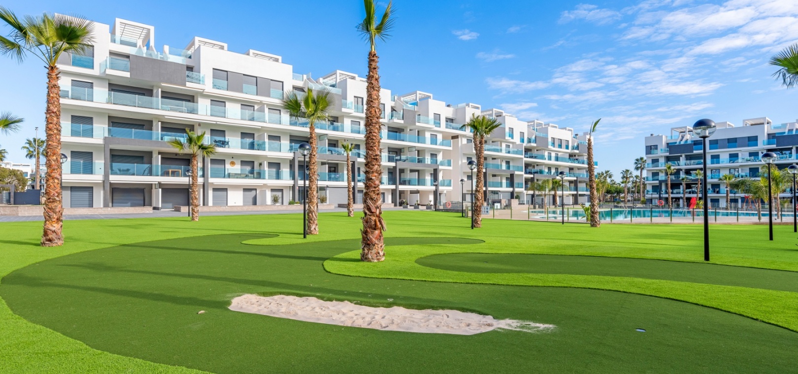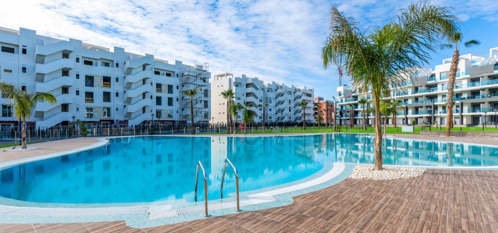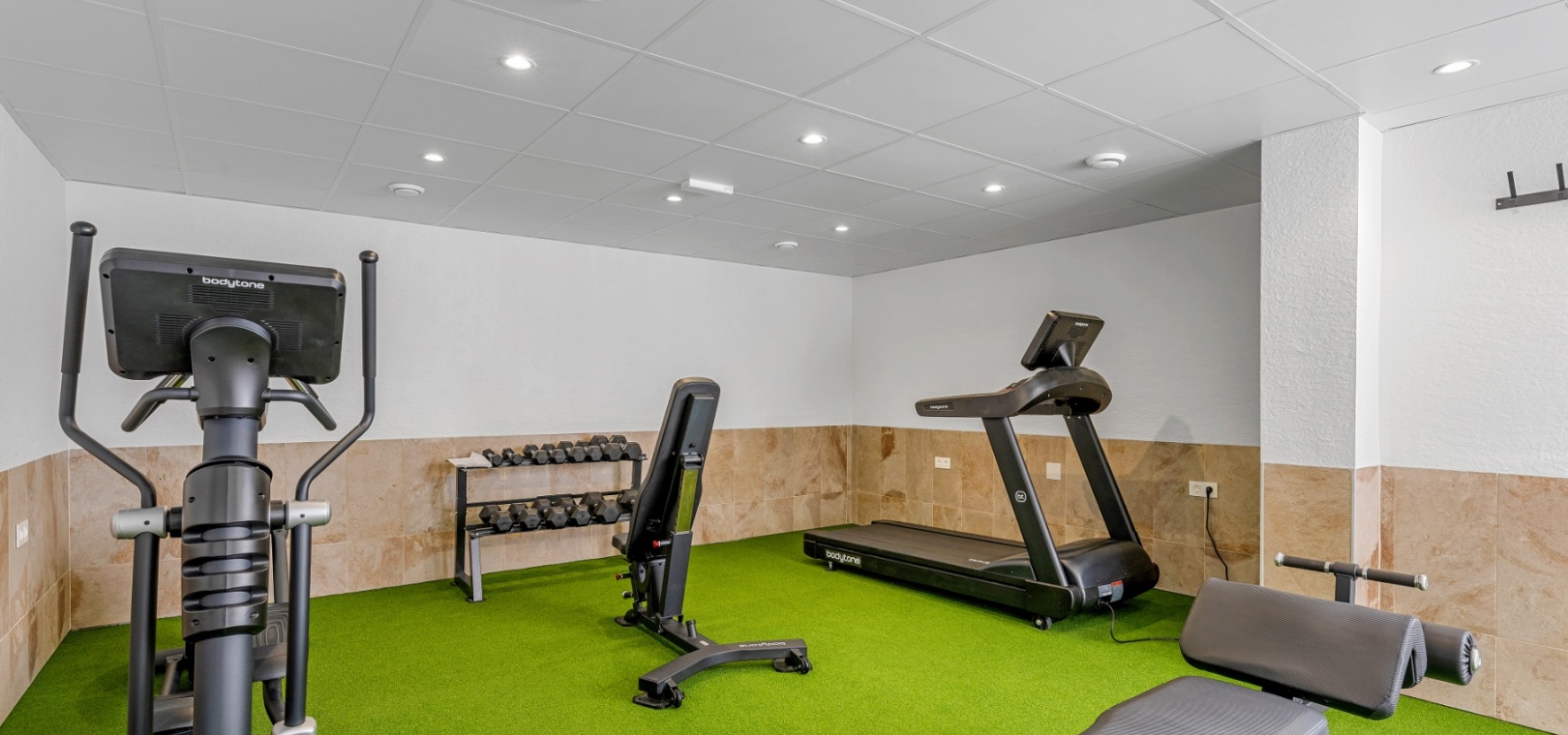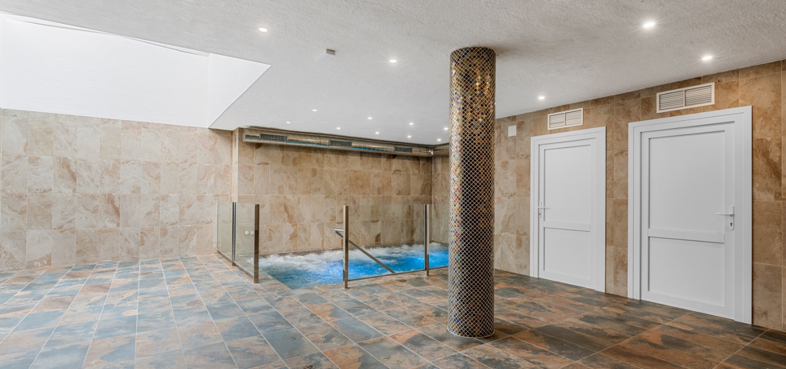 In addition to the apartment, the complex offers a range of amenities, including a spacious garden with palm trees, a large swimming pool, and a playground. There is also a fitness room and a spa with a sauna available for residents.