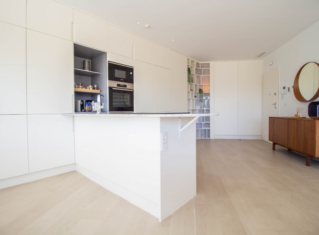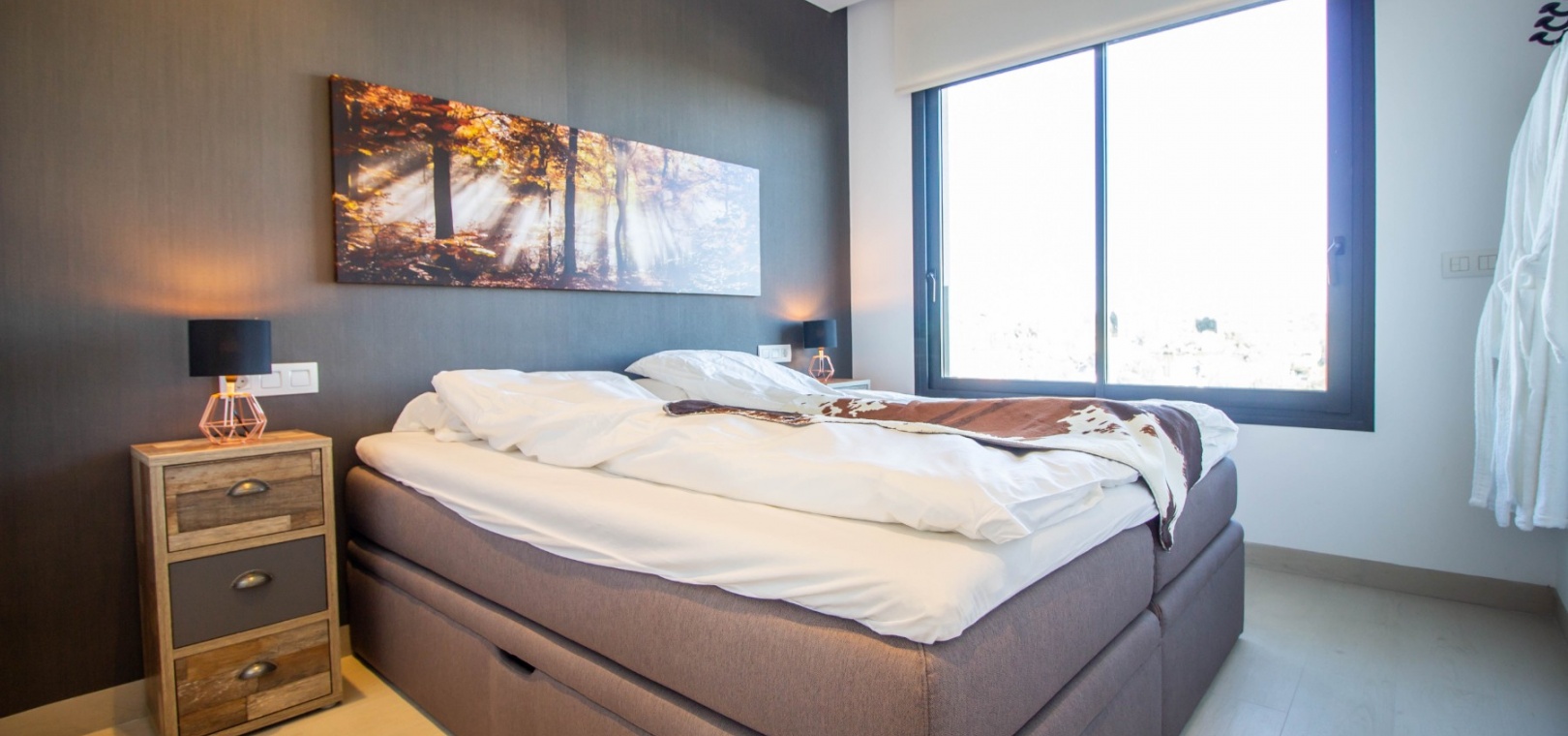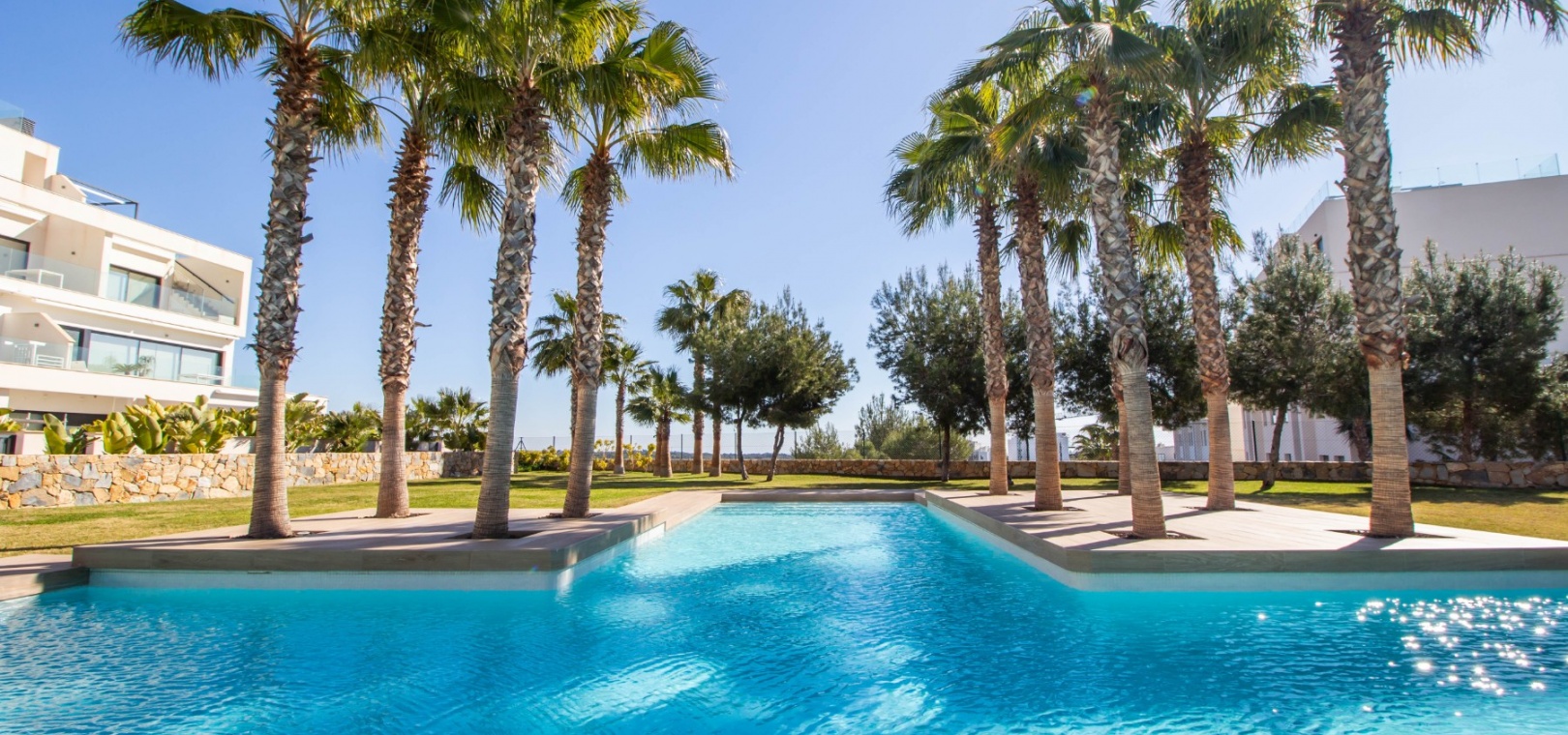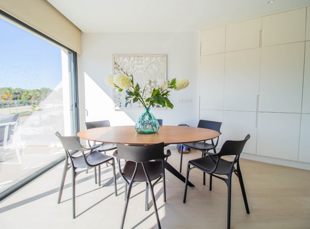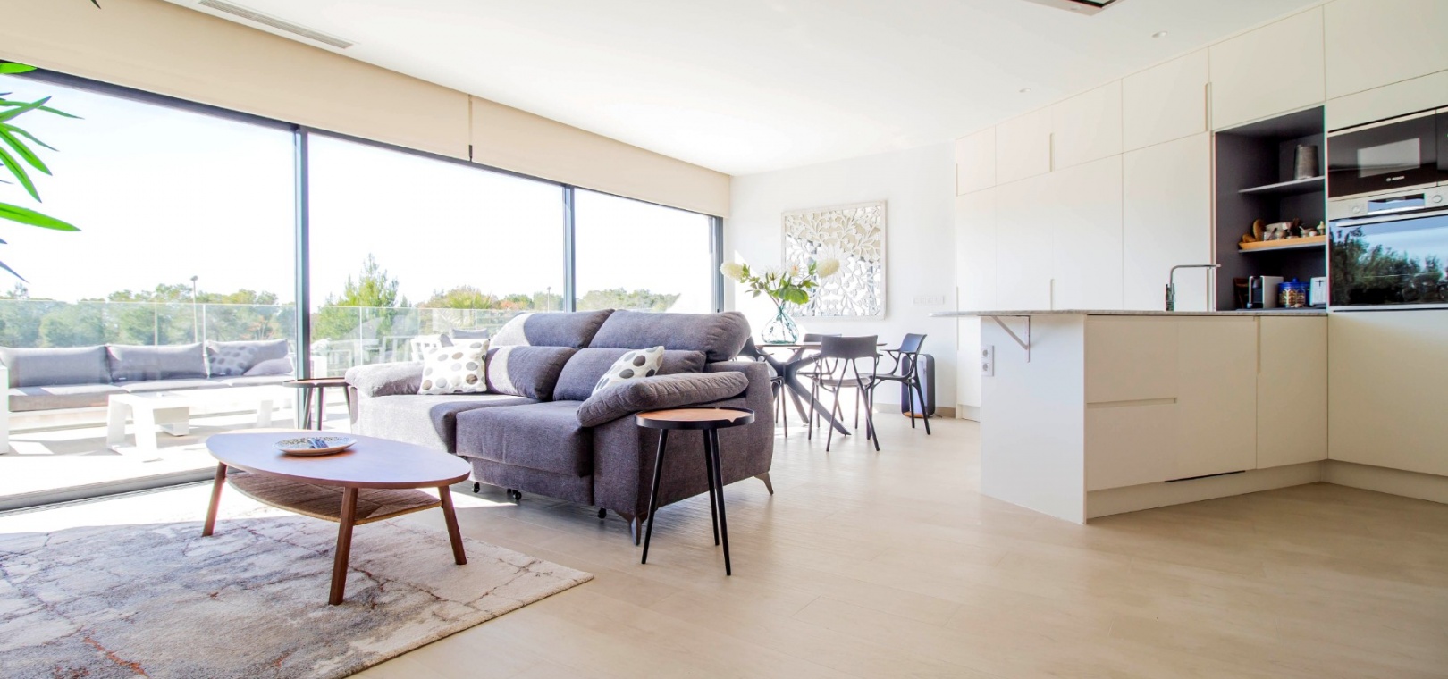 A South Facing, Three Bedroom, First Floor Apartment in Las Colinas Golf Resort, a prestigious 5* resort, with clubhouse, restaurant, bar and supermarket. Just five minutes by car and you have all the amenities of San Miguel de Salinas; 10 minutes and you have Villamartin or even Campoamor and the coast with an array of amenities and beaches. This spacious apartment, built in 2000, of some 110m2 offers open plan living, with the lounge/dining area benefitting from wall to wall sliding doors which lead straight out to the most incredible terrace, relax whilst enjoying a peaceful view across a forest area and distant sea view; modern fitted kitchen area; three double bedrooms with built in wardrobes, master with terrace and en suite bathroom; further family shower room. The complex includes a lift and a stunning communal pool area, plus extras included with the property include: ducted air conditioning, under floor heated bathrooms, home automation, feature secret door which closes off the bedrooms, a 12m2 underground parking space and 8m2 store room.