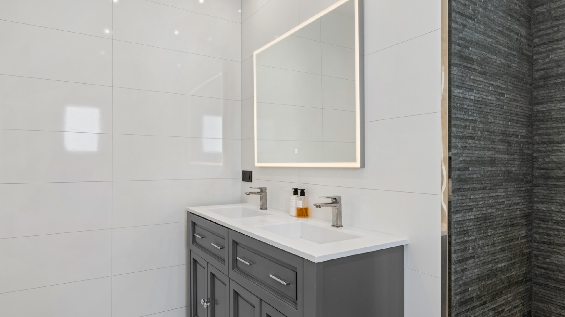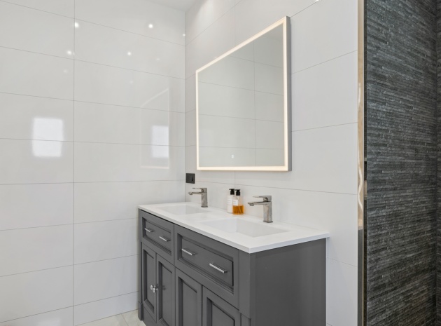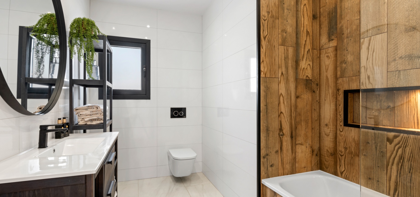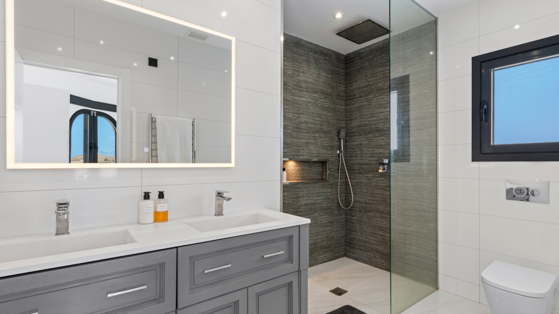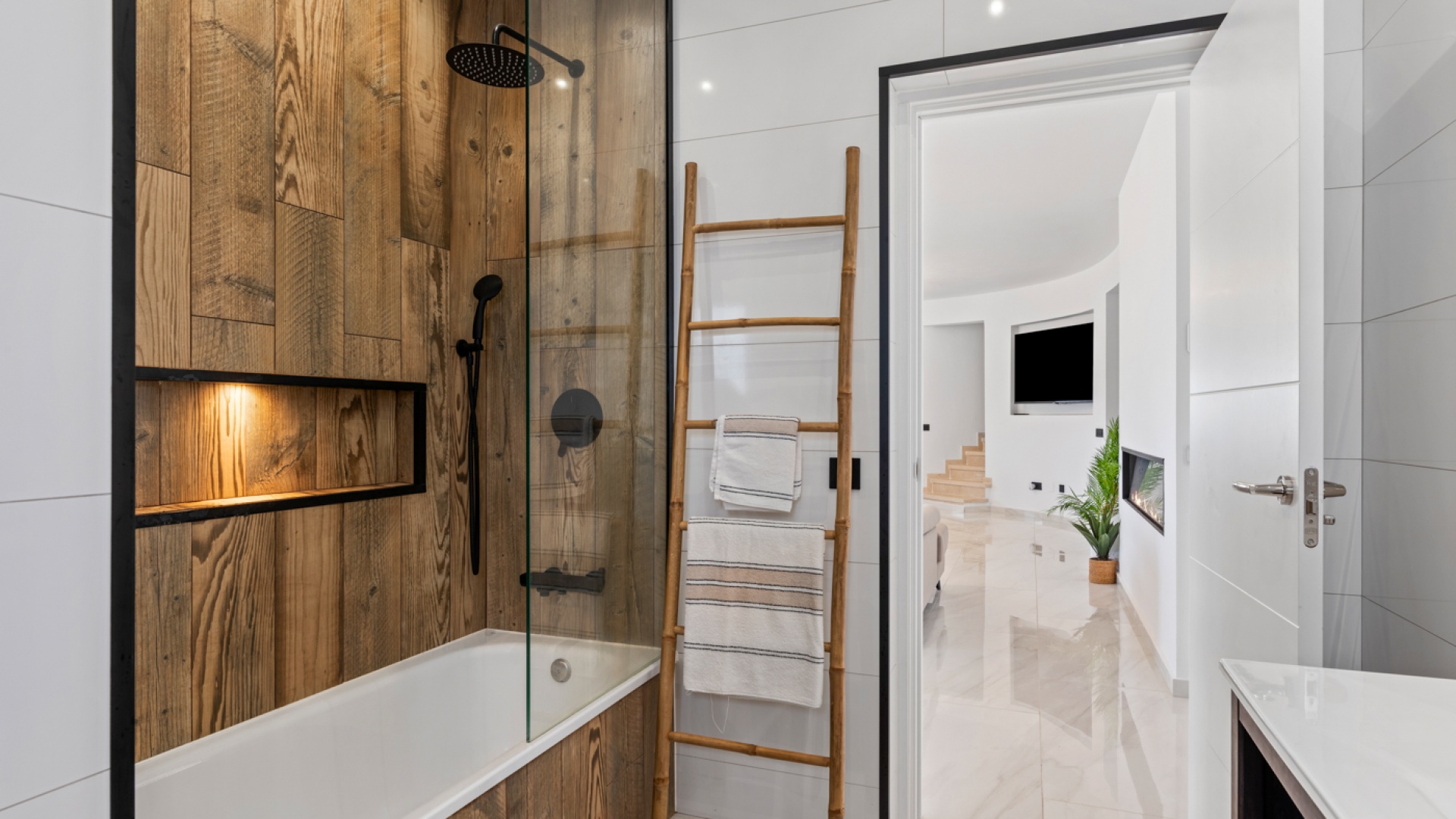 When entering the property you will find a foyer, and a spacious living room with big windows to maximize the experience of the views. This wall of windows can be opened up all the way, or closed with glass, so you can enjoy this space all year round. At the same floor you will find three big bedrooms, two bathrooms, a utility room, the kitchen and a dining room.