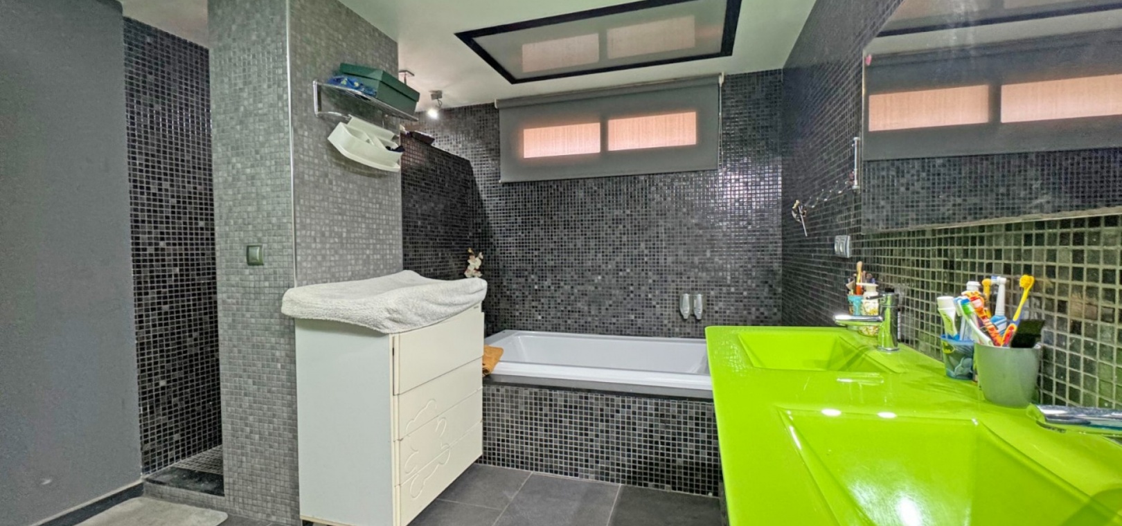 Upon entering, you’ll find a cozy covered terrace, ideal for enjoying the winter sun while protected from the elements. This space leads to either the main entrance of the home or a stunning 25 m² open terrace where you can relax, dine, and savor the fresh sea breeze.