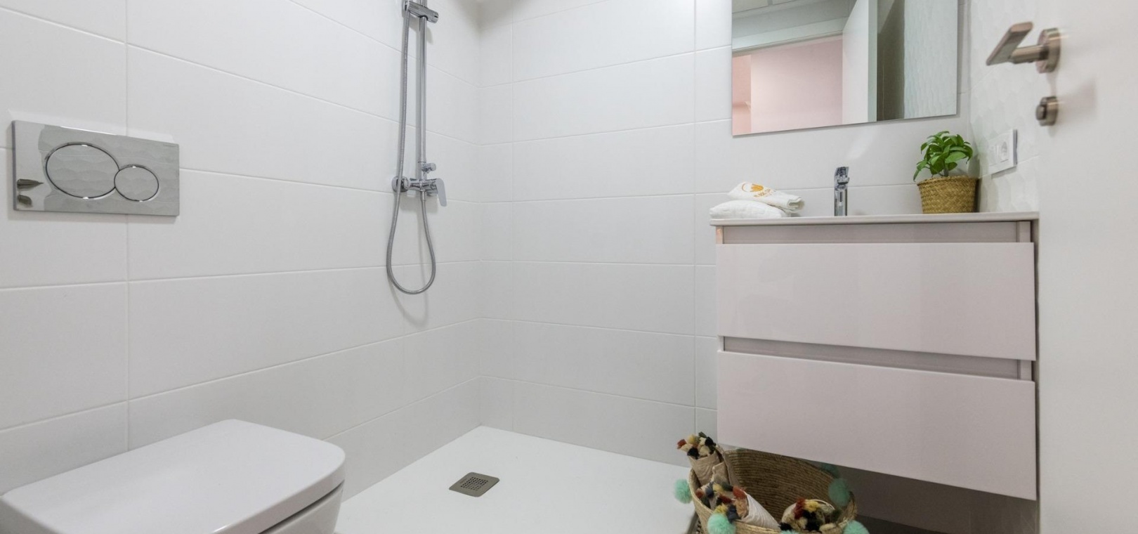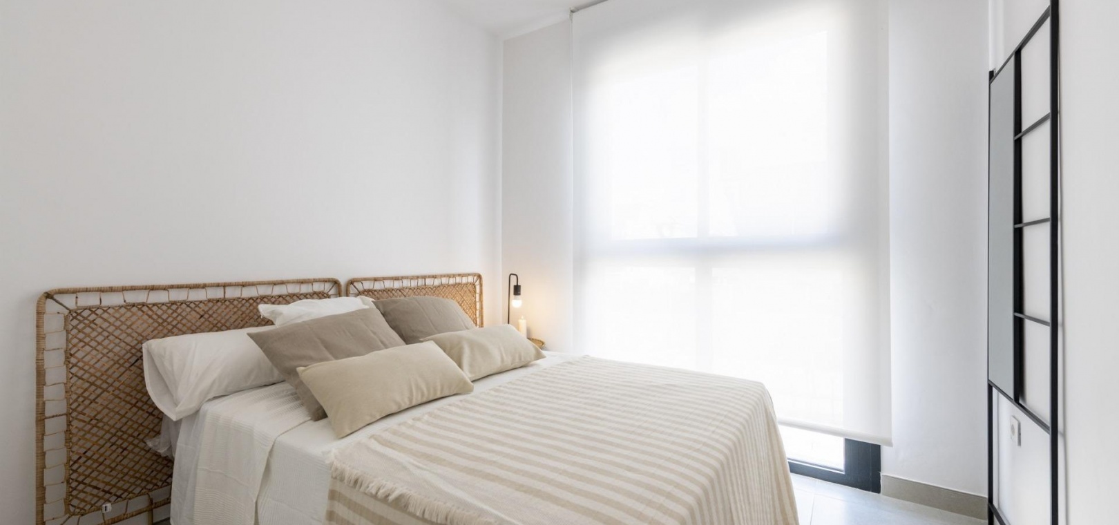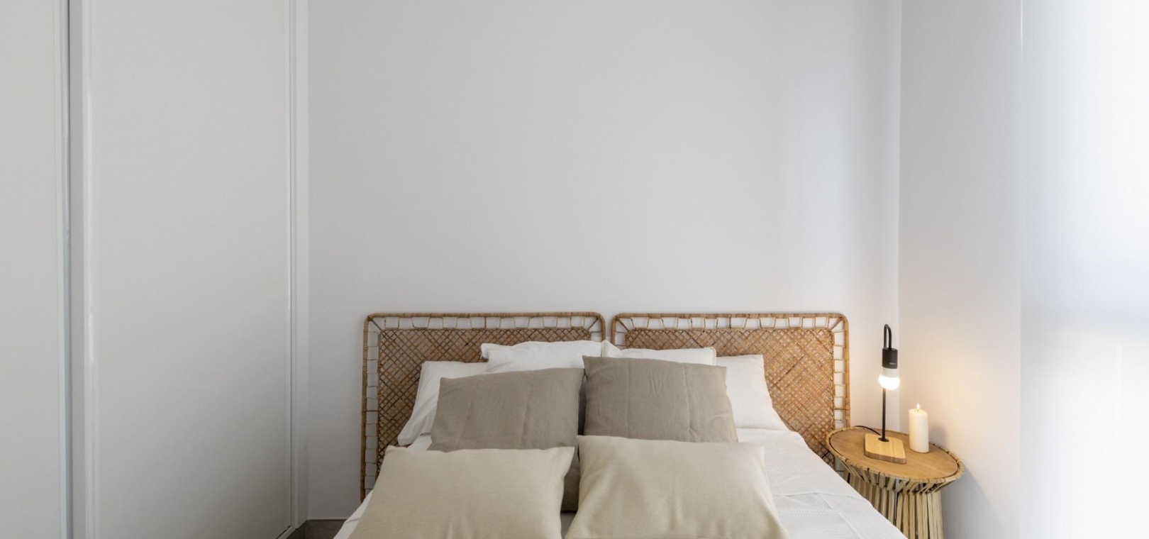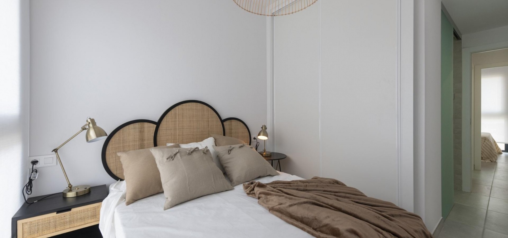 We enter the apartment and arrive in a spacious & bright living room with open plan kitchen & dining area. In front of us are sliding doors to the balcony with pool views. Along one long side of the living room is a passage with access to the two bedrooms and a family bathroom with walk-in shower. The master bedroom has en suit bathroom with walk-in shower and sliding doors to the balcony.