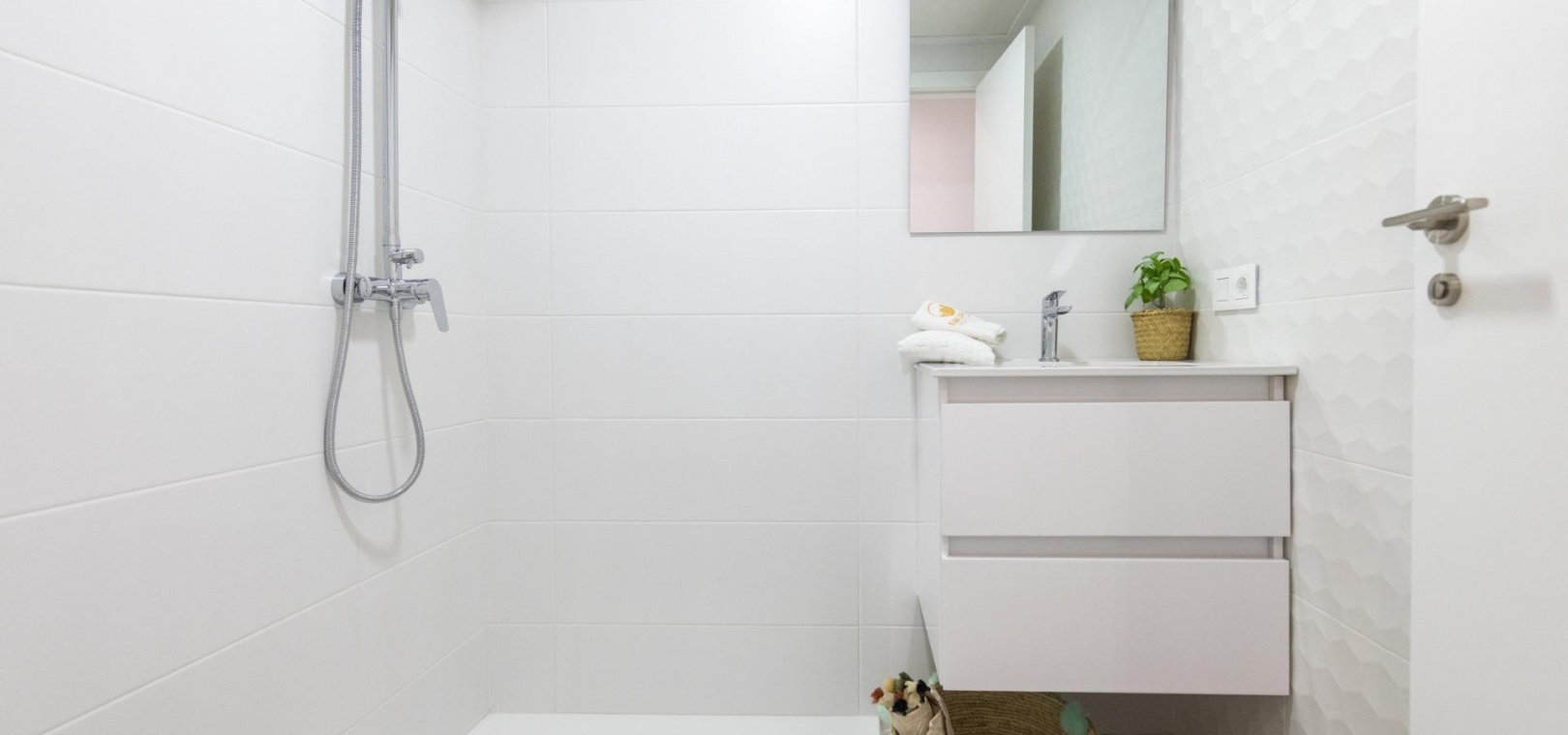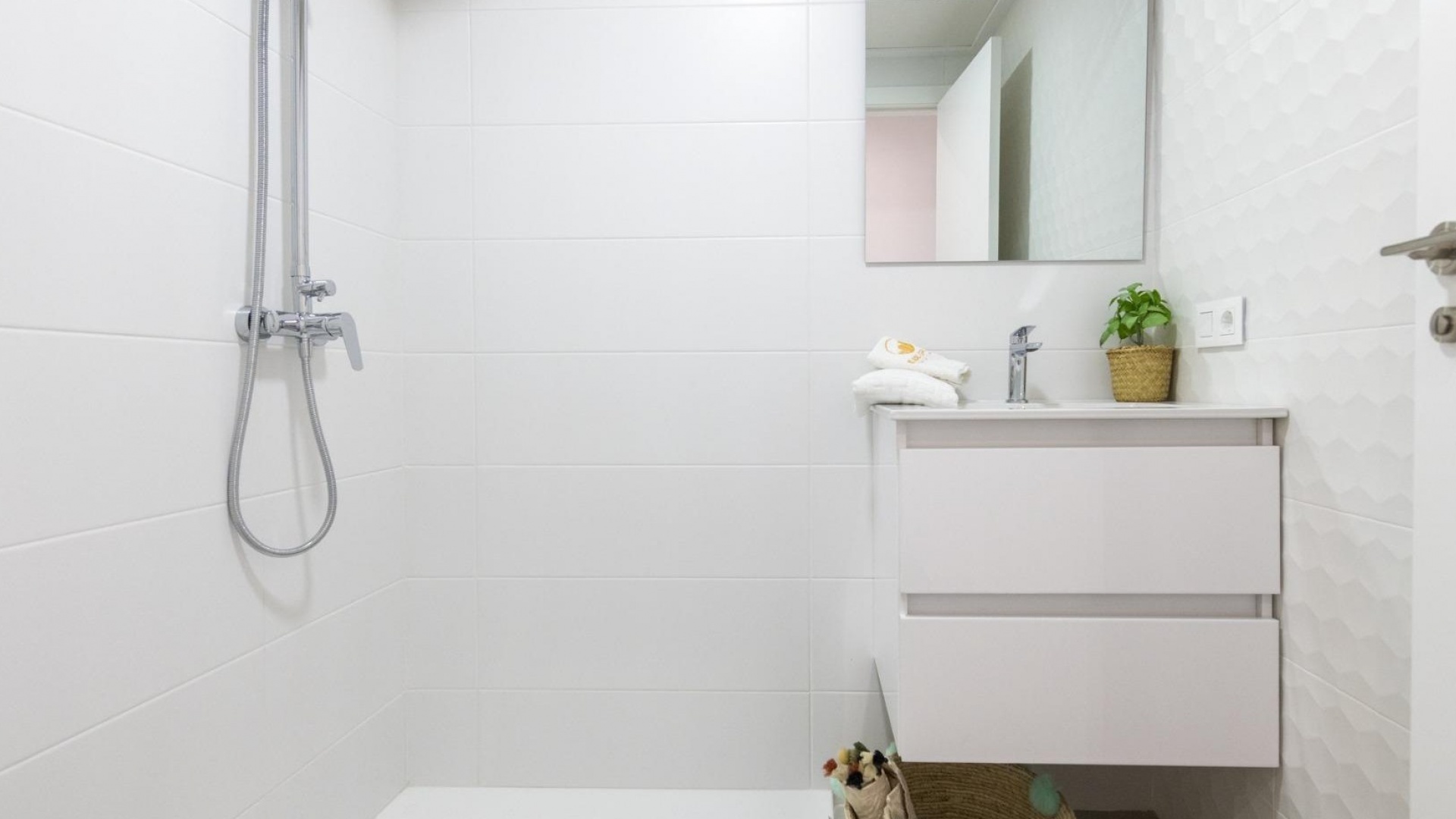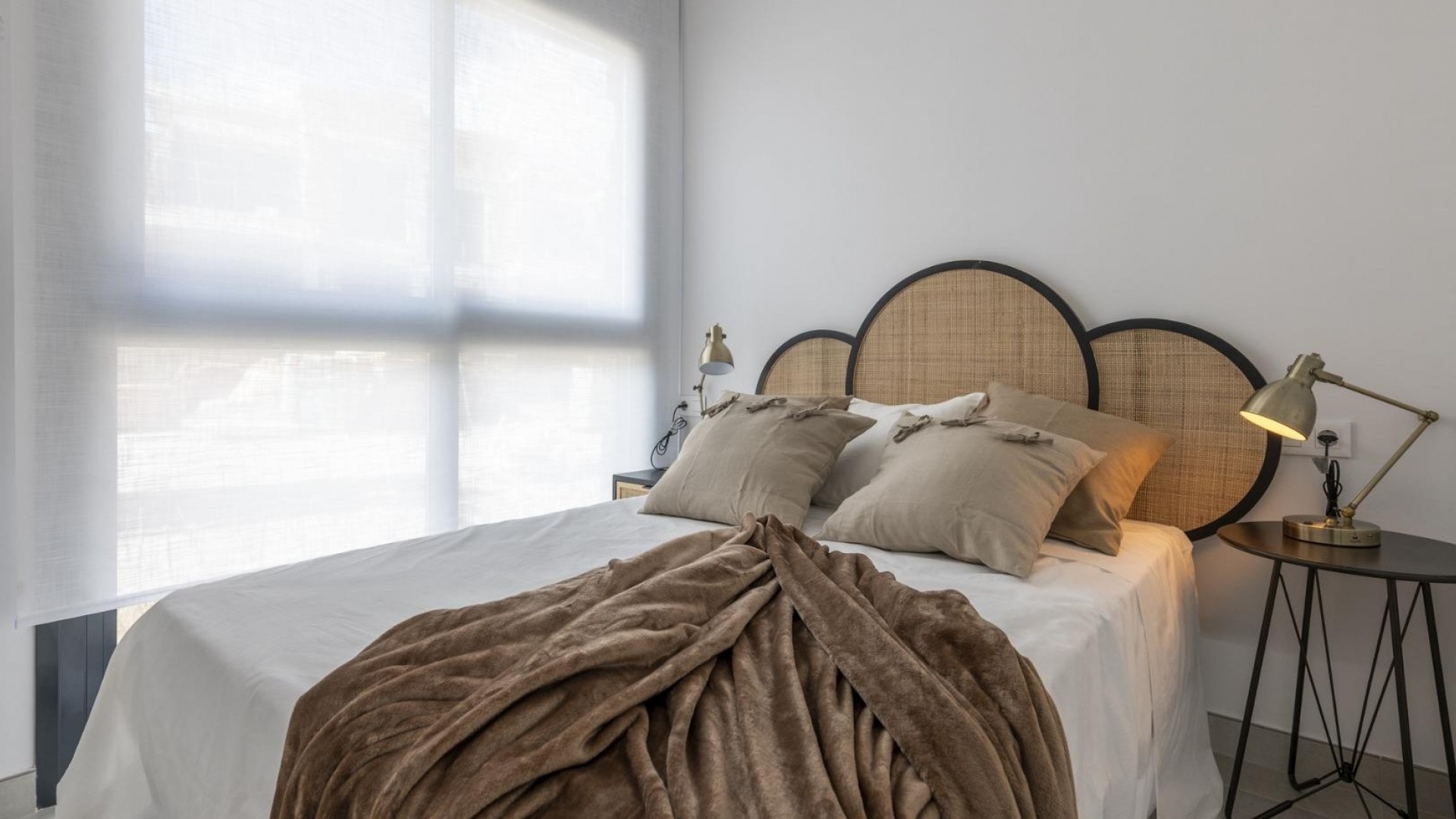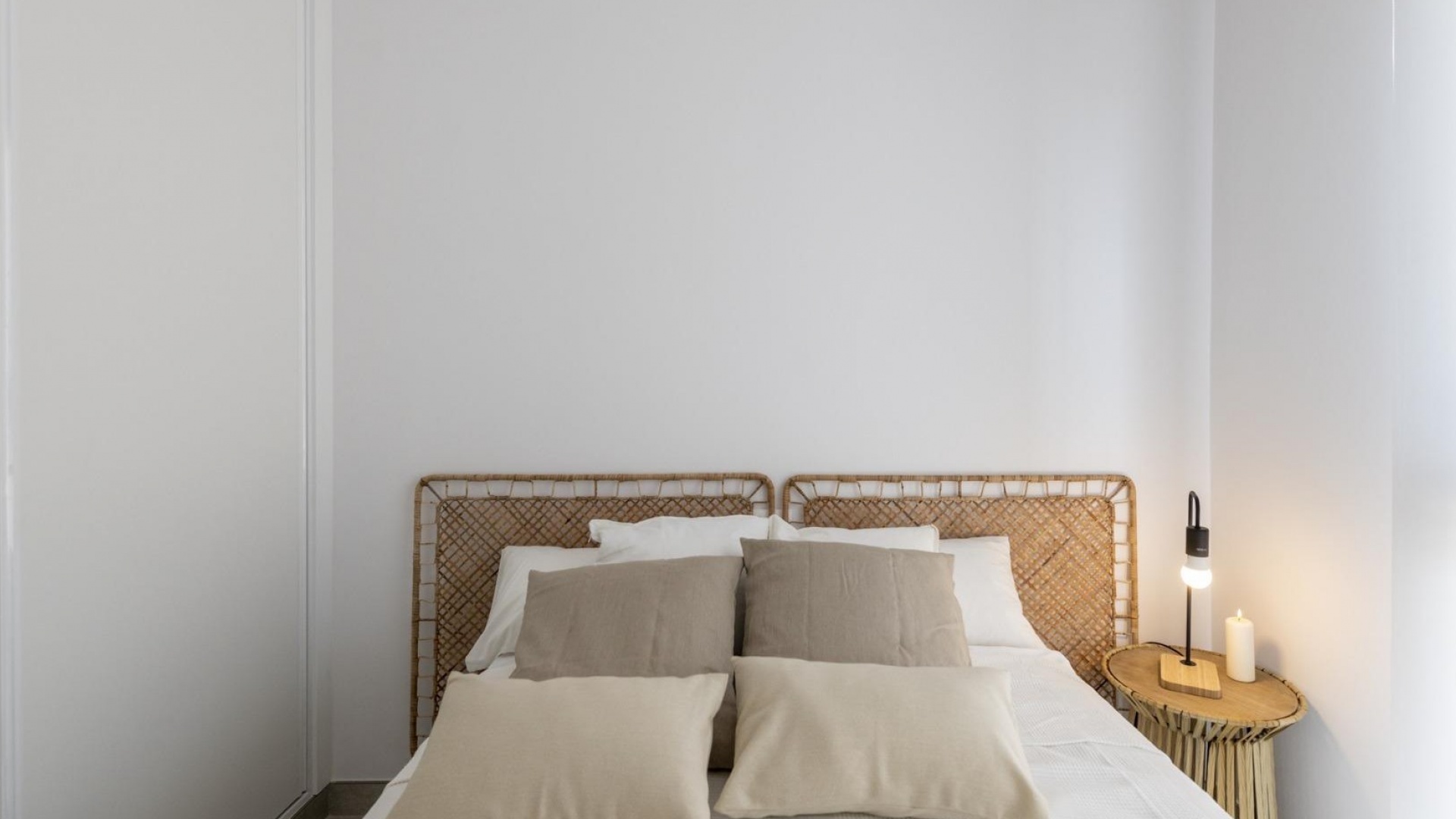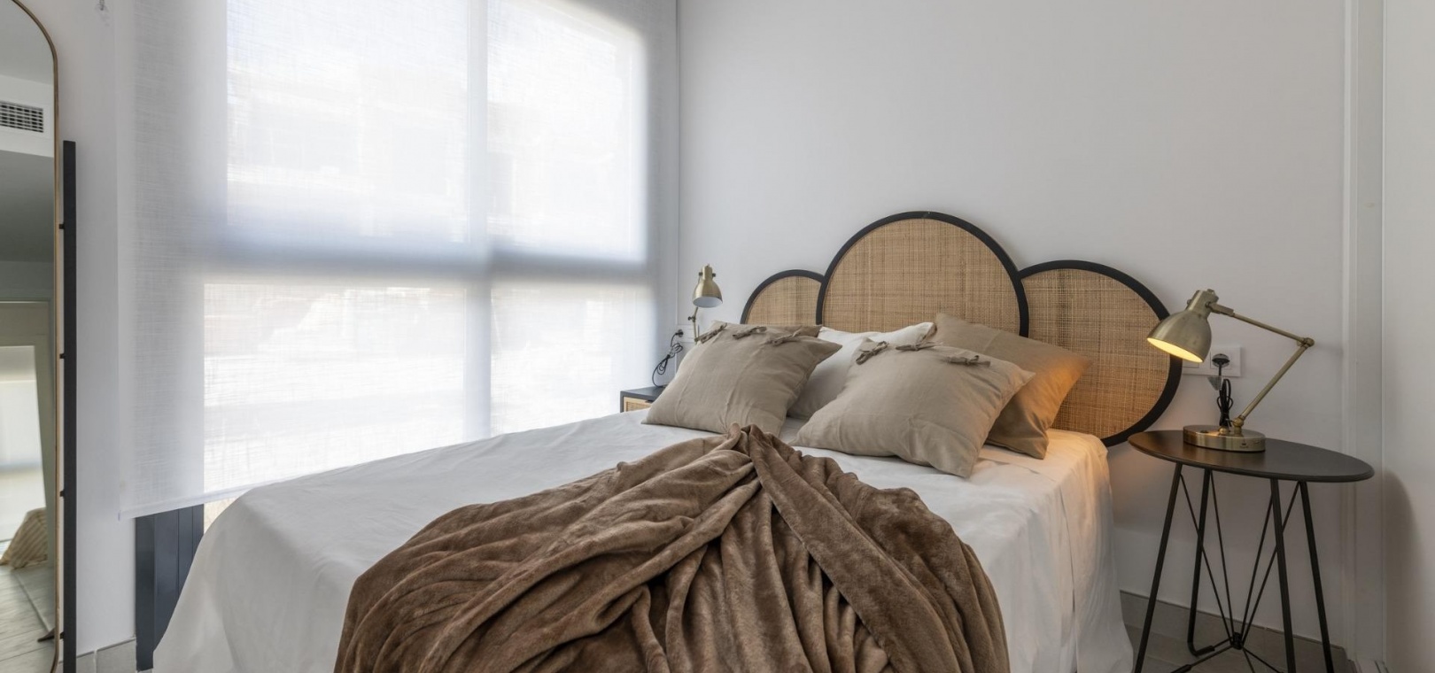 We enter the apartment and arrive in a spacious & bright living room with open plan kitchen & dining area. In front of us are sliding doors to the balcony with pool views. Along one long side of the living room is a passage with access to the two bedrooms and a family bathroom with walk-in shower. The master bedroom has en suit bathroom with walk-in shower and sliding doors to the balcony.