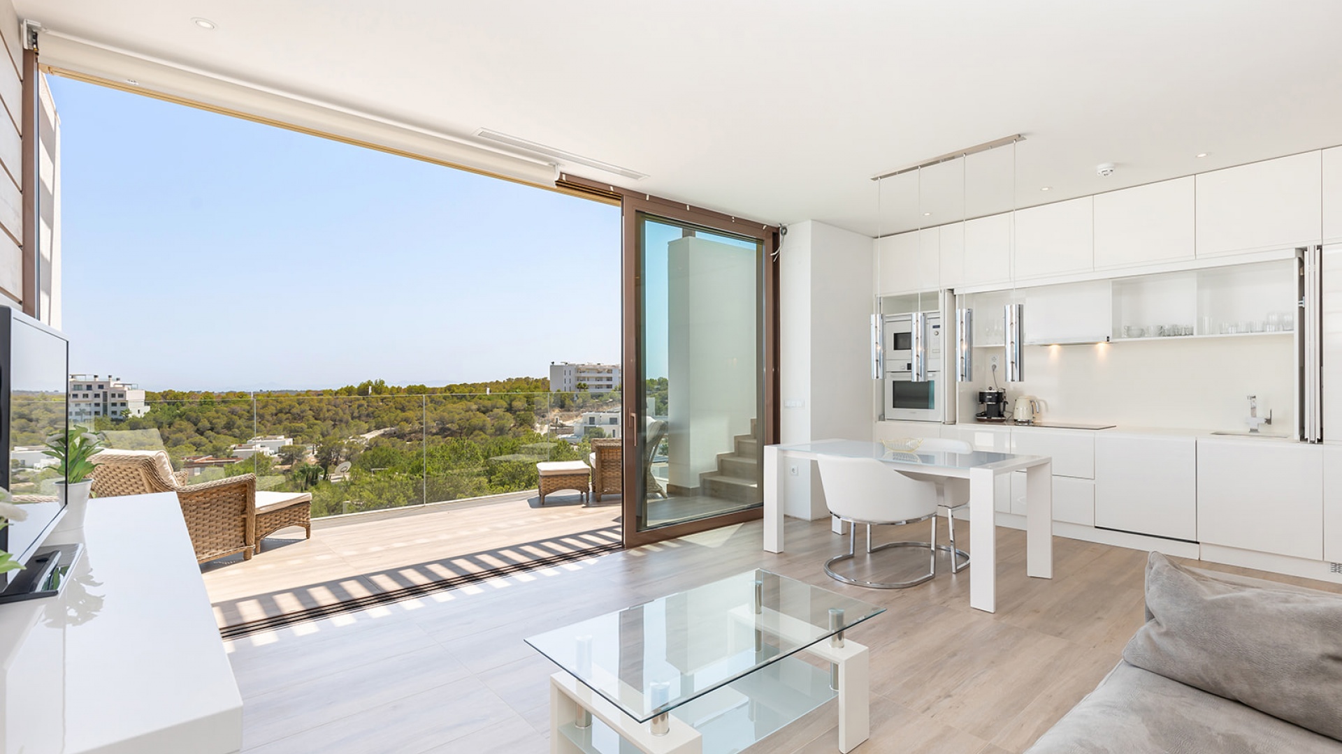Luxury penthouse in Las Colinas Golf. This stunning top floor apartment offers a spacious living-dining room and open kitchen, fully equipped with appliances along with a terrace overlooking the communal pool and green areas. The property has two bright bedrooms and a private solarium with open kitchen. Included in the apartment comes a parking space and a private storage room in the basement.