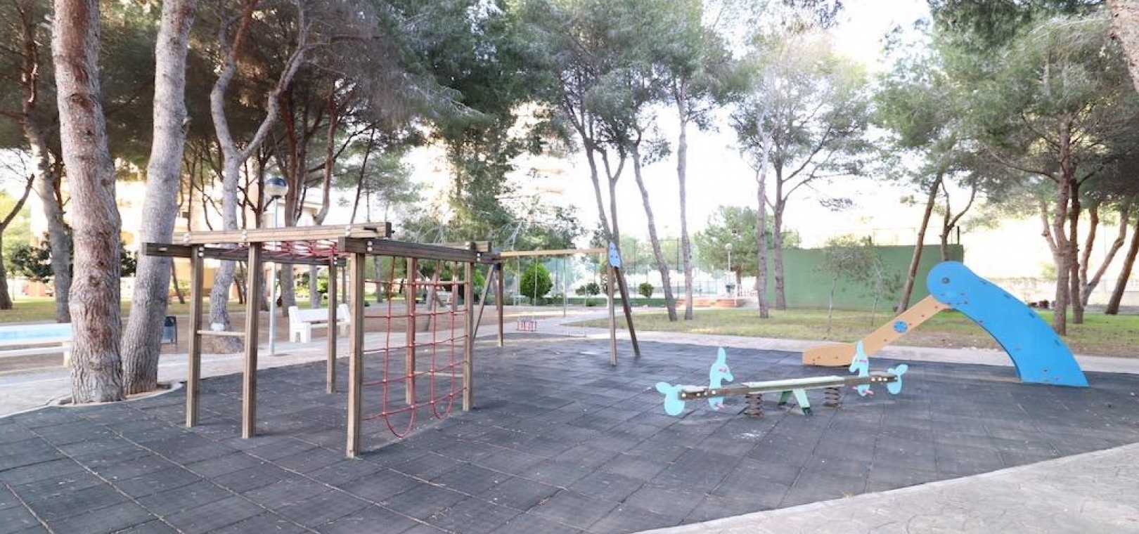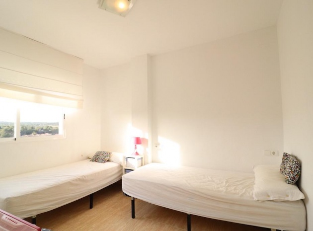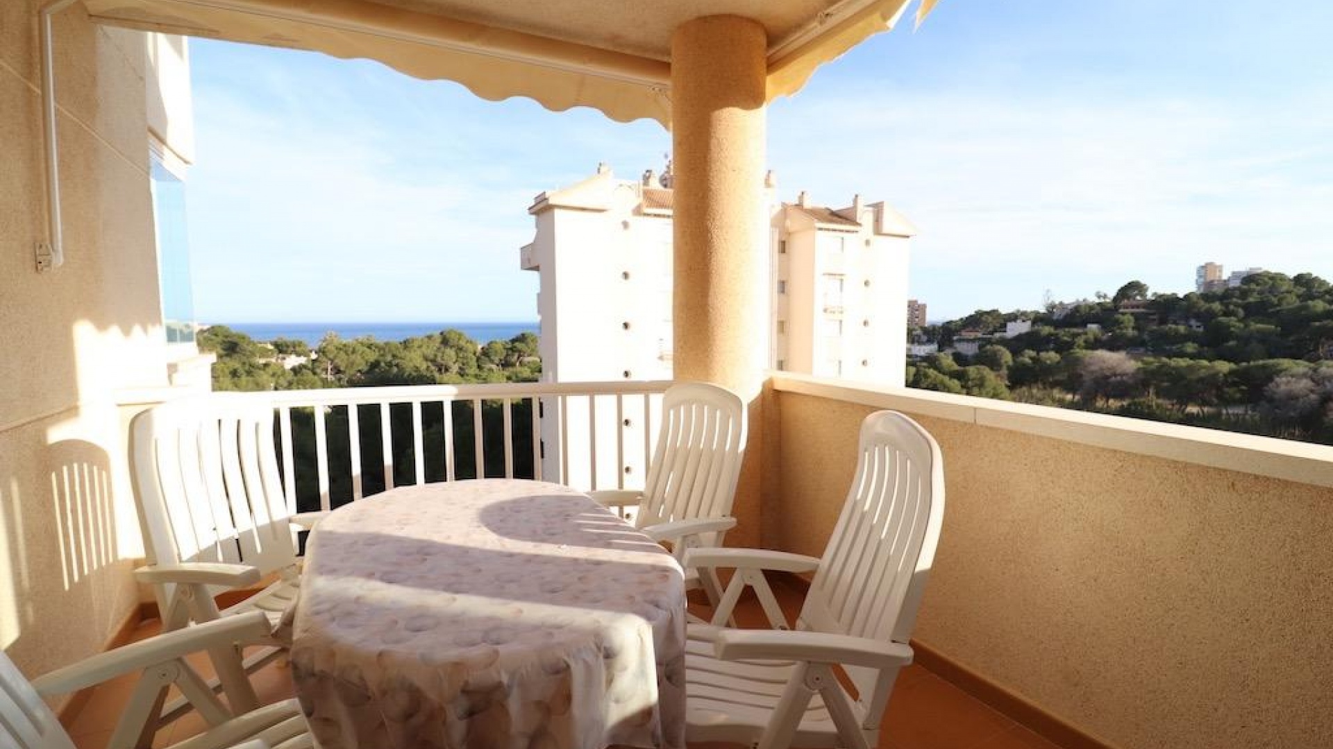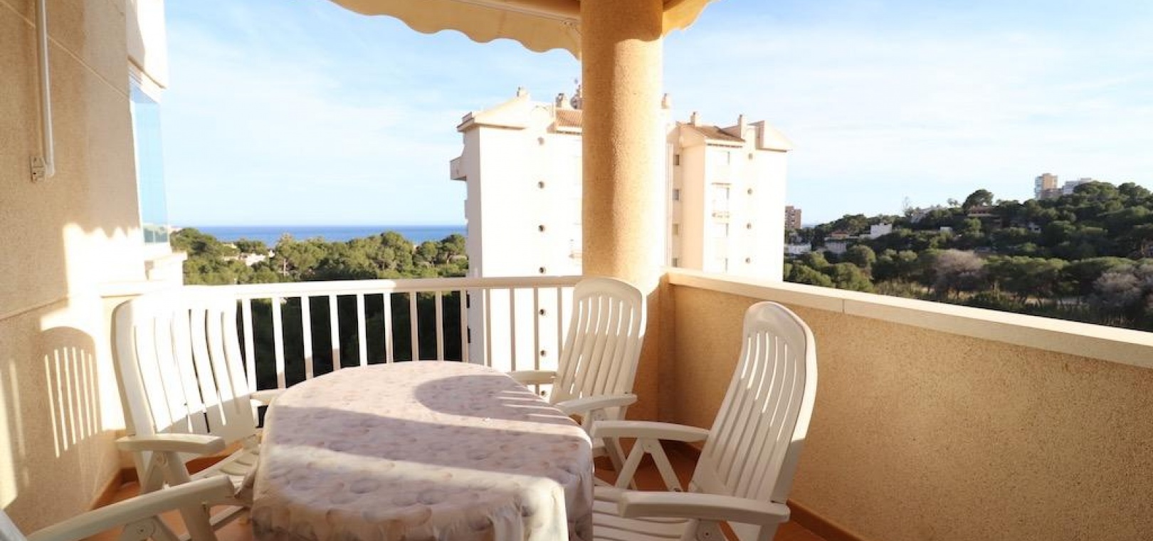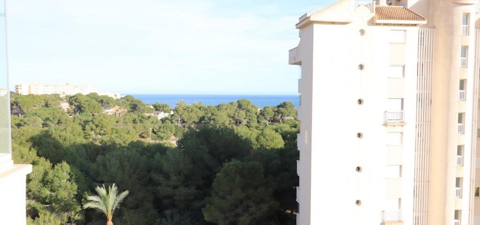 Only 300m from the beach in Pinar de Campoamor. Spacious apartment on 7th floor with sea and pine forest views and south facing.~~99 m2 with 3 bedrooms, 2 bathrooms, spacious and independent kitchen with utility room, living-dining room with large terrace, panoramic views and south facing. ~~It has numbered parking. In a beautiful urbanization with large green areas with communal swimming pool, tennis, paddle tennis, and children's play area.~