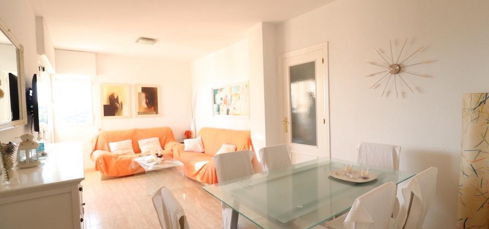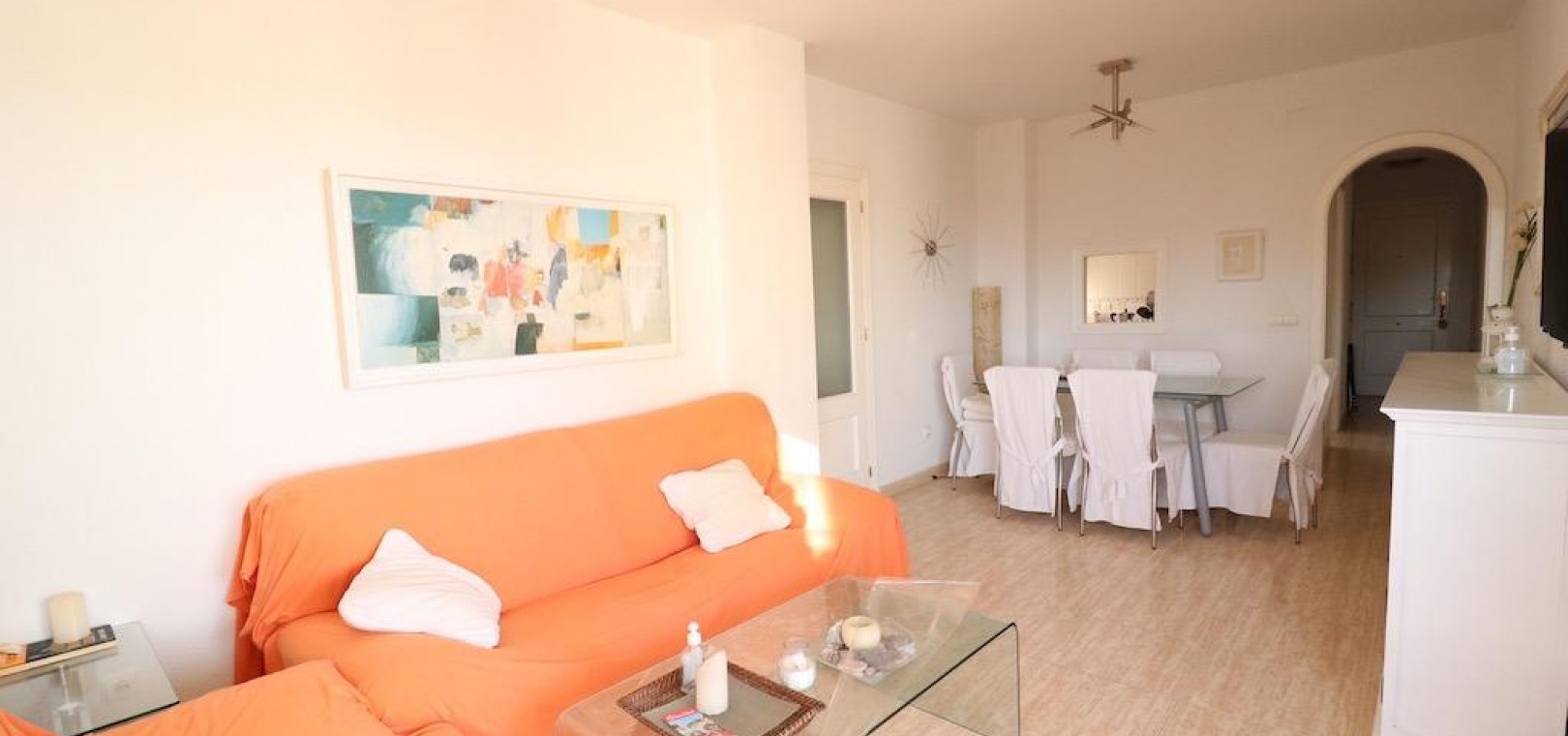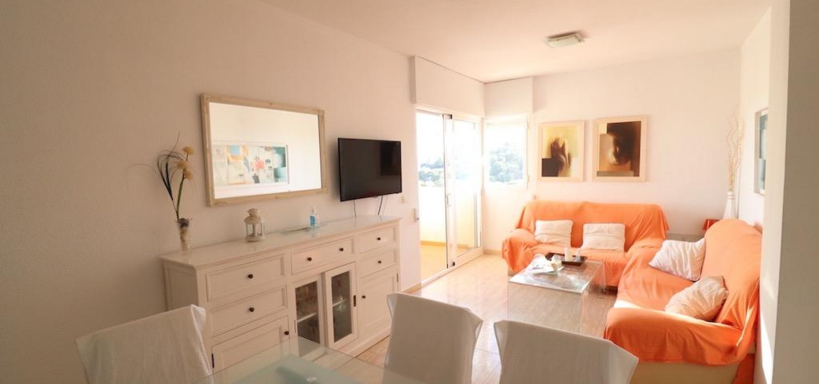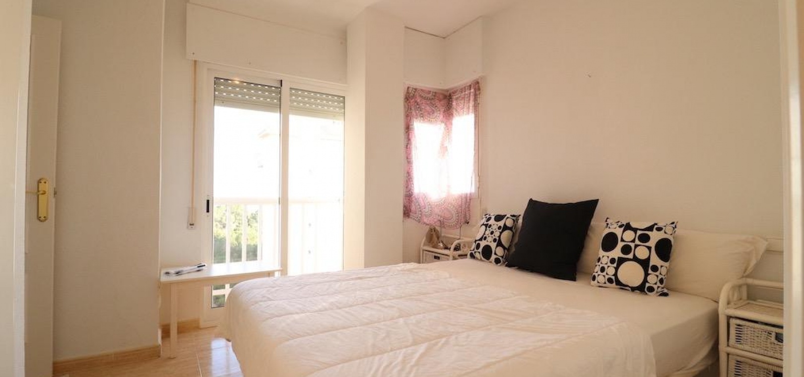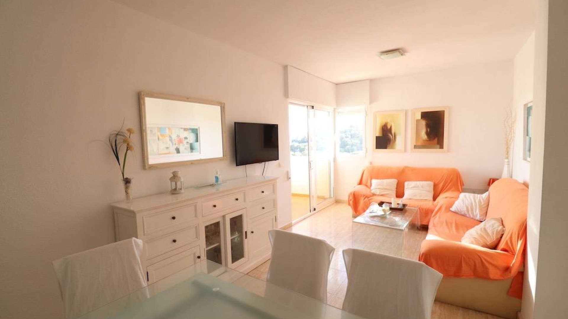 Only 300m from the beach in Pinar de Campoamor. Spacious apartment on 7th floor with sea and pine forest views and south facing.~~99 m2 with 3 bedrooms, 2 bathrooms, spacious and independent kitchen with utility room, living-dining room with large terrace, panoramic views and south facing. ~~It has numbered parking. In a beautiful urbanization with large green areas with communal swimming pool, tennis, paddle tennis, and children's play area.~