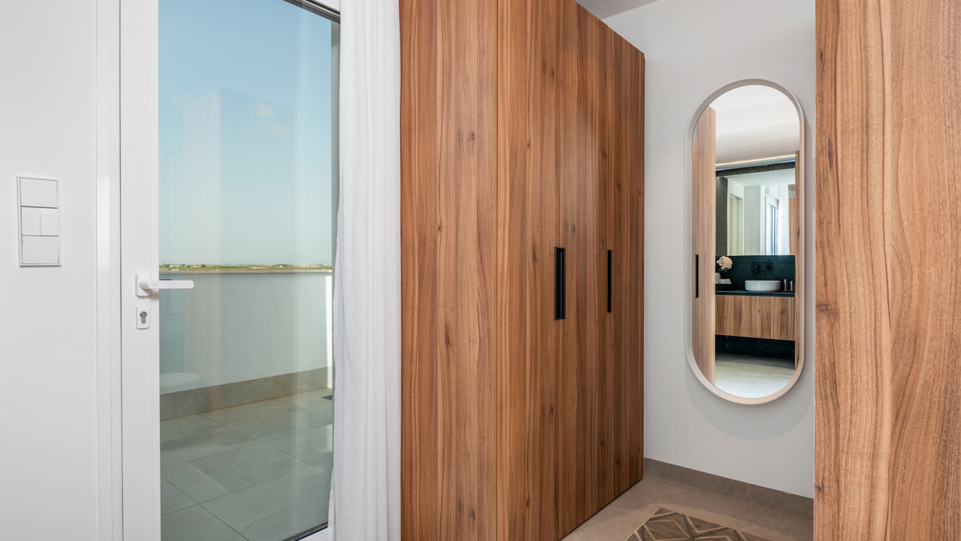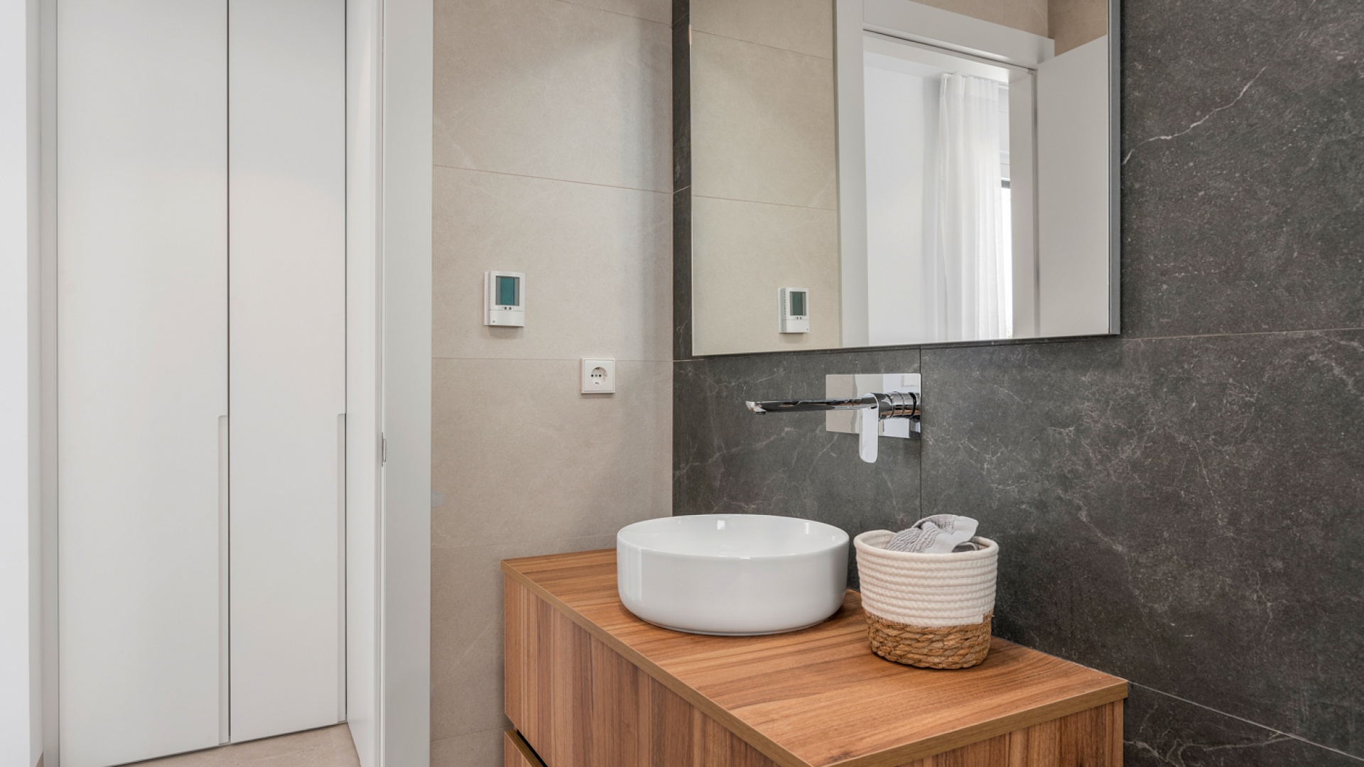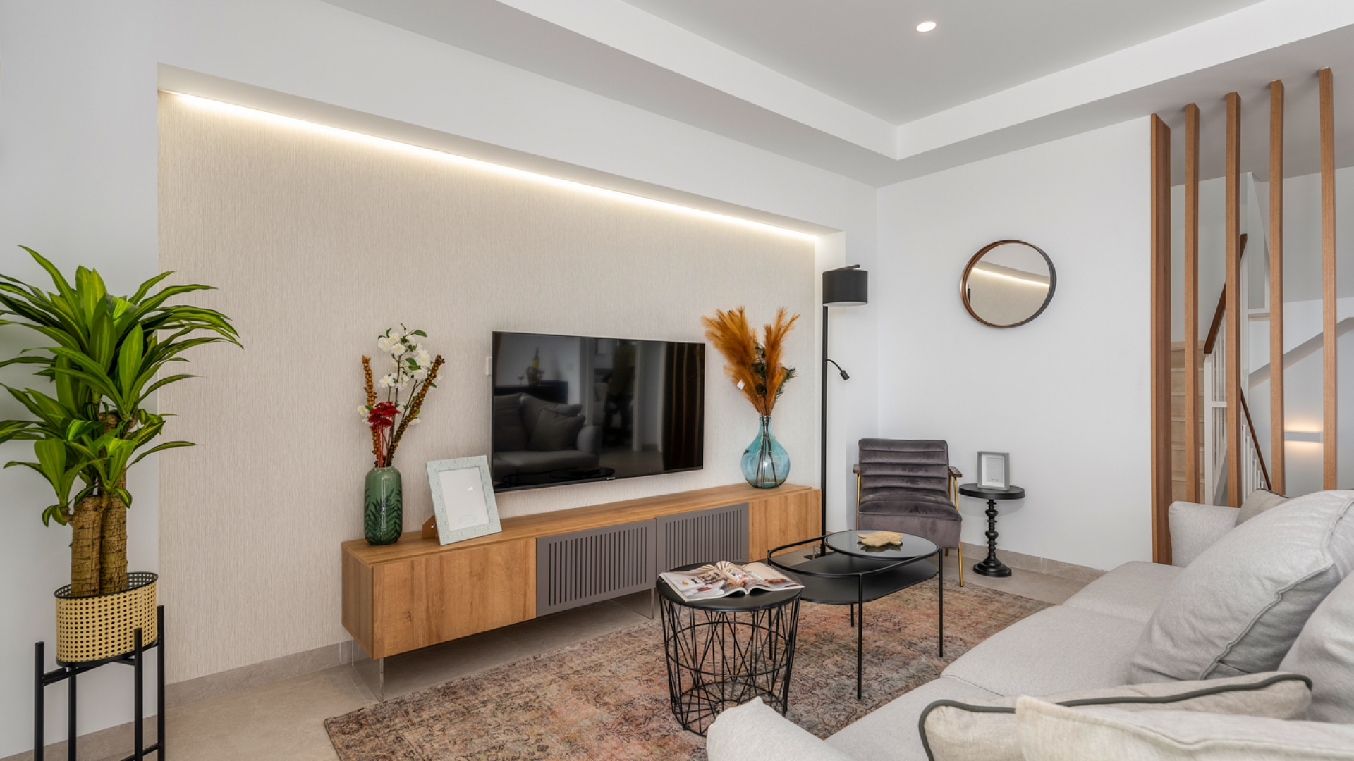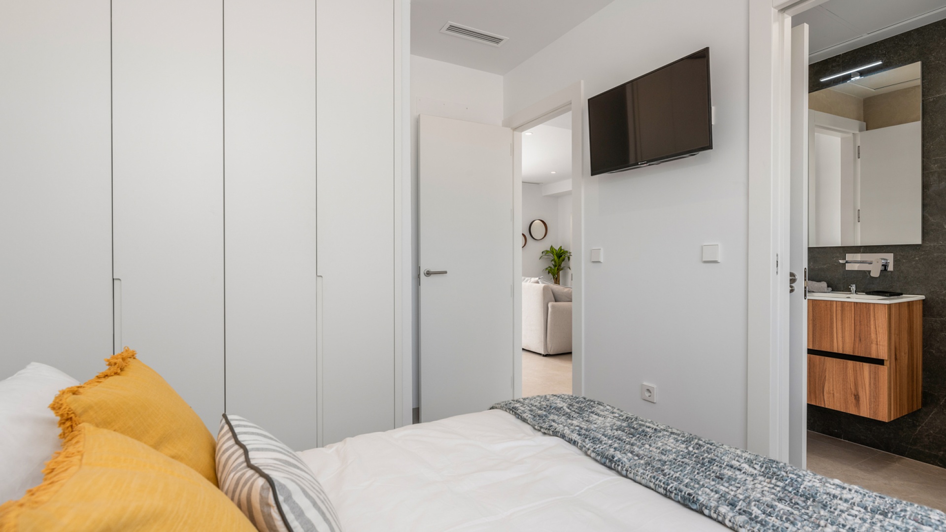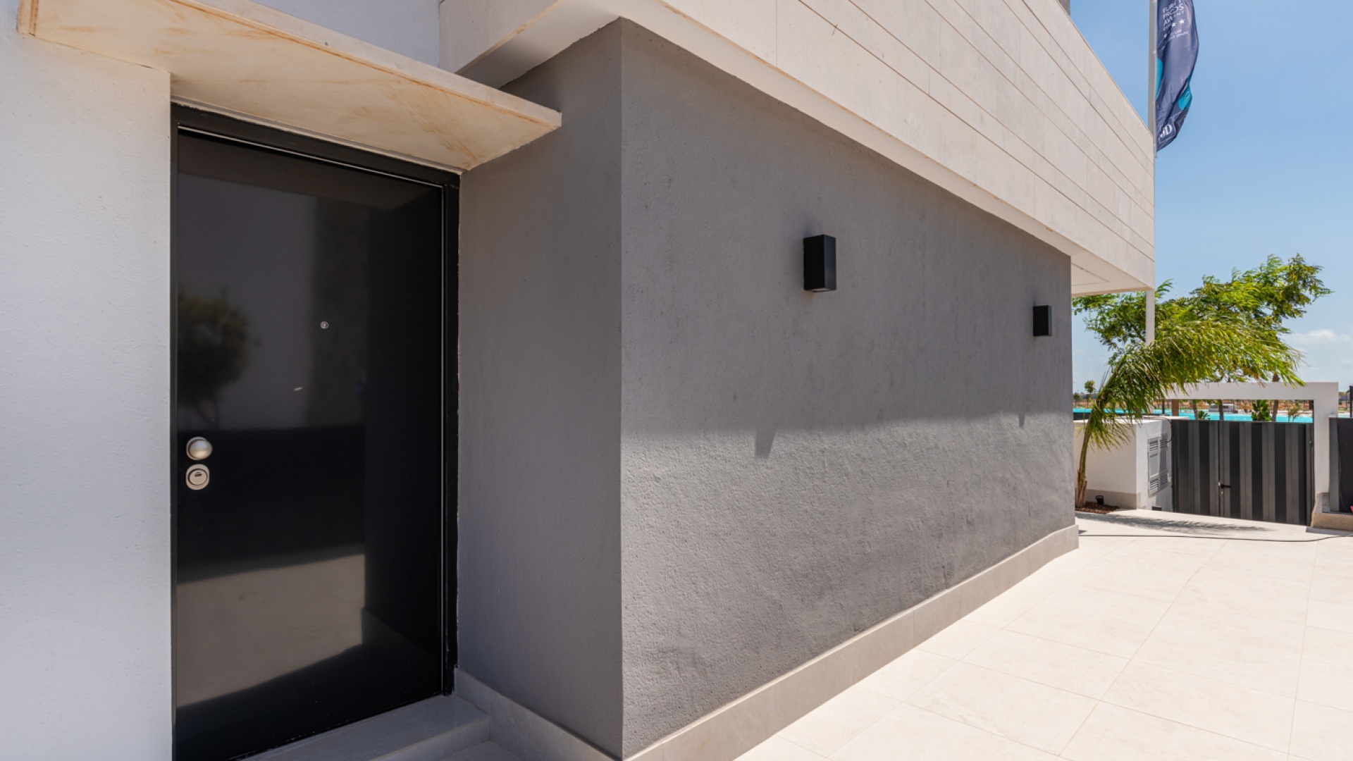 This stylish and modern villa comprises three bedrooms/three bathrooms, an open plan lounge/dining room, a fully fitted kitchen and a good size basement. Outside there is a swimming pool and well-landscaped private garden, plus access to a roof terrace with views of the complex. The plot also has parking for up to one vehicle and a charging point for electric cars.