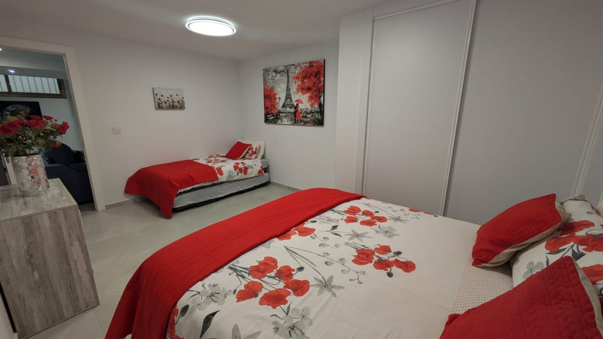 Basement – Living area with a sofa and tv, 2 very large bedrooms, 1 full bathroom, utility room with a washing machine, tumble dryer and boiler, large storage room.