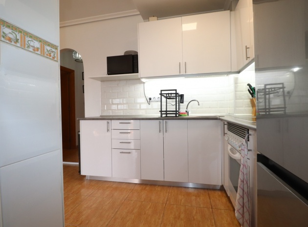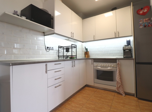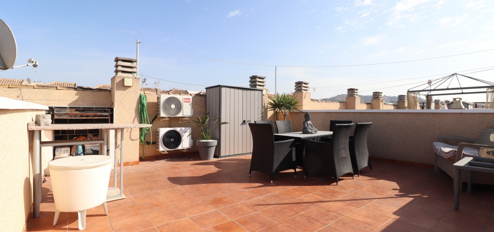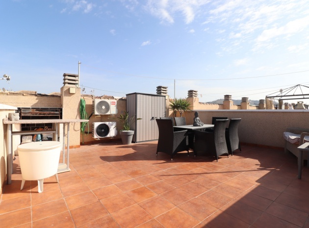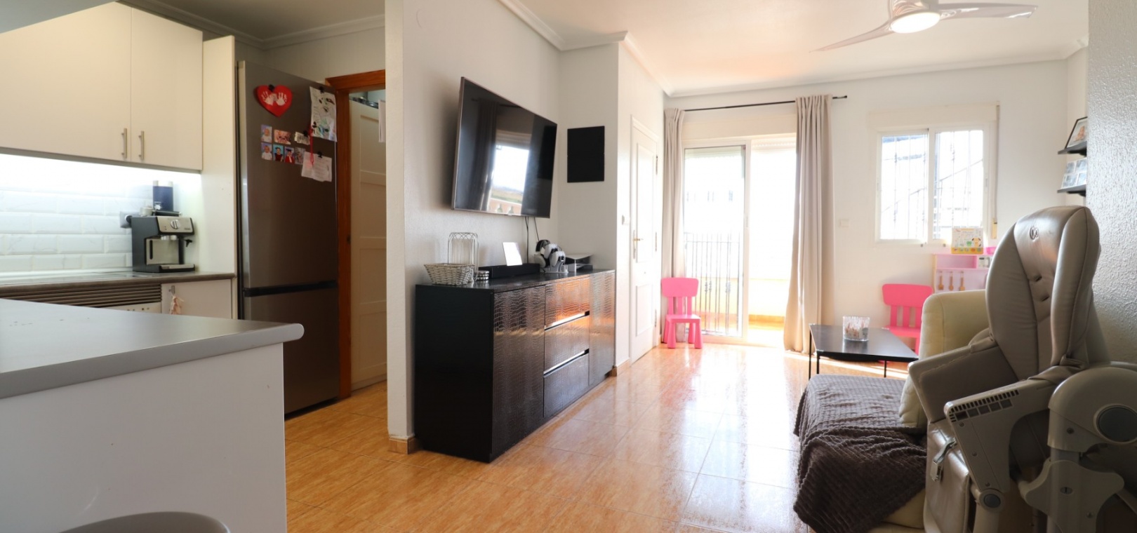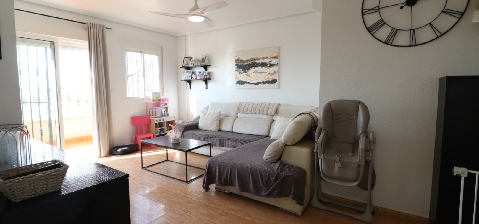 This Updated, West Facing, Two Bedroom, Top Floor Apartment in Los Palacios is located in a prominent position with vast, panoramic and open countryside + mountain views that stretch as far as the eye can see. This charming 2-bedroom, 1-bathroom apartment has been tastefully updated, offering modern comfort and style in a highly desirable location. The spacious living room is bright and airy, leading seamlessly to a contemporary open-plan, fully fitted kitchen with an adjoining utility room for added convenience. The front uncovered terrace, accessible from the living room, provides the perfect spot for morning coffee while enjoying the sweeping views. From here, a spiral staircase leads to the large private rooftop solarium, complete with a fitted BBQ area—ideal for entertaining, dining under the stars, or simply relaxing while soaking in the stunning sunset views. The master bedroom features fitted wardrobes and modern ceiling fans, while the updated shower room boasts a sleek walk-in shower. Additional features include air conditioning in the living room and master bedroom, grilles on the front and terrace doors, and stylish ceiling fans in both bedrooms, ensuring year-round comfort. This apartment is not part of a community, meaning there are no community fees to worry about. Yet, the municipal pool is literally just a 30-second walk away, perfect for cooling off on warm days. All essential amenities and facilities, including main-brand supermarkets, are within a 5-minute walk, while the award-winning, blue flag beaches of Guardamar del Segura are only an 8-minute drive away. Whether you're looking for a holiday retreat, a permanent home, or a rental investment, this property truly offers it all—breathtaking views, modern comforts, and unbeatable convenience in the heart of the Costa Blanca South.