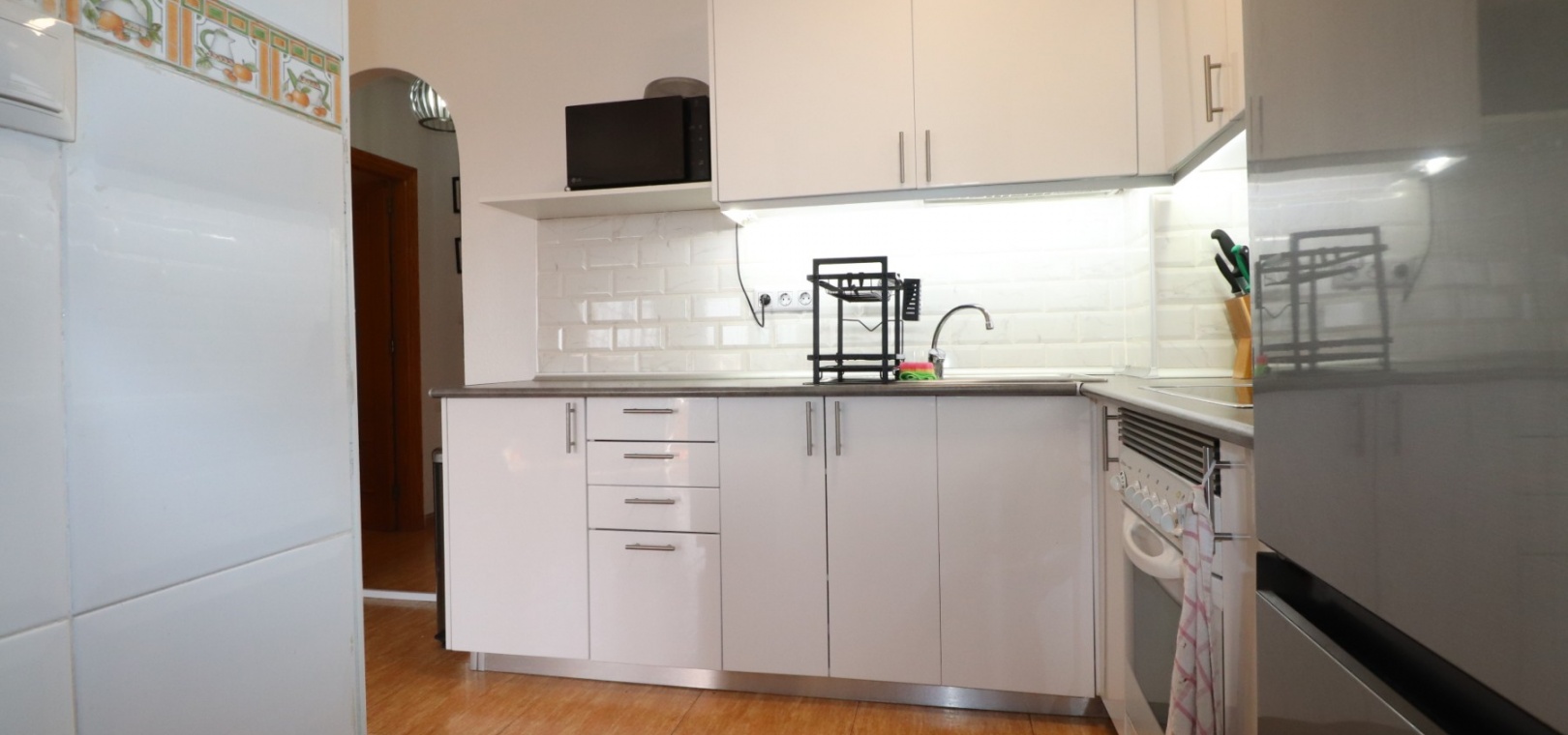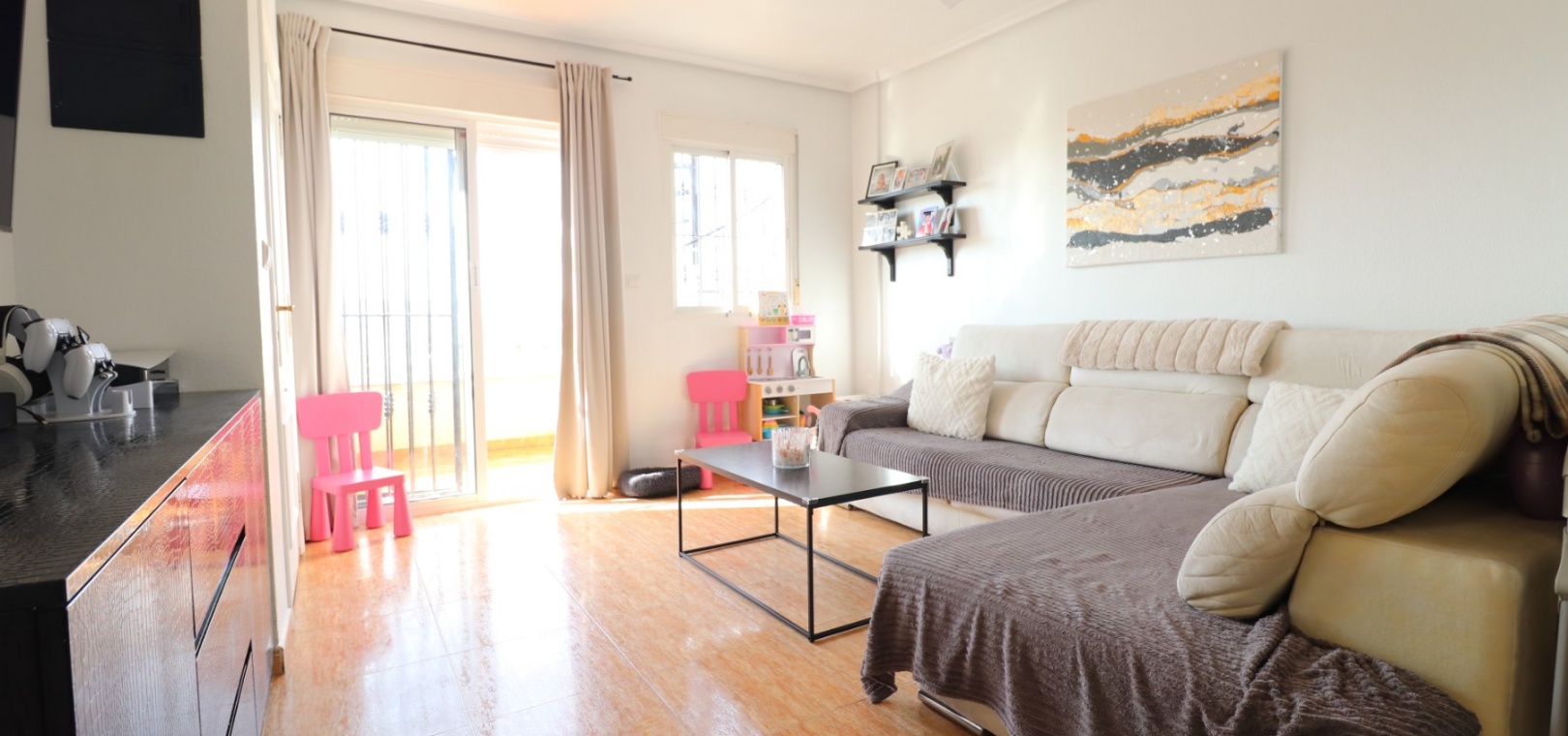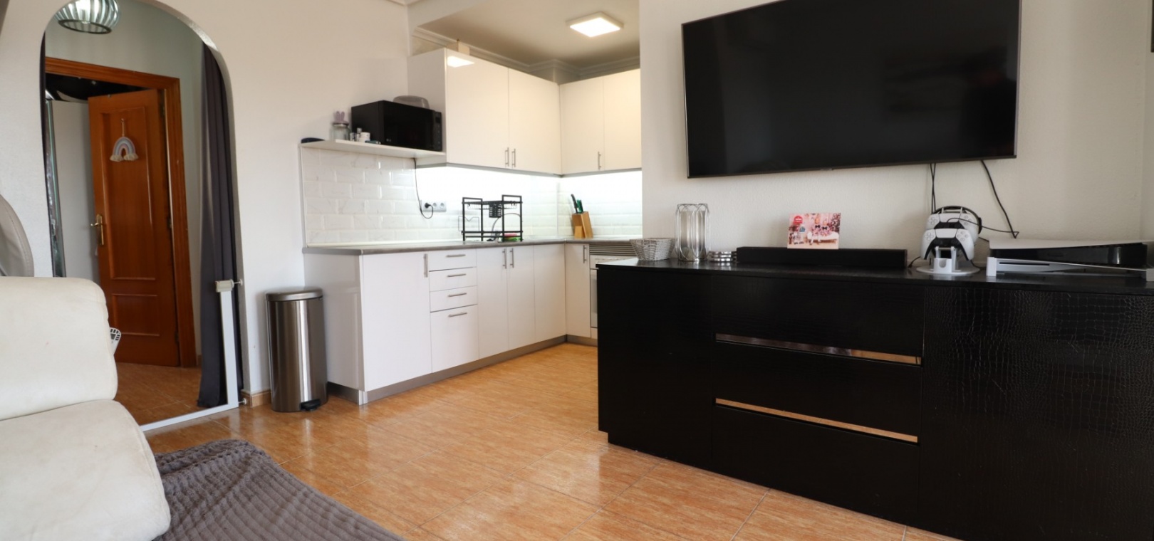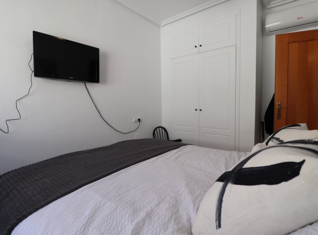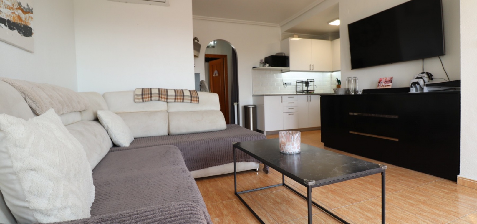 This Updated, West Facing, Two Bedroom, Top Floor Apartment in Los Palacios is located in a prominent position with vast, panoramic and open countryside + mountain views that stretch as far as the eye can see. This charming 2-bedroom, 1-bathroom apartment has been tastefully updated, offering modern comfort and style in a highly desirable location. The spacious living room is bright and airy, leading seamlessly to a contemporary open-plan, fully fitted kitchen with an adjoining utility room for added convenience. The front uncovered terrace, accessible from the living room, provides the perfect spot for morning coffee while enjoying the sweeping views. From here, a spiral staircase leads to the large private rooftop solarium, complete with a fitted BBQ area—ideal for entertaining, dining under the stars, or simply relaxing while soaking in the stunning sunset views. The master bedroom features fitted wardrobes and modern ceiling fans, while the updated shower room boasts a sleek walk-in shower. Additional features include air conditioning in the living room and master bedroom, grilles on the front and terrace doors, and stylish ceiling fans in both bedrooms, ensuring year-round comfort. This apartment is not part of a community, meaning there are no community fees to worry about. Yet, the municipal pool is literally just a 30-second walk away, perfect for cooling off on warm days. All essential amenities and facilities, including main-brand supermarkets, are within a 5-minute walk, while the award-winning, blue flag beaches of Guardamar del Segura are only an 8-minute drive away. Whether you're looking for a holiday retreat, a permanent home, or a rental investment, this property truly offers it all—breathtaking views, modern comforts, and unbeatable convenience in the heart of the Costa Blanca South.
