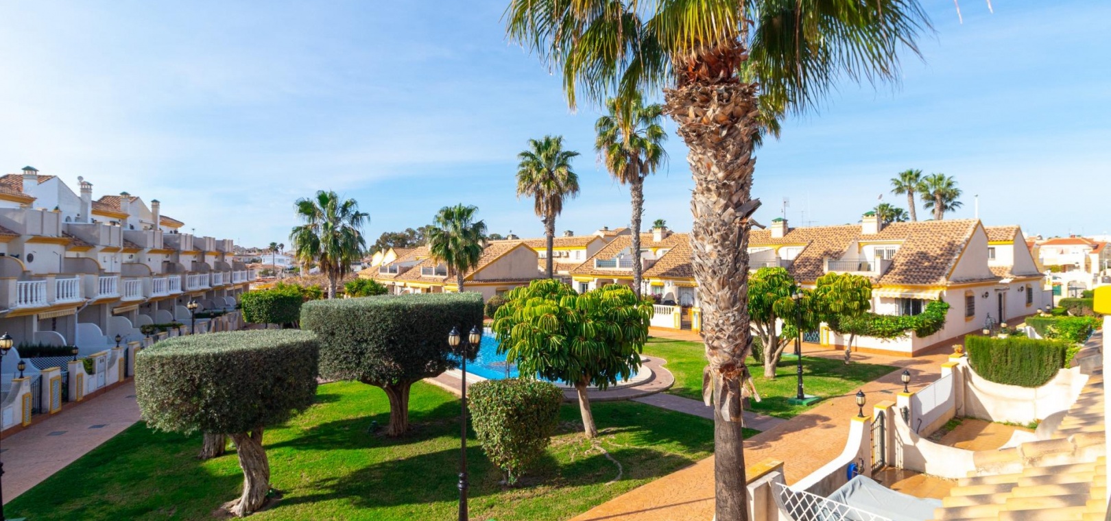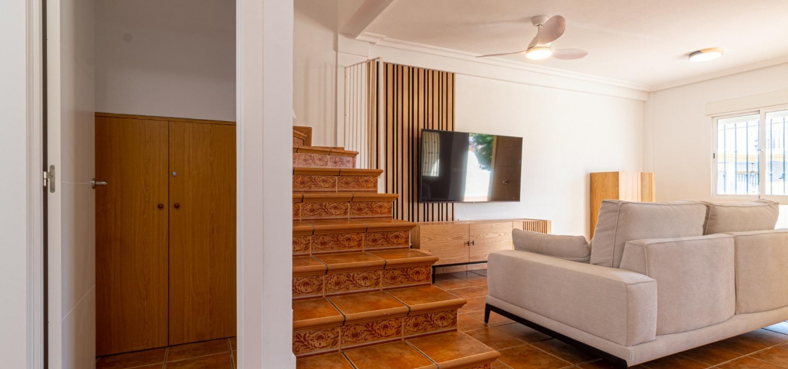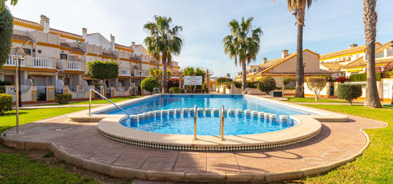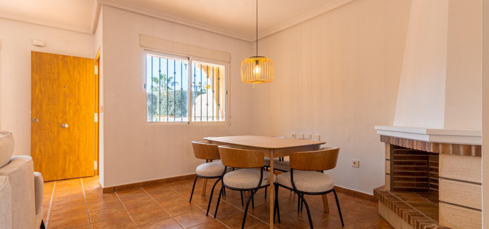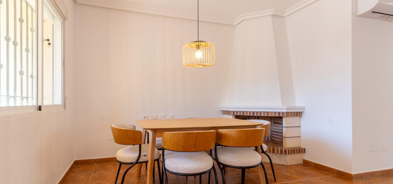 Welcome to your new home in the heart of Orihuela Costa. This brand new renovated semi-detached house, located in a privileged residential area, offers you a comfortable and modern life just a step away from Cabo Roig beach and all services. ~The house, distributed over two floors, has three spacious and bright bedrooms: one on the ground floor, ideal for guests or as an office, and two more on the upper floor, each with its own charm. Two full bathrooms equipped with high quality materials complete the layout. ~The kitchen, completely new and brand new, has direct access to a practical gallery, making it the ideal entrance to unload shopping bags comfortably. From the living room, with its cozy fireplace perfect for cooler nights, you can enjoy magnificent views of the green and landscaped areas of the residential area and the sparkling community pool. The air conditioning guarantees unrivaled thermal comfort throughout the year. ~Its location is unbeatable: a short walk from Cabo Roig beach and surrounded by a wide variety of services, including supermarkets, restaurants, shops and public transport. Everything you need at your fingertips. ~This renovated townhouse is a unique opportunity to enjoy the Mediterranean lifestyle in a quiet and privileged environment. Don't miss the opportunity to visit it!