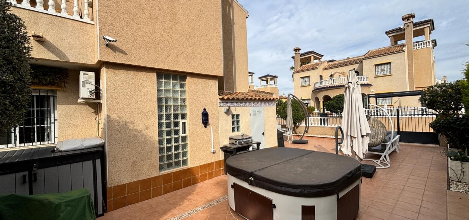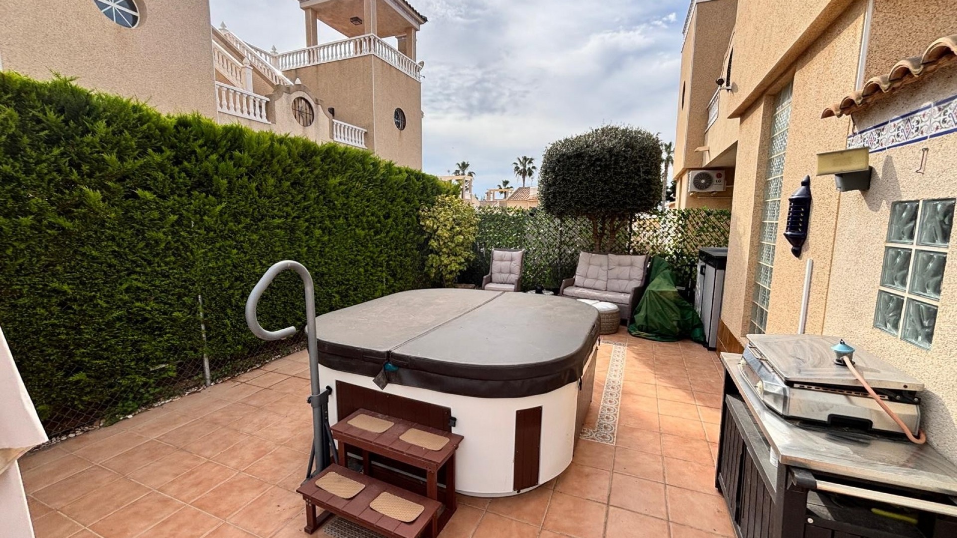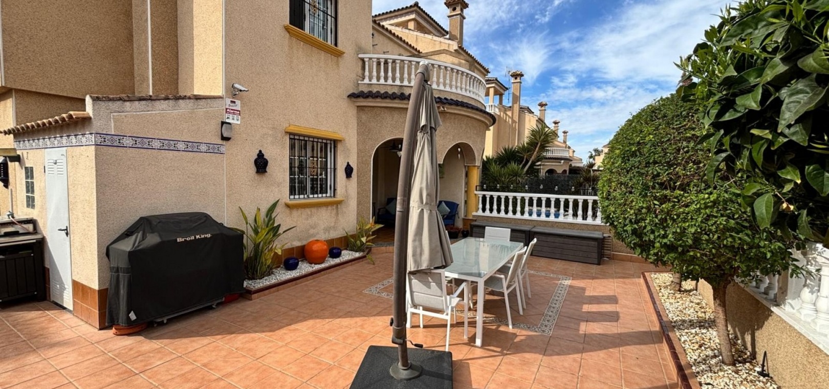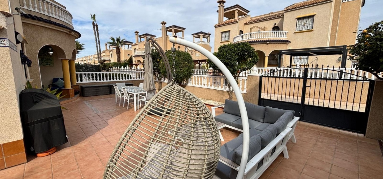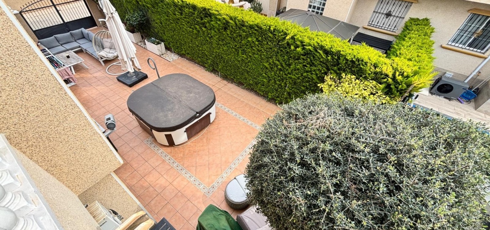An exceptional quad townhouse. This is a very nicely presented 3 bedroom property set on a large plot of approx. 200m2 with a large tiled terrace for relaxing and sunbathing with various seating areas including a jacuzzi. You enter the house of approx. 100m2, onto a covered terrace leading into the open plan dining and lounge area bathed in natural sunlight with air conditioning and ceiling fans, with a spacious fully fitted modern kitchen. Also on the ground floor is a guest bedroom with fitted wardrobes currently being used as a dining area also with air conditioning and a ceiling fan, plus a large shower room with a utility area. An elegant staircase leads to 2 further double bedrooms each offering air conditioning, ceiling fans and fitted wardrobes, one also boasting a private terrace off, plus there is a large bathroom with walk-in shower. From the landing you will find access to a further staircase with storage facility, leading to the huge solarium, with a purpose built gazebo with sun awnings to three sides allowing for the area to be almost totally enclosed for the cooler evenings. This ´Zodiaco´ style townhouse is to be sold fully furnished to a high standard with many extras including aircon throughout, ceiling fans in all rooms, fitted wardrobes, white goods and storage space, private off road parking and ample street parking, plus access to the large communal pool and sunbathing terrace located just a stroll away.