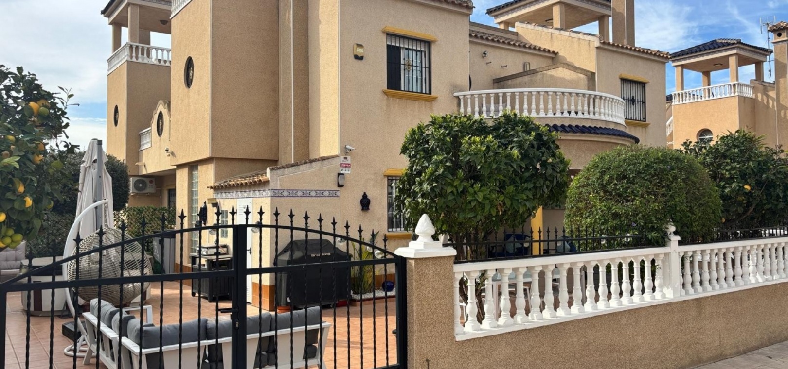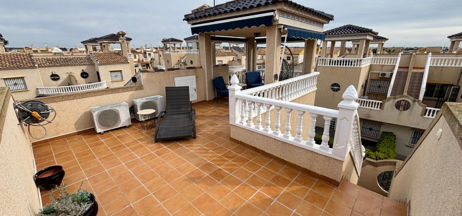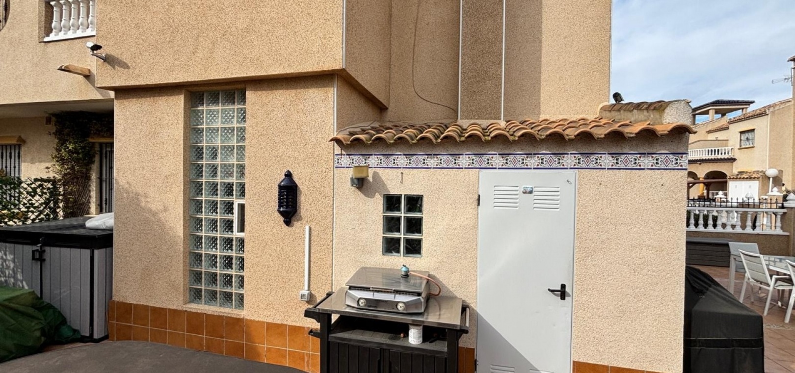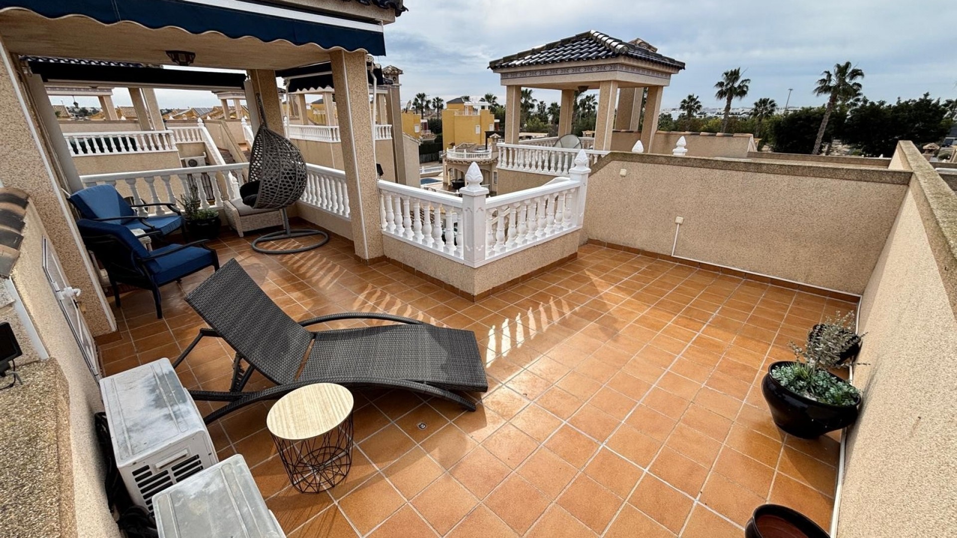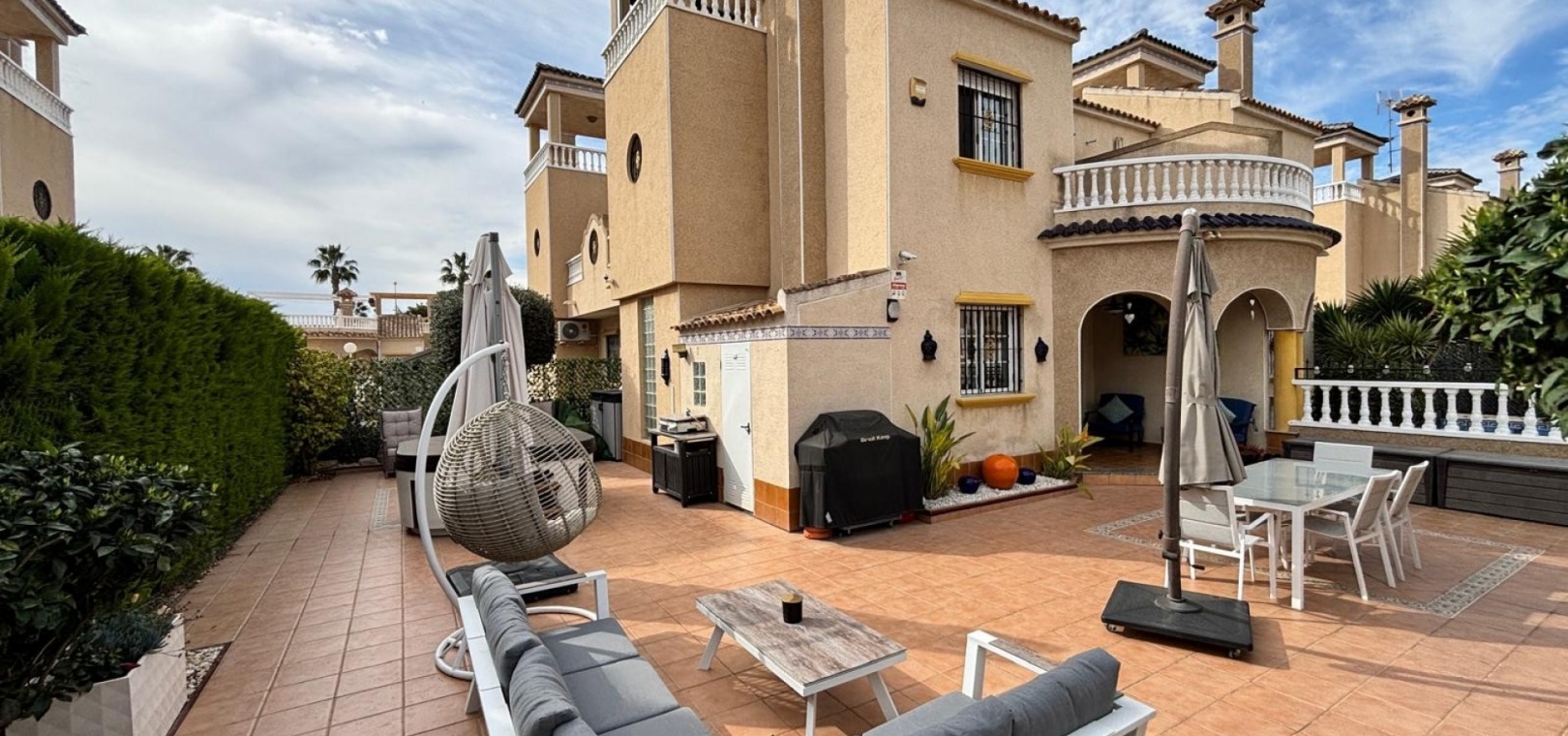 An exceptional quad townhouse. This is a very nicely presented 3 bedroom property set on a large plot of approx. 200m2 with a large tiled terrace for relaxing and sunbathing with various seating areas including a jacuzzi. You enter the house of approx. 100m2, onto a covered terrace leading into the open plan dining and lounge area bathed in natural sunlight with air conditioning and ceiling fans, with a spacious fully fitted modern kitchen. Also on the ground floor is a guest bedroom with fitted wardrobes currently being used as a dining area also with air conditioning and a ceiling fan, plus a large shower room with a utility area. An elegant staircase leads to 2 further double bedrooms each offering air conditioning, ceiling fans and fitted wardrobes, one also boasting a private terrace off, plus there is a large bathroom with walk-in shower. From the landing you will find access to a further staircase with storage facility, leading to the huge solarium, with a purpose built gazebo with sun awnings to three sides allowing for the area to be almost totally enclosed for the cooler evenings. This ´Zodiaco´ style townhouse is to be sold fully furnished to a high standard with many extras including aircon throughout, ceiling fans in all rooms, fitted wardrobes, white goods and storage space, private off road parking and ample street parking, plus access to the large communal pool and sunbathing terrace located just a stroll away.