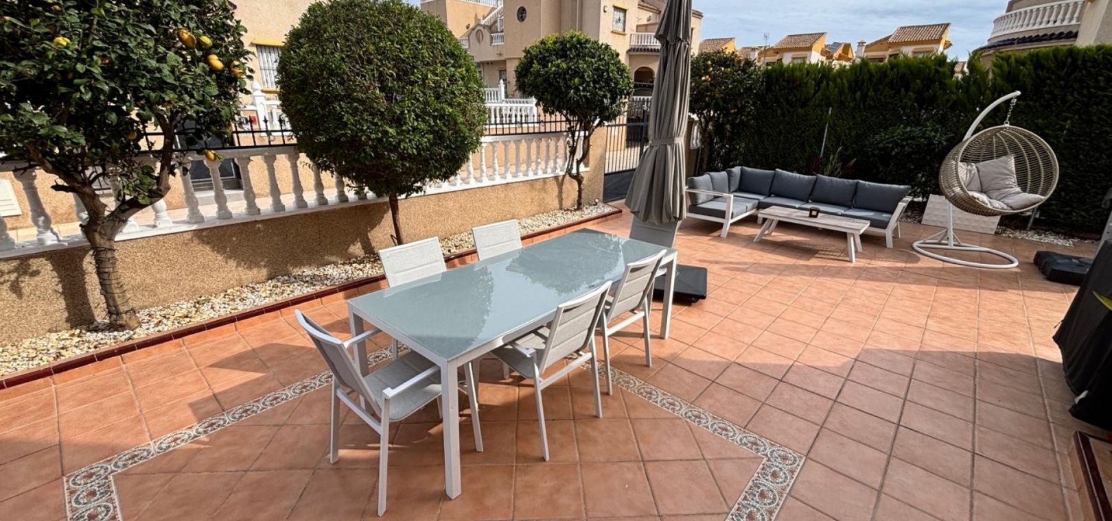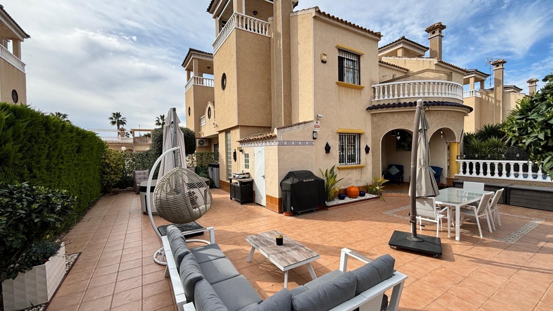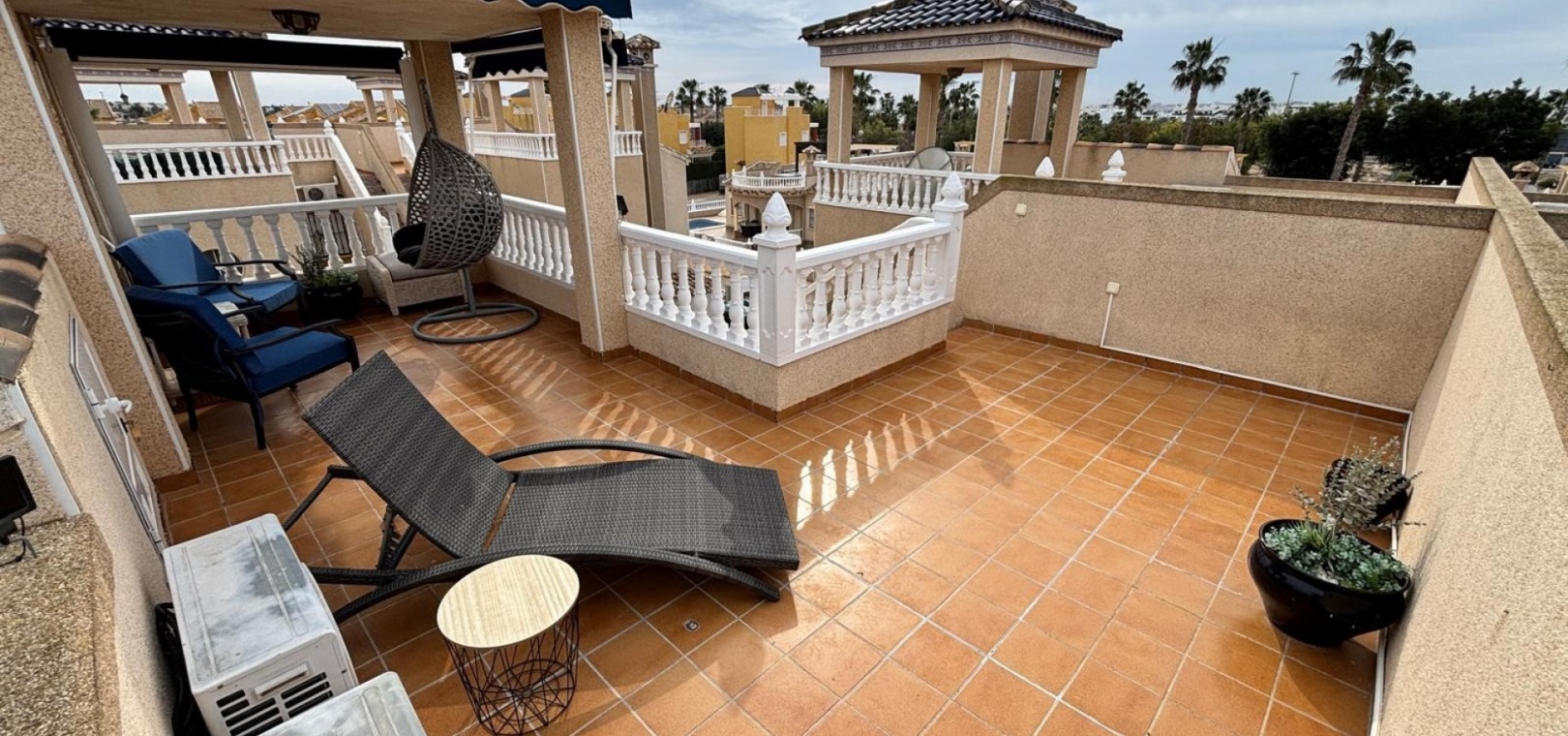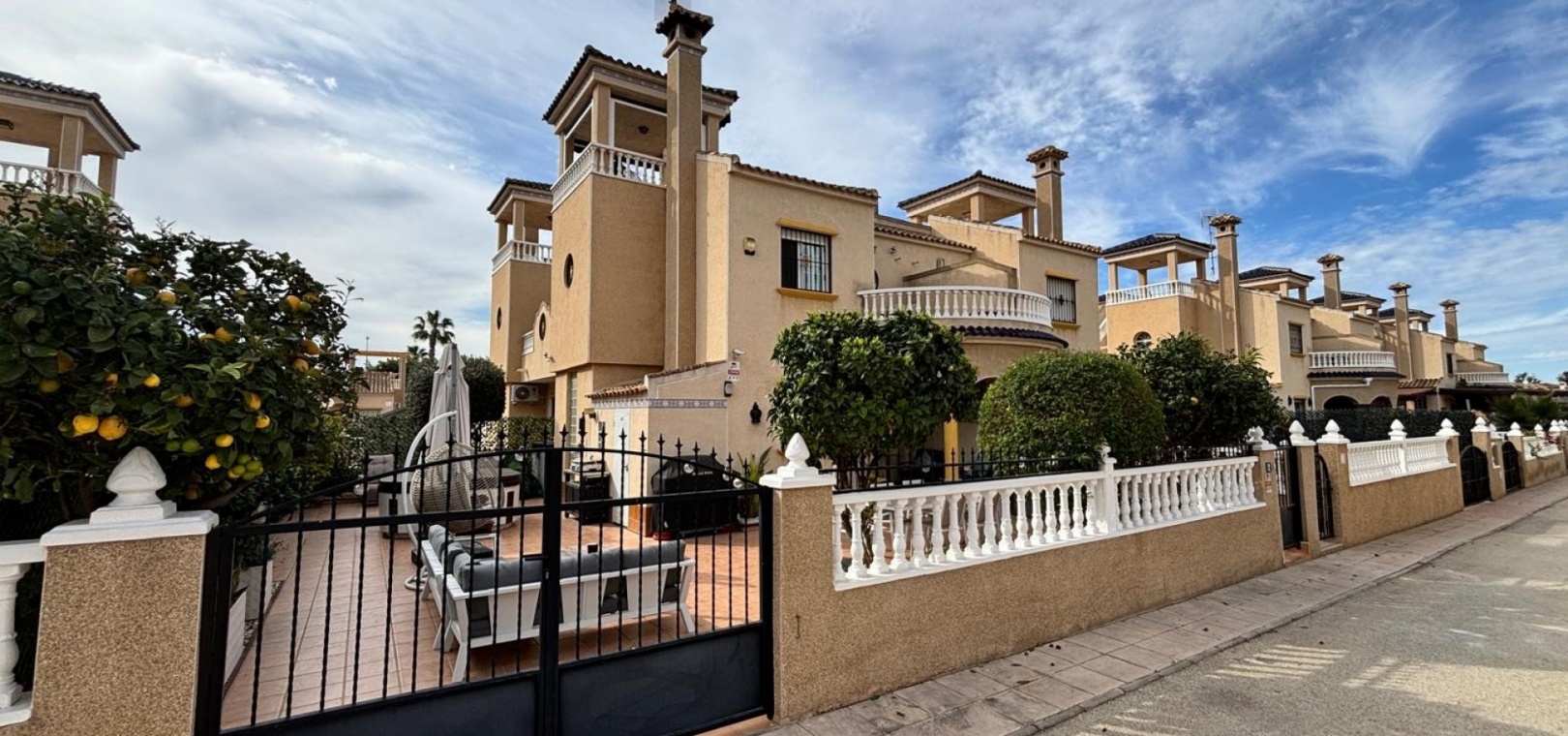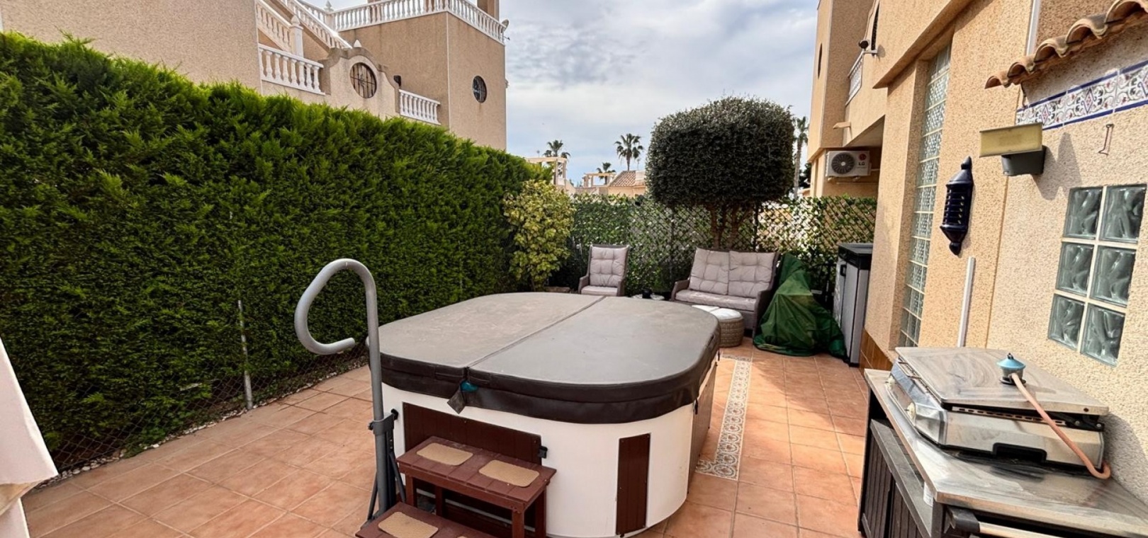 An exceptional quad townhouse. This is a very nicely presented 3 bedroom property set on a large plot of approx. 200m2 with a large tiled terrace for relaxing and sunbathing with various seating areas including a jacuzzi. You enter the house of approx. 100m2, onto a covered terrace leading into the open plan dining and lounge area bathed in natural sunlight with air conditioning and ceiling fans, with a spacious fully fitted modern kitchen. Also on the ground floor is a guest bedroom with fitted wardrobes currently being used as a dining area also with air conditioning and a ceiling fan, plus a large shower room with a utility area. An elegant staircase leads to 2 further double bedrooms each offering air conditioning, ceiling fans and fitted wardrobes, one also boasting a private terrace off, plus there is a large bathroom with walk-in shower. From the landing you will find access to a further staircase with storage facility, leading to the huge solarium, with a purpose built gazebo with sun awnings to three sides allowing for the area to be almost totally enclosed for the cooler evenings. This ´Zodiaco´ style townhouse is to be sold fully furnished to a high standard with many extras including aircon throughout, ceiling fans in all rooms, fitted wardrobes, white goods and storage space, private off road parking and ample street parking, plus access to the large communal pool and sunbathing terrace located just a stroll away.